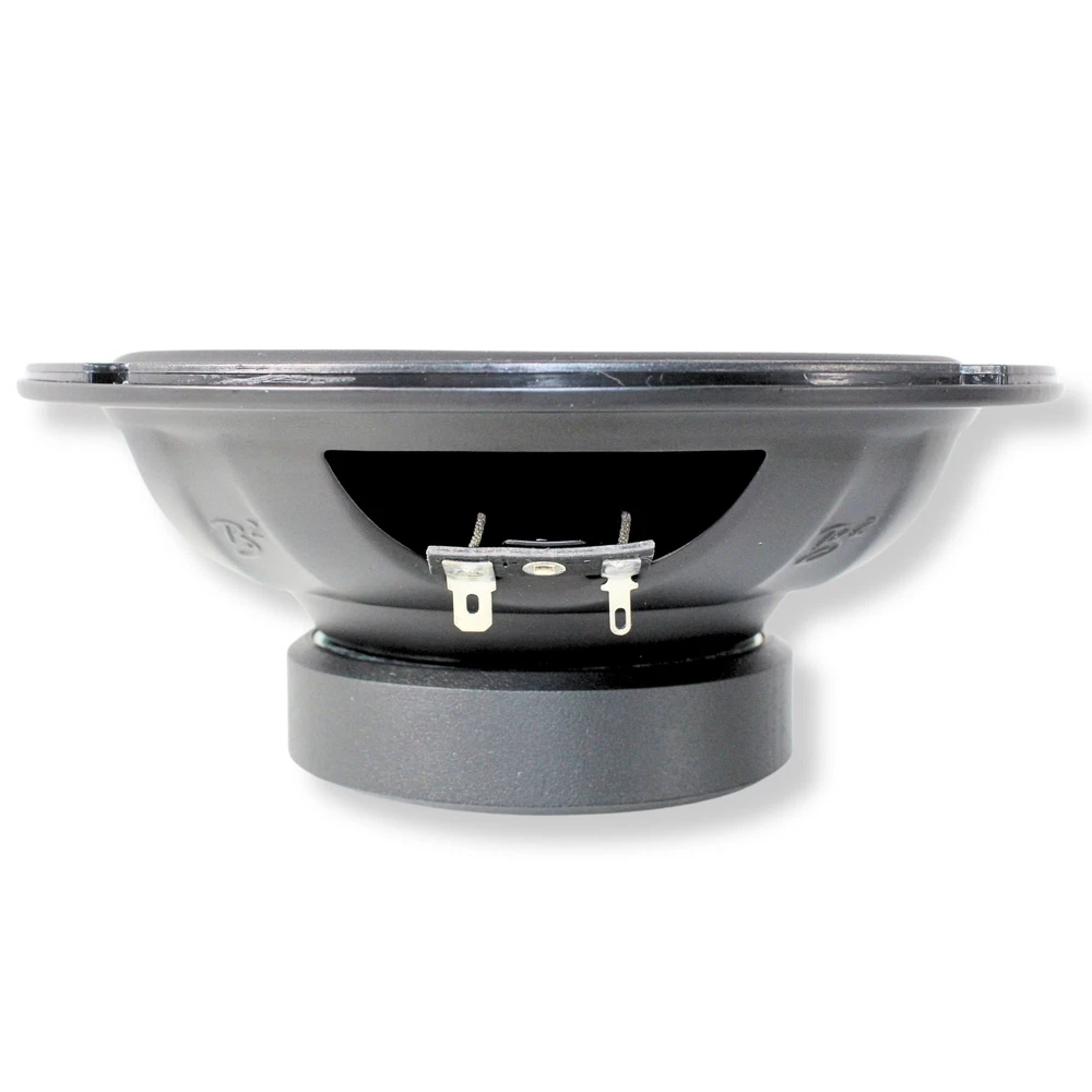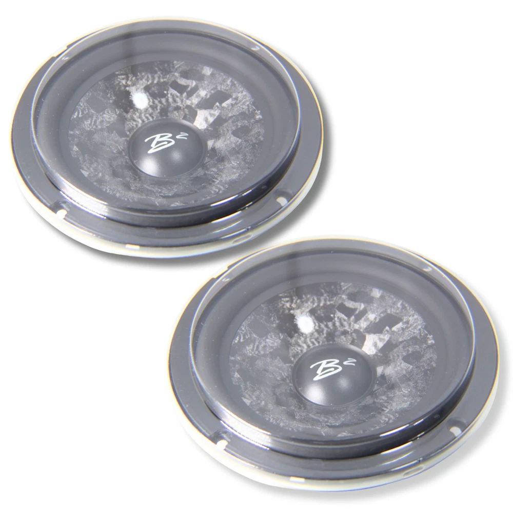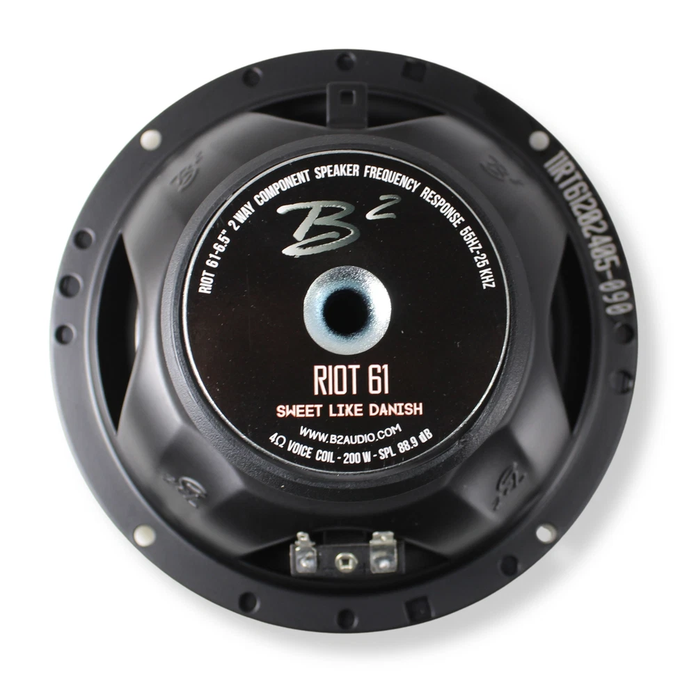 B2 Audio RIOT 6.5" 2-Way 4-Ohm Component Set With 1" Tweeter & Crossover RIOT61 B2 Audio RIOT 6.5" 2-Way 4-Ohm Component Set With 1" Tweeter & Crossover RIOT61 This Listing Includes: (2) 6.5" 100W RMS Midrange Speakers (2) Silk Dome 10W RMS Tweeters (2) Crossovers (2) Grilles for the 6.5" Speakers Rev up your car's audio with the RIOT61 6.5" Component Speaker Kit. Engineered for raw power and performance, it features aggressive 12 dB/octave crossovers with tweeter attenuation set at 3.5 KHz for precision. Silk dome tweeters deliver clear highs, while coated paper cone midwoofers provide a fuller sound. With easy installation and specs that scream dominance, including wide frequency response and high sensitivity, the RIOT61 ensures an immersive driving experience. Midrange Specifications: Nominal Chassis Diameter: 6.5" RMS Power Handling: 75W Maximum Power Handling: 200W Nominal Impedance: 4 Ohm Resonance Frequency: 52 Hz Voice Coil Diameter: 1" Winding Material: CCA / Copper Magnet Type : Neo / Ferrite Magnet Weight: 11.7 Oz Cone Material: IMWRP Frequency Response: 60 Hz ~ 23 KHz Sensitivity: 88.9 dB Surround Type: U Shaped Rubber Tweeter Specs: RMS Power Handling: 10W Max Power Handling: 25W Nominal Impedance: 4 Ohm Voice Coil Diameter: 1" Sensitivity: 94 dB Free Air Resonance (Fs): 1.8 KHz Thiele & Small Parameters: Midrange: Free Air Resonance (Fs): 55 Hz Resistance (Re): 3.3 ohm Mechanical Factor (Qms): 5.54 Electrical Factor (Qes): 0.666 Total Factor (Qts): 0.595 Equivalent Volume (Vas): 8.64 L Compliance (Cms): 560 um/N BL Factor (BL): 5.56 T/M Moving Mass (Mms): 18.89 g XMAX: 6.5 mm SD: 128.68 cm^2 Efficiency: 0.241 Percent Le (1 KHz): 0.479 mH EBP: 82.58 Measurements Midrange: Overall Diameter: 6.53" / 166mm Baffle Cutout Diameter: 5.59 in / 142 mm Net Weight (1 pc): 0.96 kgs Shipping Weight (sets): 2.51 kgs Shipping Box (set): 385 x 195 x 100 mm Mounting Diameter: 5.66" / 144mm Front Mount Baffle Cutout: 5.55 / 141mm Overall Depth: 2.59 / 65.9mm Mounting Depth: 2.40" / 61mm Sold as: (Pair) Tweeter: Overall Diameter: 1.96" / 50mm Overall Depth: 1.00" / 25.6mm Mounting Depth: 0.63" / 16mm Product Details Brand B2 Audio Color Black Size 6.5 Manufacturer B2 Audio Product Type Component Set Mpn B2-RIOT61-V2 Design: 6.5" 2-way component speaker system with a silk dome tweeter and coated paper cone midwoofers for powerful bass and clear highs. Midrange Power Handling: 75W RMS with a maximum power handling of 200W, ensuring clean and impactful sound. Tweeter Power Handling: 10W RMS with a maximum power handling of 25W, providing crisp and detailed high frequencies. Sensitivity: Midrange sensitivity of 88.9 dB and tweeter sensitivity of 94 dB for high output with minimal distortion. - Powered by