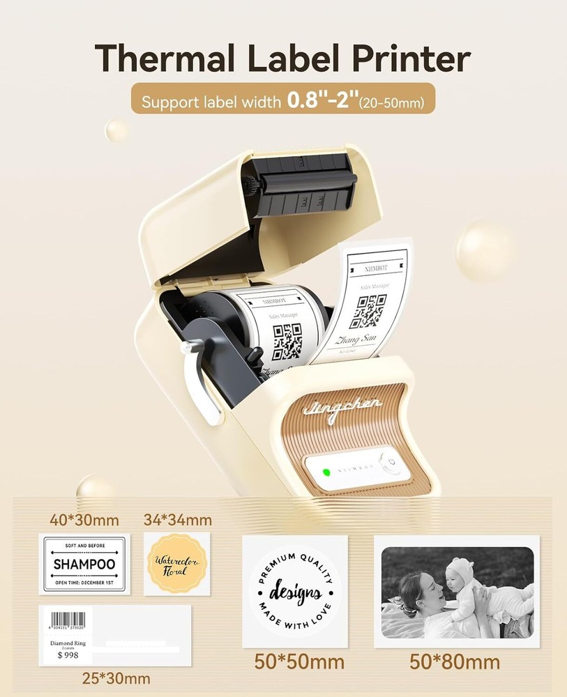 About this item The label maker machine supports 0.8''-2'' width labels. It is perfect for small businesses such as clothing, crafts, retail, jewelry, and more. Ideal for labeling addresses, barcodes, transportation, prices, dates, food ingredients, and party gifts. Suitable for a variety of labeling needs including Christmas, Halloween, Thanksgiving, Father’s Day, and Mother’s Day. This label maker with thermal tape brings great convenience to work and daily life. Enhanced Image Quality The upgraded app delivers precise image analysis for high-resolution and clearer output. Elevate the professional appearance of your labels with improved clarity and formality. It supports image recognition, Excel batch printing, scan and identify 1D/2D codes, allowing direct conversion of text in photos into editable text with the label printer. Save Money With thermal printing technology, simply replace the label paper when used up—no need for ink, toner, or carbon tape. One battery charge supports up to 4 hours of continuous use. The label maker automatically shuts down after 15 minutes of inactivity to save power, reducing printing costs by approximately 70%. Easy to Use Connect via Bluetooth to the app to create labels with features such as automatic template matching, image recognition, and batch printing. Includes over 20 fonts and 1000+ image materials. Content and label positioning can be adjusted to create customized labels that meet all your needs. Dimensions: 5"D x 2"W x 3"H