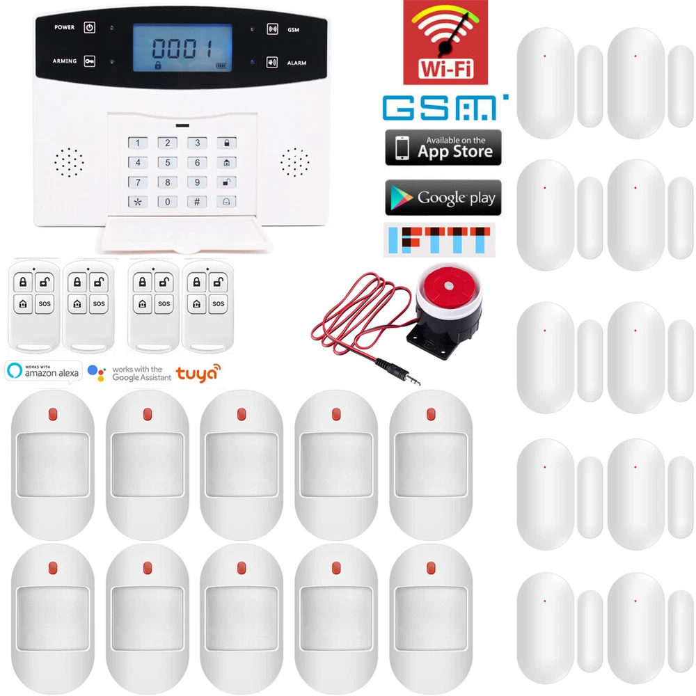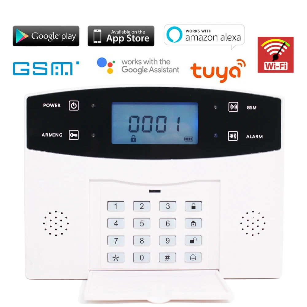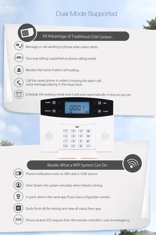 1. Compatible with Alexa and Google home: This alarm sysetm works with Amazon Alexa and Google Home for voice control ( Alexa and google home devices not included ). Just ask app Alexa on your phone to Arm / Disarm/ the whole system in a specific instruction. Remote control your Alarm system anywhere in the world with your smart cell phone, no need repeated operation! 2. WiFi & GSM Support and Auto Dialer Function: This alarm system support different alarm message info(APP Message Push / SMS Message / Voice monitoring / Sim card phone call).Wifi way. It will push alarm notification via free app when it is triggered. GSM Way: Insert 2G SIM card into the alarm system and save your phone number on it, then it will send message or call your cell phone when alarm alerts. WiFi+GSM Tuya Home Alarm System Description Payment Shipping Return Policy Feedback Contact Us Description Package Including: Home Alarm System Main Panel (99 Wireless Zone+8 wired zone)* 1 Pcs (Support Connect Amazon Alexa, Google Assistant, IFTTT, etc) Built-in Antenna Wireless PIR Infrared Detector * 10 Pcs Built-in Antenna Wireless Door / Windows Sensor * 10 Pcs Built-in Antenna Remote Control Key * 4 Pcs Wired Siren * 1 Pcs(110dB) Built-in Siren * 1 Pcs(85dB, the siren is built-in main panel) AC Adapter * 1 Pcs English User Manuel * 1 Pcs (NOT Including GSM Sim Card) Frequently Qustion & Answer: Q: Can this alarm system work with Amazon Alexa or Google Home? A: Compatible with Alexa and Google home: This alarm sysetm works with Amazon Alexa and Google Home for voice control ( Alexa and google home devices not included ). Just ask app Alexa on your phone to Arm / Disarm/ the whole system in a specific instruction like "Alexa, please arm the alarm system". Remote control your Alarm system anywhere in the world with your smart cell phone, no need repeated operation! Q: Can this alarm system work with WIFI and GSM Sim Card together? So if the WIFI failure, can switch GSM mode to work. A:Yes. User can connect alarm system with WIFI and GSM Sim Card to work. And when Alarm System be triggered, it will push alarm message to the APP via WIFI. And if the WIFI failure, will change GSM mode auto Dial Out. Q: It just with WIFI in my house and without GSM Sim Card,can I use this alarm system? A: Yes. Alarm System can work in WIFI mode only. The alarm system only support 2.4G WiFi, NOT support 5G WiFi. Q: Can I add additional remote controllers, door sensors, pir sensors, smoke detectors, gas detectors or other sensors to work with this alarm system? A: Yes. Alarm system can work up to 99 wireless sensors(wireless freq 433MHz) and wireless Siren, unlimited Wifi Camera. Q: Does the alarm panel with backup battery? A: Yes. Alarm system with internal rechargeable backup battery. It can support work when AC Adapt is cut. Main Function And Feature: 1. 2.4 inch TFT display screen, concise user interface and menu hint design 2. Main interface status bar, date/clock indication, fairly obvious alarm host status. 3. Built-in powerful performance CPU master based on 32-bit Cortex-M3 core 4. Based on u cos C III operating system with multitasking design, great user operation experience 5. WiFi/GSM intranet alarm system, support different alarm channels, like APP push/SMS/voice monitoring/intranet center etc. to ensure the alarm performance stable and reliable 6. Support SMS arm/disarm and voice arm/disarm 7. Support up to 99 learning/storage location for remote control and wireless detector 8. Support many defense zones, such as gate, SOS, bedroom, window, balcony, perimeter, smoke, gas, carbon monoxide, water leaking, etc. 9. Support the main power malfunction, backup power shortage, tamper alarm and other extended alarm. 10 .Support entry/exit zone, indoor zone, perimeter zone, 24-hour zone, etc 11. Up to 5 groups preset alarm phone numbers, SMS on/off and dial on/off can be set respectively 12. Support external wireless siren, Support timing arm and disarm 13. Can store and inquire daily operation records and alarm records. 14. GSM network clock synchronization, to ensure accurate color, and support country time zone setting. 15. Support multi-language menu display, voice prompts and alarm SMS setting. 16. Can record 20 seconds voice message and alarm voice. 17. Telephone function, support 5 groups re-dial number. 18. User-friendly APP operation experience and user interface. Push Arm/disarm message to app. 19. Support APP remote arm/disarm, parameter setting and accessory management. 20. Online GPRS to obtain equipment status, automatic alarm when offline. 21. Reserved remote GPRS TCP / UDP protocol channel, compatible with multiple alarm center networking protocol to facilitate network alarm. How to install door sensor and motion detector: 1. Door sensor: The door/window sensor's main unit and the magnetic strip are respectively installed on the door/window and the door/window frame. Discreetly keep track of your home windows and doors. When a window/door opens, a high-pitched alarm is immediately issued. 2. Motion detector: With 120 wide detection angel and up to 12m detection distance, It has high sensitivity and anti HF interference function, can effectively trigger the alarm, not miss any theft. Meanwhile, with temperature compensation, no error will be issued, effectively avoid the false alarm. Tips: Recommend installation height is 1.8m-2.2m. Shipping 1. TO USA address, the item will be shipped from Warehouse from City of Industry, CA 91746, USA. And will be shipped by UPS express or DHL eCommerce, 2-6 BUSINESS days arrive. 2. TO other address, the item will be shipped by Netherlands Post Air Mail. Payment We accept paypal payment or other payment through ebay. Return Policy 1. Please ask all questions before bidding to avoid getting an item you are not satisfied with. 2. Return item has to be New, Unused, and in its original condition. Item must be returned in it's original and unused condition and Never Mounted. 3. Return is accepted
