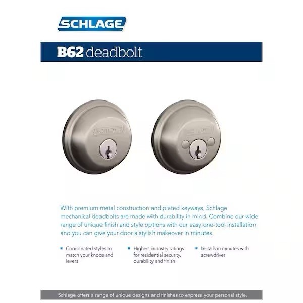 The Schlage Double Cylinder Bright Brass Deadbolt features an all-metal chassis for strength and longevity. This rugged deadbolt is designed for use on exterior doors with gates or glass panes for which additional security is required. This deadbolt fits on metal or wooden doors measuring from 1-3/8 in. to 1-3/4 in. thick. Deadbolt operates with keys on both the exterior and the interior. IDEAL USE: Deadbolt thrown or retracted by key from outside and inside; perfect for use on entry doors often with glass with 2 bore holes as additional layer of security as a key is required to unlock from the inside; includes 2 keys ADVANCED SECURITY: Mount on front and exterior doors where security and strength are needed; includes industry-leading 1" deadbolt with hardened steel spinning pin, anti-drill plates and anti-pick pins to help protect against forced entry CERTIFIED HIGHEST SECURITY: Premium metal construction and quality craftsmanship for everyday strength and peace of mind; Grade 1/AAA certified BHMA rating for Security, Durability and Finish EASY INSTALLATION: Self-aligning screw holes make installation easy; everything included to upgrade double bore hole doors such as exterior doors with keyed security; fits both right and left handed doors; easy to install in minutes with a screwdriver HASSLE-FREE FIT: Universal latch slides into place to fit standard doors with 2-3/8" or 2-3/4" backsets, requires no tools; fits doors 1-3/8" to 1-7/8" thick; integrated strike reinforcer with 3" screws to help protect against kick-in attacks TRUSTED WARRANTY: Schlage locks are backed by a limited lifetime mechanical and finish warranty; see Schlage warranty for full details Click here to shop all Schlage products Click here for more Schlage Door Hardware products Return Policy Product Information Internet # 318711258 Model # B62.N.G.505.605 Store SKU # 1006964940 144469331