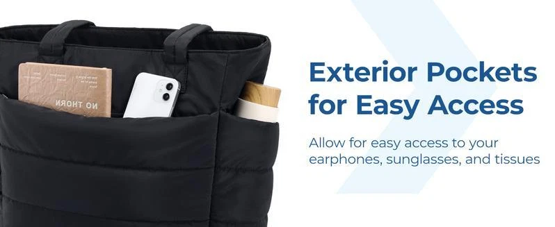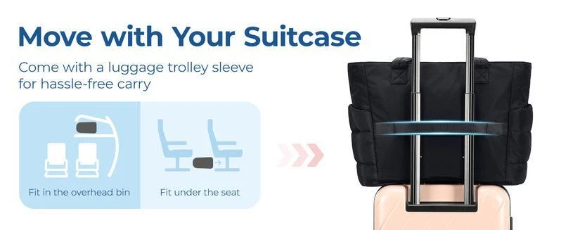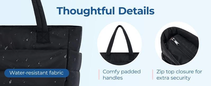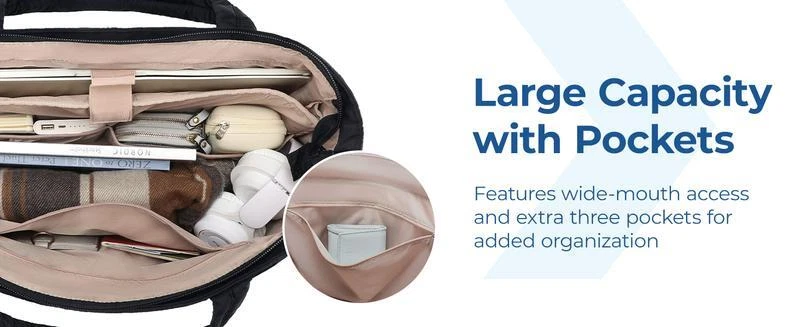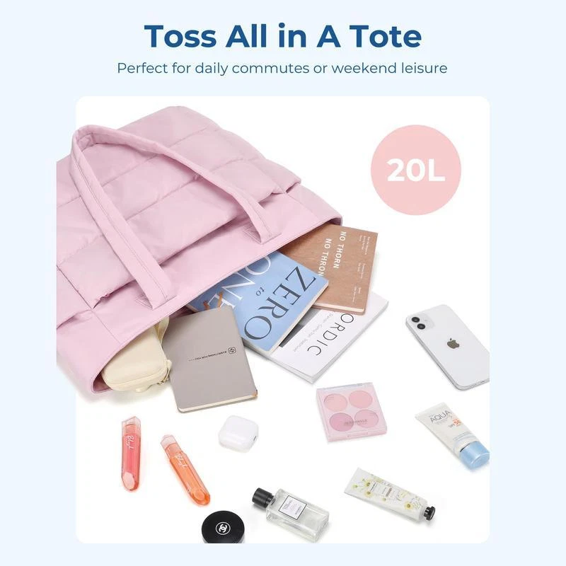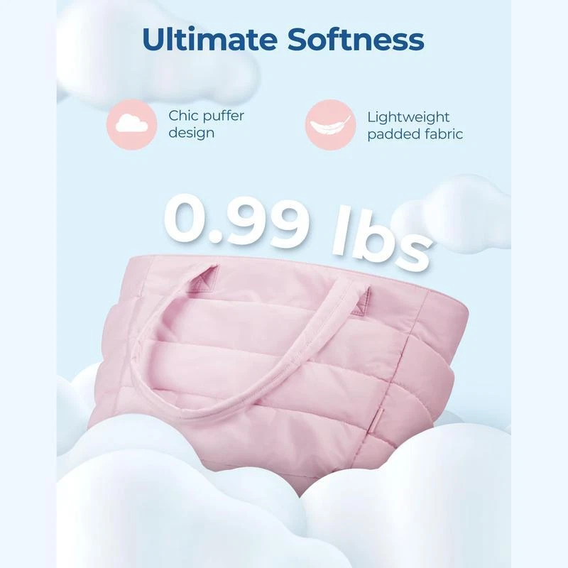 Puffer Tote Bag Compact Size: Size: 19.3'' x 6.3'x 13.8'', Capacity 20L. The quilted tote bag suitable daily necessities such as 15.6'' laptops, Umbrella, water cup, power banks, clothes, shoes, etc. The zipper closure design ensures the safety. Multi-pocket: The women tote bag feasures many separate pockets. 1 multiple layer main compartment can easily hold 15.6'' laptop computer, A4 folder, clothes, etc. 2 side widen pocket + 1 front pocket allow you quick access the items you need. Ultra Lightweight Material : Weighs only 0.99 pounds. Made of durable, soft and light taslan fabric. The puffer tote bag is easy to carry. Good choice of travel bag.