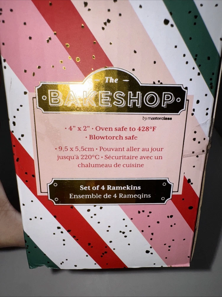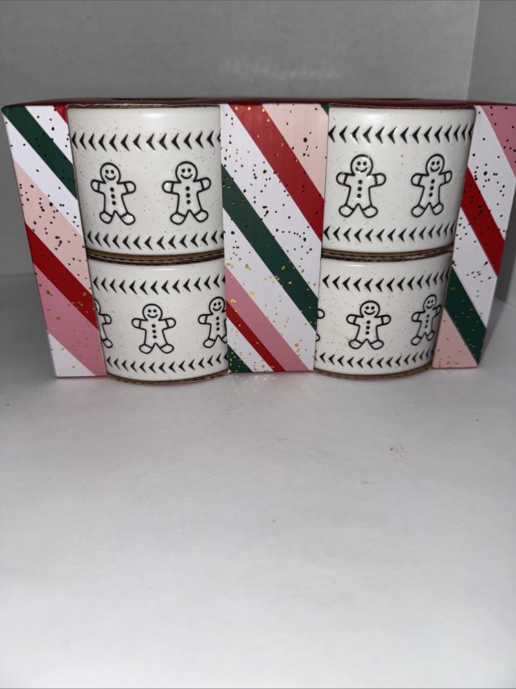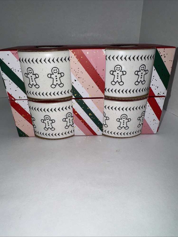 Set of 4 Bakeshop Gingerbread Man Ceramic Ramekins, perfect for the Christmas season. These white ramekins feature a cute gingerbread man pattern and are made of sturdy stoneware material. Each ramekin measures 4 inches in width and 2 inches in height, making them perfect for serving desserts or appetizers to your guests. Comes in a box of 4, making it easy to store and display. Great addition to any kitchen or dining room collection.