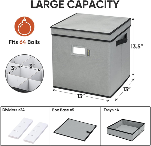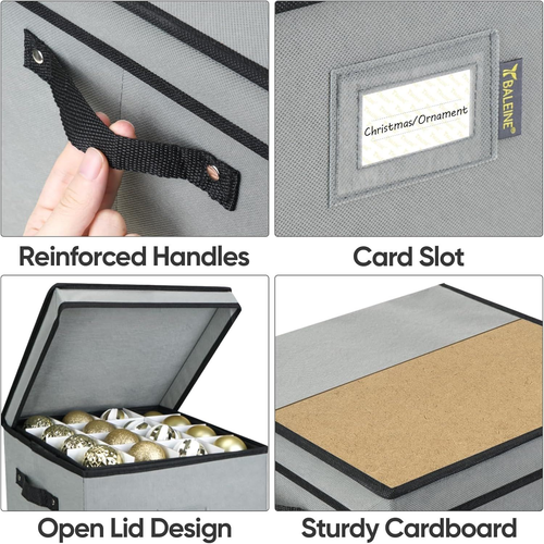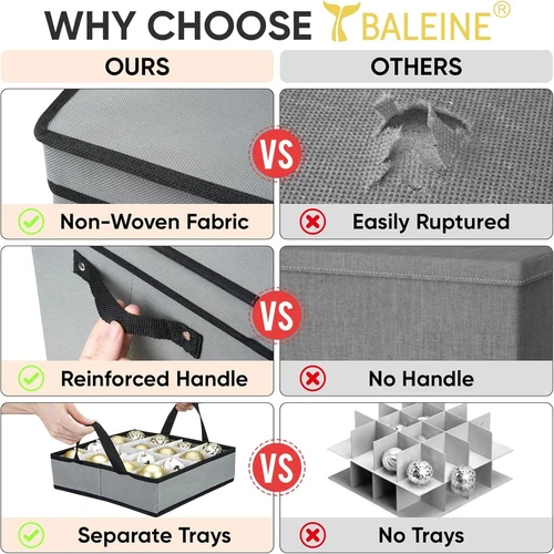 BALEINE Christmas Ornament Storage Box with Dividers, Premium Holiday Ornaments Storage Container Bin for Xmas Decorations (64 Ball, Grey) LuxeFusion Product Description Features [STURDY CONSTRUCTION] This Christmas ornament storage box is reinforced with durable hard cardboard, with a breathable non-woven fabric outer layer to protect your Christmas jewelry from dust. The lid prevents dust, dirt, and light damage to the decorations, keeping them looking new every season. [LARGE CAPACITY] Christmas storage containers are available in two sizes 13.5''x12.5''x13'' and 26''x12.5''x13.5'', which can hold 64 and 128 Christmas ornaments respectively. There's a clear card slot on the outside for easy identification and organization, and the box can be folded flat easily when not in use. [WELL ORGANIZED] Our Christmas ornament organizer comes with cardboard dividers to individually organize your decorations and prevent them from bumping into each other or getting damaged. Each compartment measures 3 inches for accommodating most sizes of Christmas balls. By removing the inserts, you can also store larger Christmas ornaments. [DURABLE HANDLES] Reinforced seams and sturdy side handles allow you to move the Christmas ornament storage bin anywhere without any worries. Additionally, the interior trays also feature handle loops that are convenient for lifting and handling, ensuring ease of use and efficient storage. Product Details Brand: BALEINE Color: Grey Material: Polyester Style: Modern Product Dimensions: 12.91"L x 12.91"W x 13.5"H Capacity: 64 Liters Closure Type: Lift-Off Lid Water Resistance Level: Not Water Resistant Item Weight: 2 Pounds Opening Mechanism: Lift-Off Lid Shape: Rectangular Number of Items: 1 Storage Volume: 64 Liters Number of Compartments: 64 Unit Count: 1.0 Count Item Package Quantity: 1 Manufacturer: BALEINE Item Weight: 2 pounds Size: 64 Balls / Tray Number Of Pieces: 1 Batteries Included?: No Batteries Required?: No Brand: BALEINE Color: Grey Material: Polyester Style: Modern Product Dimensions: 12.91"L x 12.91"W x 13.5"H 🚚 Free Shipping All orders ship free and fast to your doorstep. 🔁 Easy Returns Satisfaction guaranteed. 30-day returns, no questions asked. 💬 24/7 Support Contact us anytime; we’re here to help, day or night. Brought to you by LuxeFusion – Quality you can trust.