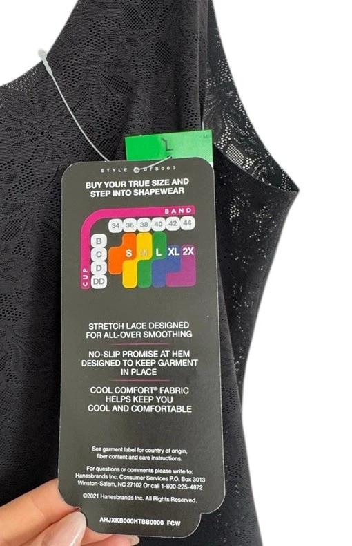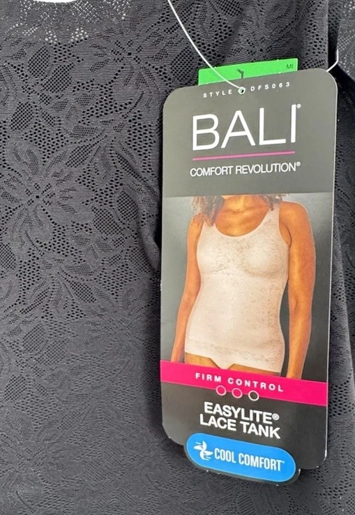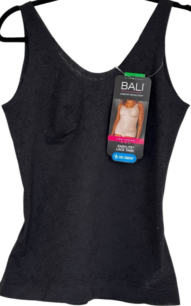 BALI Comfort Revolution FIRM Control Black Shapewear Lace Tank Top Womens Size L New With Tags! Women’s Size Available: LARGE Body: 56% Nylon 44% Spandex Inserts: 83% Spandex 17% Nylon Style: DFS063 Color: Black Retail Price: $49.00+ Tax Hand Wash Only Imported