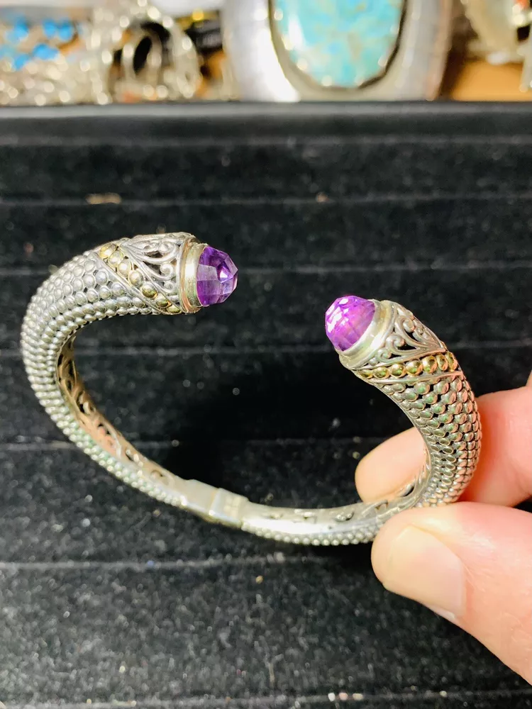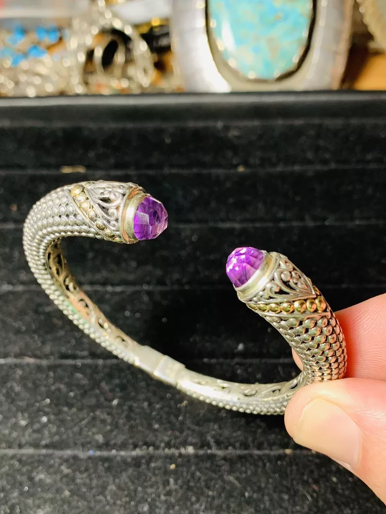 Bali Indonesia Robert Manse sterling silver and solid 18K accent bead faceted amethyst hinged bangle bracelet weighing 22.8 grams and remaining in very good pre-owned condition Shipping is $5.99 via Ground Advantage Please don’t hesitate to reach out with any questions or concerns you may have, and buy with confidence. I have perfect feedback as a seller with over 1500 completed sales Thank you very much for your interest, and best of luck!