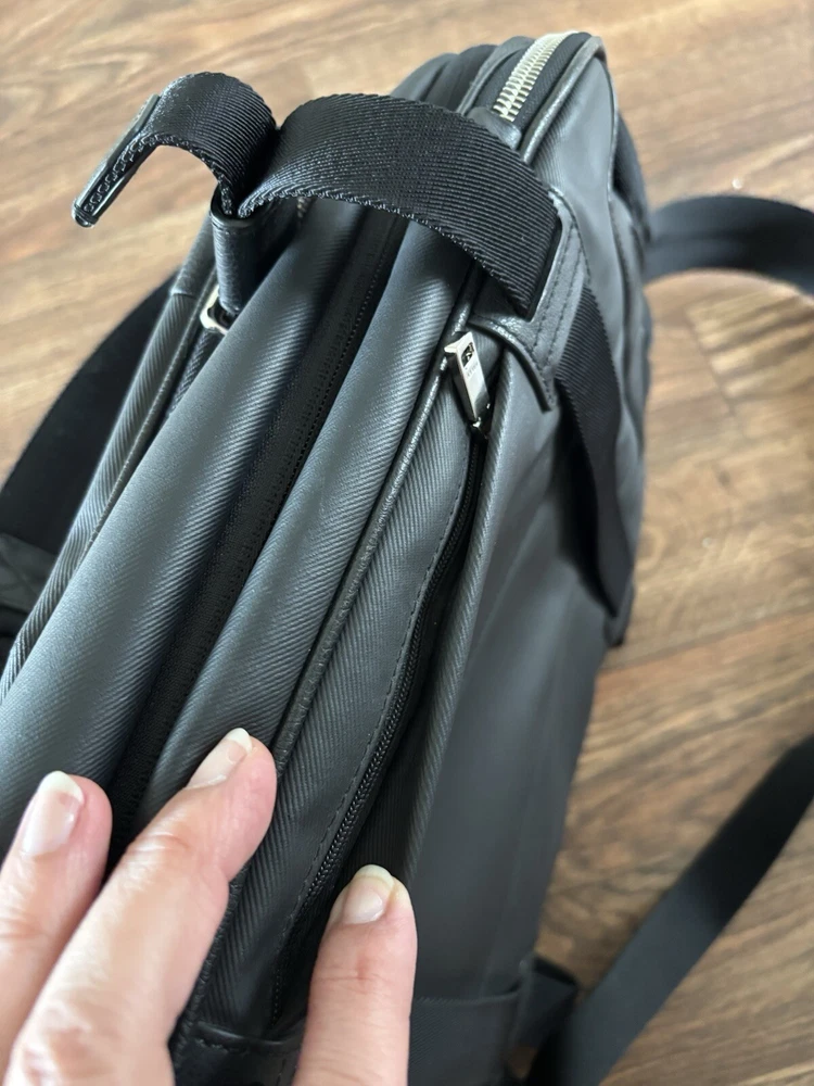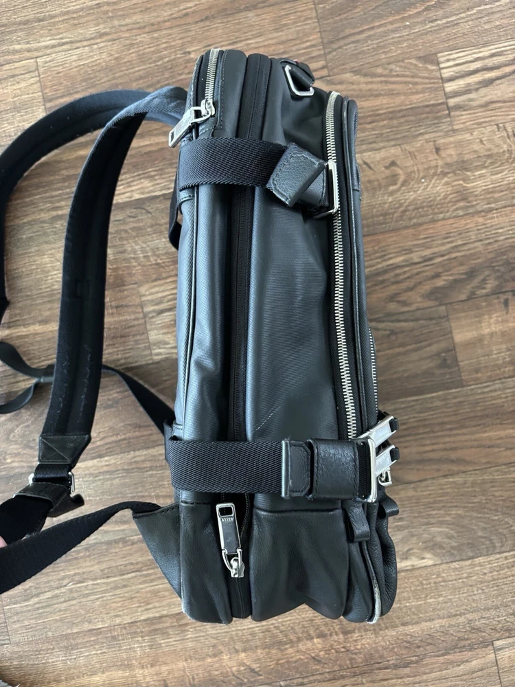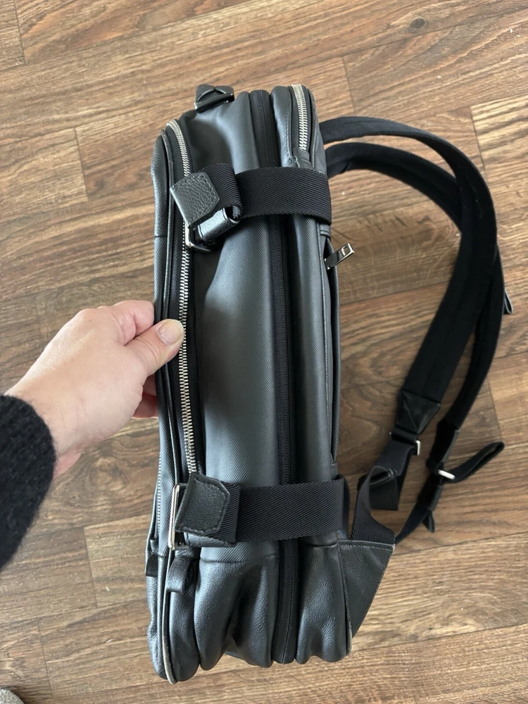 Product Details Part of Bally's Vogel business travel collection, this Veltan backpack is crafted from scratch and water-resistant coated cotton canvas and leather. It features adjustable shoulder straps, multiple internal zipped compartments for your office essentials, a rear zipped pocket for easy access to travel essentials, side straps and a D-ring for additional accessories, as well as a laptop pocket. SKU: 6227992-BLACK Black Fabric Made in: Italy Dimensions: 30cm x 42cm x 16cm Pre owned condition, minimal signs of wear Super clean interior