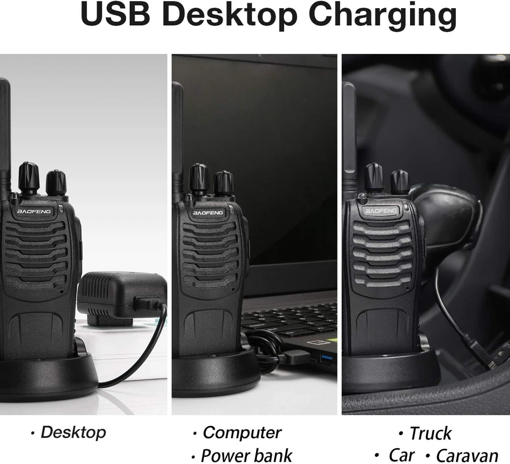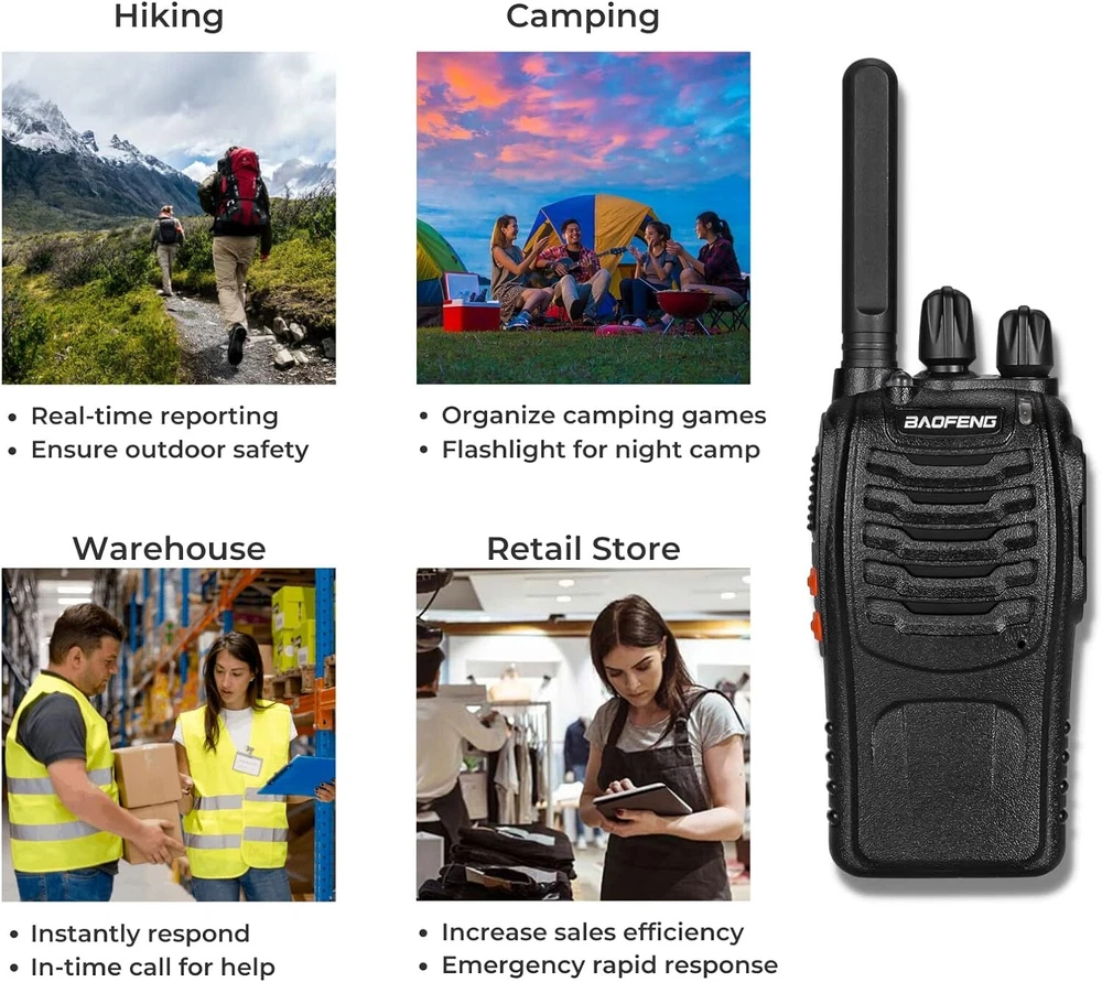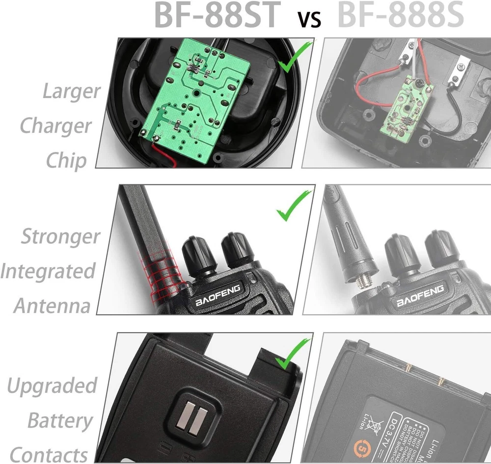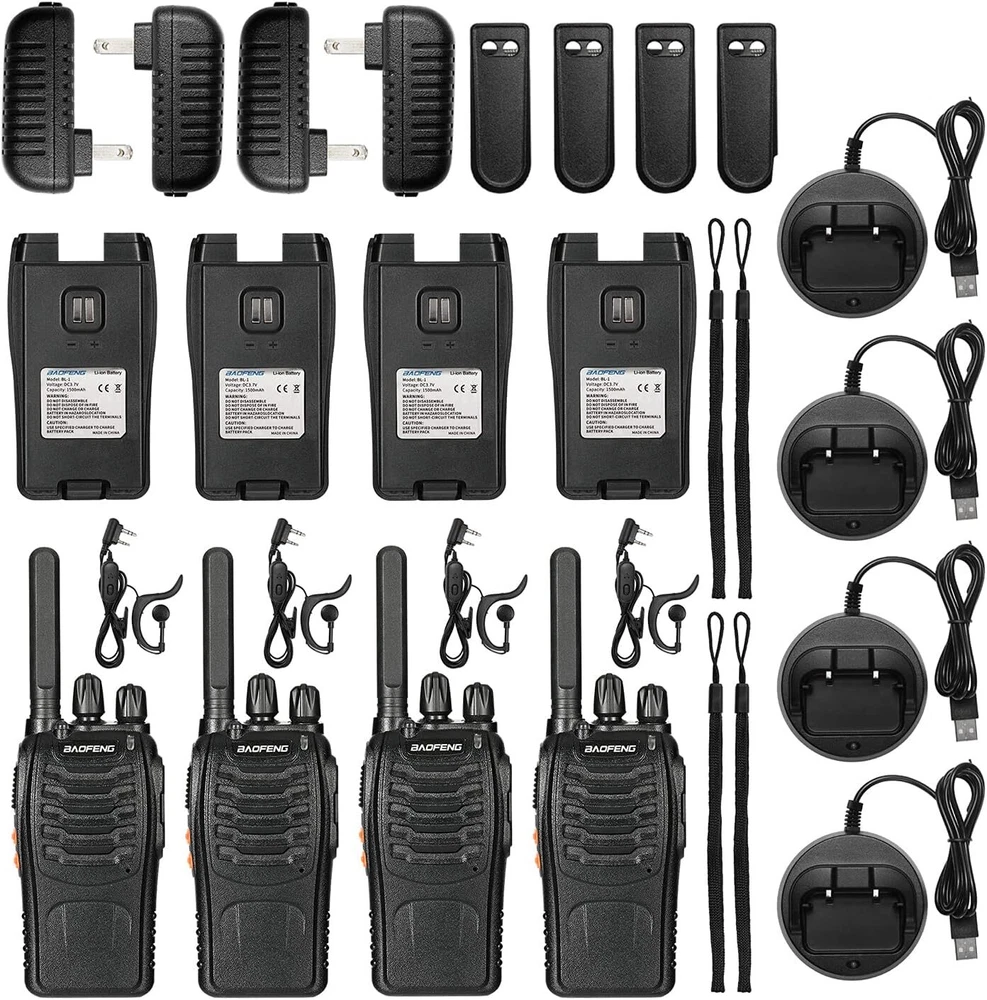 About this item 🔥[Upgrade Version] The Baofeng walkie talkies 4 pack is a license-free radio which you can use right out of the box. Portable and convenient size, easy to operate with 16 FRS pre-programmed CH. FCC part95 certified: 2AJGM-BF88ST. 🔥[What’s Better] Comes with an upgraded antenna, charger chip, and battery contact. Baofeng radio walkie talkie provide higher safety and operational performance. Such as better talking range, shorter charging time, and longer service life. 🔥[More Stable & Long Range] The antenna is non-removable of the walkie talkies long range. The integrated units would be effectively protected by the sturdy shell. Up to 3 miles talking range, good for freeway road trips and camping. 🔥[Shorter & Easier USB Charging] Baofeng BF-88ST FRS radio can be fully charged in only 3h -- 60 whole minutes. Faster than any other walkie talkies for kids with an upgraded charger chip. USB cable supports many charging methods. 🔥[Hands-Free & Rich Functions] VOX function allows real hands-free operation for the walkie talkies rechargeable. You can activate the function using earpieces when walking or driving. More functions like monitoring, scan, TOT, and LED torch. Supports CHIRP. Faster Charge Better Charger Chip Provides higher protection, extends battery life, and reduces battery charging time. More Safe Upgraded Battery Contacts Battery failure rate reduced. Newer contacts make the battery more durable and steady. More Stable New Integrated Antenna Talking range extended. Antenna is protected in a sealed shell, making it shorter but more durable. About CTCSS/DCS How to protect kids from unwanted signals? You can set up different QT/DQT(CTCSS/DCS) via programming software. Same QT/DQT, same frequency. What's in the box? 4 x BF-88ST Walkie talkie 4 x Rechargeable 1500mAh Li-ion battery 4 x USB Desktop Charger 4 x USB Adapter 4 x Belt Clip 4 x Hand Strap 4 x Earpiece 1 x English User Manual On Jun 13, 2024 at 14:44:51 PDT, seller added the following information:
