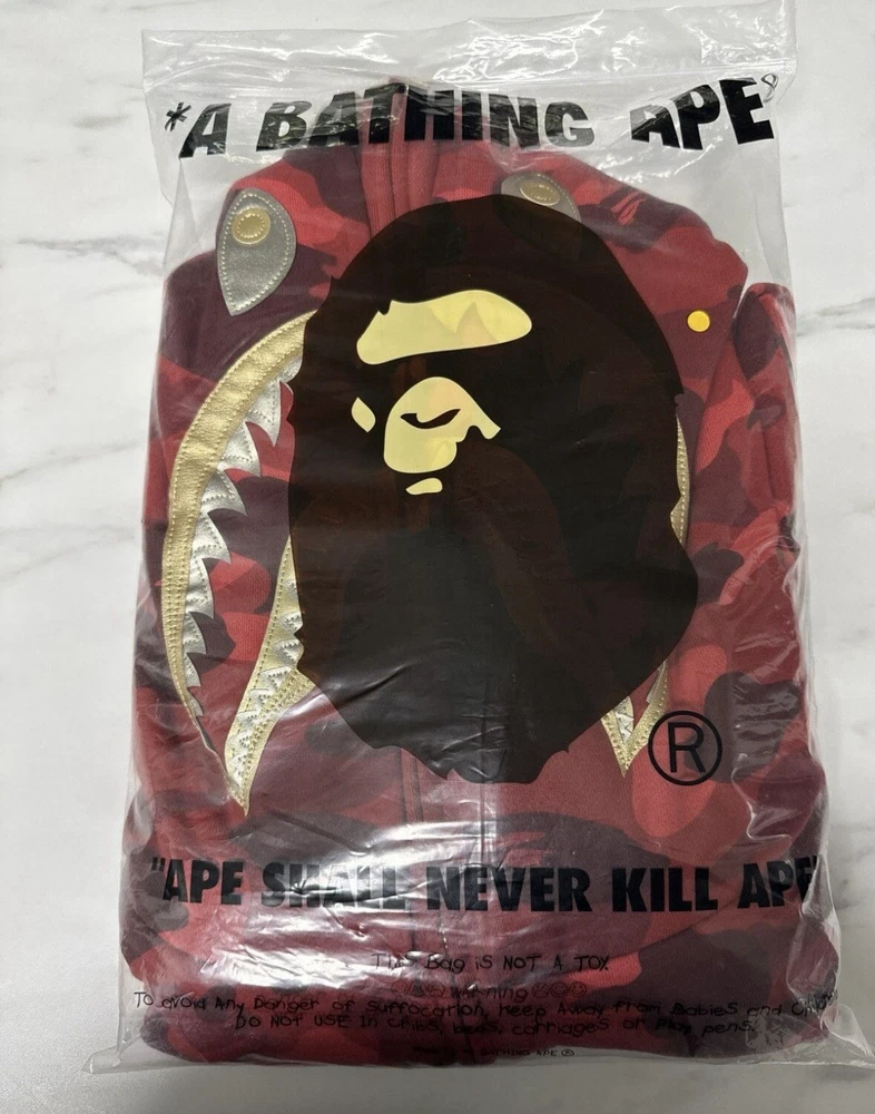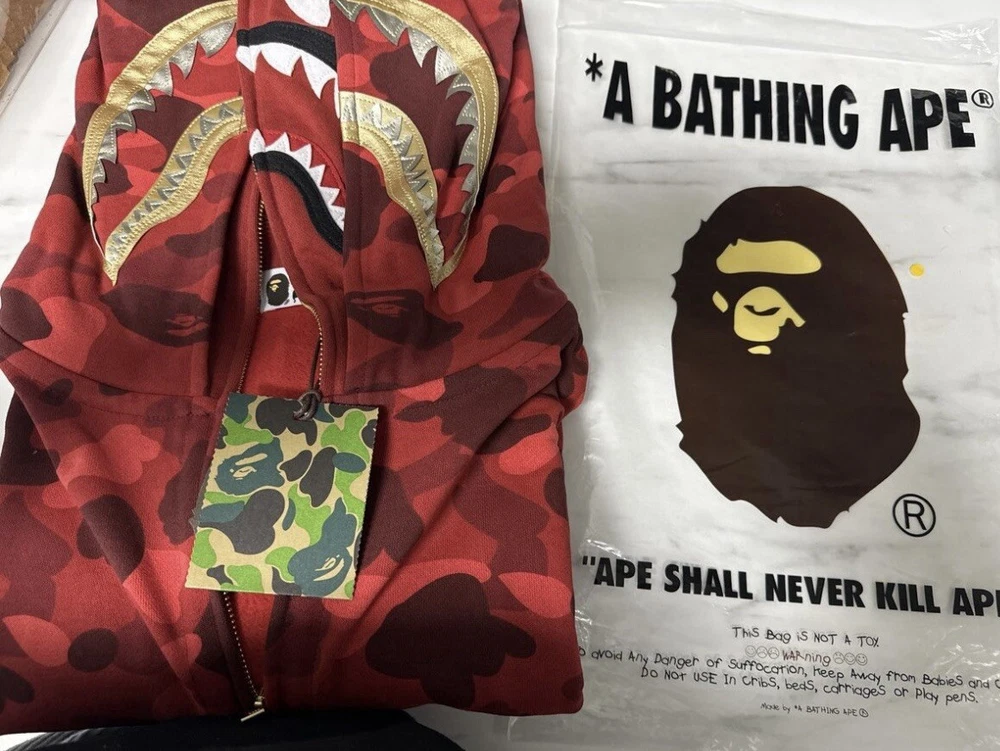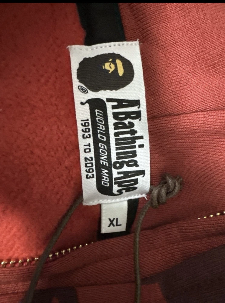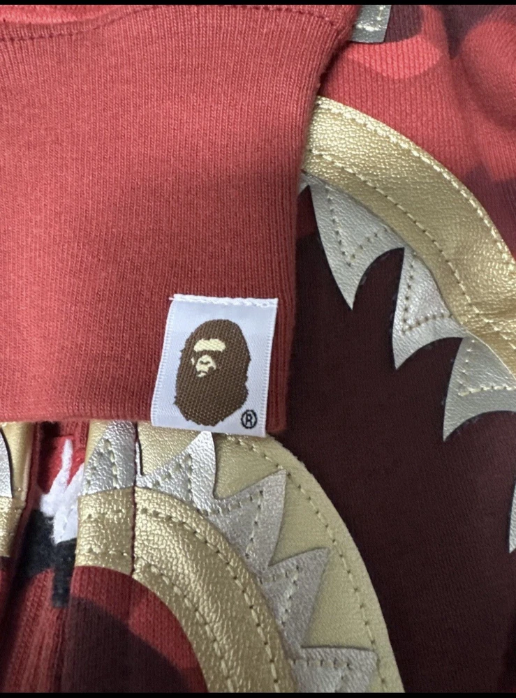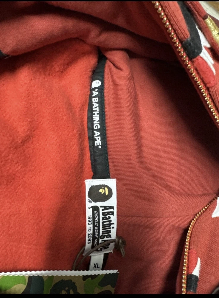 This BAPE Color Camo Double Shark Full Zip Hoodie in 'Red' is a designer streetwear piece for men. Made with high-quality cotton fleece material, it features a full zip closure, hooded design, and pockets for convenience. The hoodie is accented with a zipper, embroidered logo, and is a part of the Bape product line. It is available in XL size and has a regular fit. The hoodie is perfect for those who love colorful and unique designer pieces. It is made in Japan and is a great addition to any streetwear collection.