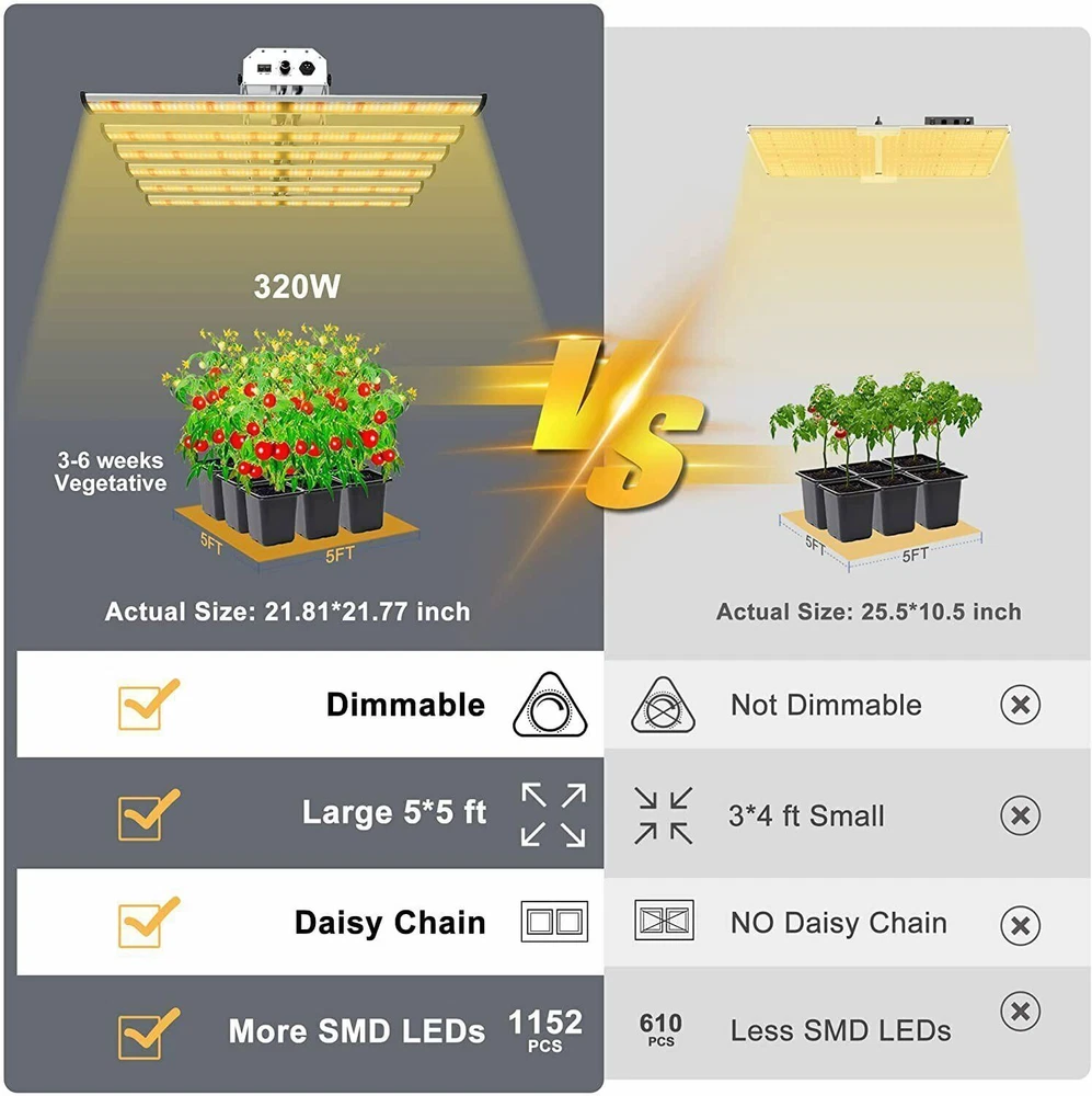 Likesuns Double Switch LED Grow Light Specifications: Power Actual consumption:320W±5% -Shell Material:Aluminum UV and Fire Protection -Warerproof Rate : IP65 -Power input:110-240V/AC,277V/AC,347-480V/AC,50/60Hz -Coverage Area :5X5FT VEG, 4X4FT BLOOM - Distance from the plants: ≤ 0,6 m (24") -Warranty :3 years -Light Distribution :120° -Thermal Management ;Passive -Dimming: 0-10V/PMW Indoor use only, not waterproof. Consumes less energy. Full spectrum gives plants everything they need in natural sunlight. Makes multiple harvests in one season possible. Extremely bright, avoid looking directly at the light, it's recommended to wear glasses when using. BAR-4000W Spider LED Grow Light 4x4ft Full Spectrum for Indoor Plant Hydroponics INCREASE YIELD AND CROP QUALITY : 2020 Newest SMD LED technology Sunlight Spectrum,uses Samsung 561C , ETL listed certified, actual power 400W, provides PPF output(994μmol/s), make you get 30% higher yield compare old purple led lights, to help you achieve maximum quality and quantity, which is much better than traditional grow systems. FRAME STRUCTURE - The most advanced design to effectively expand the light area. At the same time, the illumination is more uniform. This grow lamp is equipped with optical lenses on the LED beads, which makes the effective PPFD of our plant light improved, and it can also make the light more concentrated. EXCELLENT HEAT DISSIPATION DESIGN - No longer worry about heat dissipation even with high power. We adopt aluminum cooling plate made of advanced small molecular material, plus a small heat sink for each chip to achieve excellent heat dissipation. All of these designs made heat efficient dissipation. No fan, no noise. Dimmable & No fan , No Noise --dimming with different PPFD,Full spectrum LED added 660nm LED, good for all growth stage, especially for flower stage, high yield: >2.7grams per watt . WIDELY USED - This 8-light-bars grow fixture can be used for both hydroponics and indoor plants in soil, such as orchid, papers potatoes, lettuce, chili, tomatoes, aquarium plants like algae that in greenhouse, garden, vertical farm, grow tent or grow room. Even hotel, restaurant, office Dommia grow light can be installed wherever there are plants. BEST SERVICE - Phlizon is a professional LED grow light manufacturer with strong R&D team and many lights products. 24-month warranty and 30-day money-back guarantee. Product Features Phlizon Full Spectrum LED Grow Light bar designed specifically for use as supplemental greenhouse lighting, is a full-cycle top-lighting solution for commercial plants cultivation, with the power to scale from vegetative growth to higher light intensities in bloom. This light is very similar to the much more expensive Fluence SPYDRx, in that they both use Samsung chips and 660nm red light .But Phlizon bar light costs about half as much and gives you more power.Also 3 years warranty. Safety FCC ETL Certified and IP54 Rated.Passive cooling,extrusion pure aluminum can 100% ensure heat dissipation. Plants will grow better under the Full Spectrum LED Grow Lights, as well their yield. will increase hugely. Phlizon LED Plant Grow Light provides supplementation for your plants to grow fast and healthy! Using Samsung LM281b LED's provides an impressive luminous efficacy of 210 lm/W. Light bar reflectors are optimised for 120 degree dispersion providing more than 10% improved efficiency over glass, lens or foil based reflectors. highPAR lights use custom spec aluminium housed drivers with passiveventilation techniques for each individual light bar, this ensures higher energy efficiency (by not using fan forced cooling) without a compromise on reliability.The other advantage of this design is the individual drivers are easily interchangeable should they ever need to be replaced. grow lamp led plant light Package includes: 1 x Led grow light 1 x Power cord 2 x Adjustable rope 2 x Hanging hook kit 1 x User manual Likesuns Double Switch LED Grow Light Specifications: Power Actual consumption:320W±5% -Shell Material:Aluminum UV and Fire Protection -Warerproof Rate : IP65 -Power input:110-240V/AC,277V/AC,347-480V/AC,50/60Hz -Coverage Area :5X5FT VEG, 4X4FT BLOOM - Distance from the plants: ≤ 0,6 m (24") -Warranty :3 years -Light Distribution :120° -Thermal Management ;Passive -Dimming: 0-10V/PMW Indoor use only, not waterproof. Consumes less energy. Full spectrum gives plants everything they need in natural sunlight. Makes multiple harvests in one season possible. Extremely bright, avoid looking directly at the light, it's recommended to wear glasses when using. Advantage: High Efficiency Optimized for PAR, Extremely Sufficient Lights Spectrum, Super Light Penetration Plants grow faster and flower bigger: Enhanced spectral output covering full PAR (400-730nm) promotes photosynthesis for Growth & Bloomming, High Efficiency Powerful LEDs, Low Energy Consumption High performance aluminum alloy light bar, Fast heat dissipation, Uniform illumination , life span up to 50000 hours. Built-in aluminum alloy no stroboscopic power supply driver. Better heat dissipation than plastic power driver Healther than stroboscopics which could cause brain tumor. The product passed EMI verification and high-low temperature test. It has full voltage, high stability, high precision, high transformation efficiency, short circuit protection function. The use of aluminous shell for better heat dispersion and longer life time. 10 years experienced R&D team,rich experience in OEM/ODM. Truly Full Spectrum~Suitable for all Grow Stages from Seeds to Harvest~1w>2.7grams(Max) Powerful Cooling fan system inside, Cool and Quieter Revolutionary Heat Aluminium PCB, Run 80% cooler than high intensity discharge (HID) lights 1pcs Strong Hanging Kits are available for Easy Installation All LEDs with a Zener to ensure One LED Goes Out the Rest Continue to Operate 1:Phlizon newest R&D led grow light bars, built-in aluminum alloy no stroboscopic power supply dr