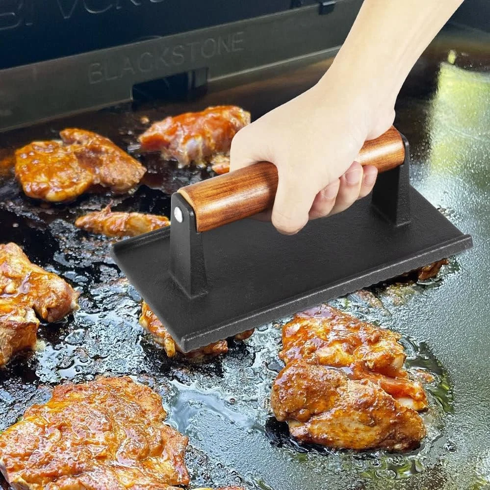 BBQ Melting Dome Basting Cover Grill Press Barbecue Weight Kit for Blackstone Packing include:1*Rectangular Basting Cover and 1* heavy duty cast iron grill press. Rectangular Basting Cover Size: 13 x 9.8 Inch. Heavy duty cast iron grill press size: 8.5 x 4.1 inch This square Rectangular Basting Cover is made from high quality stainless steel, cast iron grill press is made from heavy duty cast iron for a compact and sturdy construction that is built to last, making it ideal for everyday outdoor barbecues and more Heavy-duty cast iron grill press with raised bottom grain to leave attractive grill marks on the grill features a premium wood handle that you can just grip in your hand for use The excellent material makes the grill accessories heat and corrosion resistant and durable. The set is easy to clean, you just need to use soapy water to clean it easily. Reduce the stress of your housework The grill accessory set is perfect for indoor cooking, outdoor grilling, outdoor camping and restaurants. Works with any grill for cooking burgers, meats, buns, fajitas, eggs and more We are always committed to the quality of our products and services, if you have any questions about this, please feel free to cont us, we will provide you with solutions as soon as possible Product Description Rectangular Melting Dome and Grill Press Melting Dome: Measure: 13 x 9.8 inch (L x W) Material: Stainless Steel Grill Press: Measure: 8.5 x 4 inch (L x W) Material: Heavy-duty Cast Iron Feature Heat resistance Sturdy, not easy to deform Keep the flavor Non-stick oil Dishwasher safe Smash Burger Press Rough textured surface helps cook food quickly, add delicious and smoky barbecue flavor in your grills Rectangular Basting Cover Rectangular cheese melting dome is professional indoor and outdoor grill tools Keep the Flavor Perfect for burgers, bacon, beef, flatbreads, sandwiches, quesadillas, paninis, chops and steaks Fit for Blackstone grill accessories Fit for any bbq grills, such as flat top, gas, pellet, teppanyaki Fit for home kitchen, family bbq party, back yard, buffet, restaurant, indoor and outdoor Item model number 13 Inch Basting Cover & Grill Press Closure Type Lid Style Compact Is Microwaveable No Number of Pieces 1 Color silver Product Dimensions 13"L x 9"W Material Stainless Steel, Cast Iron Country of Origin China Is Dishwasher Safe Yes Item Weight 0.71 ounces Shape Rectangular Size 13" x 9" Shipping Fast shipping is very important for us. Our expedited US shipping service is FREE. Your order will be shipped within 2 business days upon full payment received. Your order will be delivered within 2-3 business days after the handling time. Warranty & Returns 30-Day FREE Return Policy offered for unsatisfactory items. Options include: Refund or Exchange for another item. Contact us Customer satisfaction is our top priority. If you encounter any issues with our product, please don't hesitate to reach out to us. We are committed to ensuring your satisfaction and will go above and beyond to assist you. Your happiness is our goal! Thank you for shopping at our store.