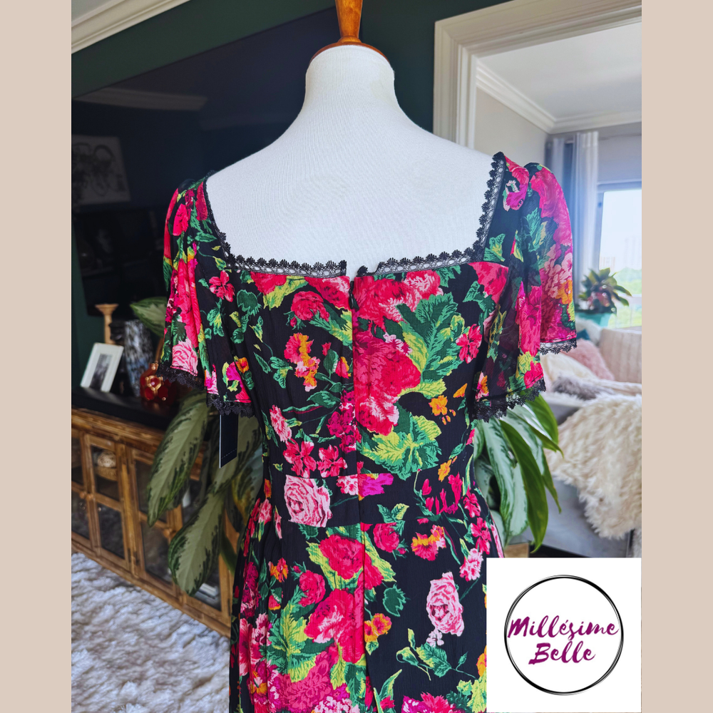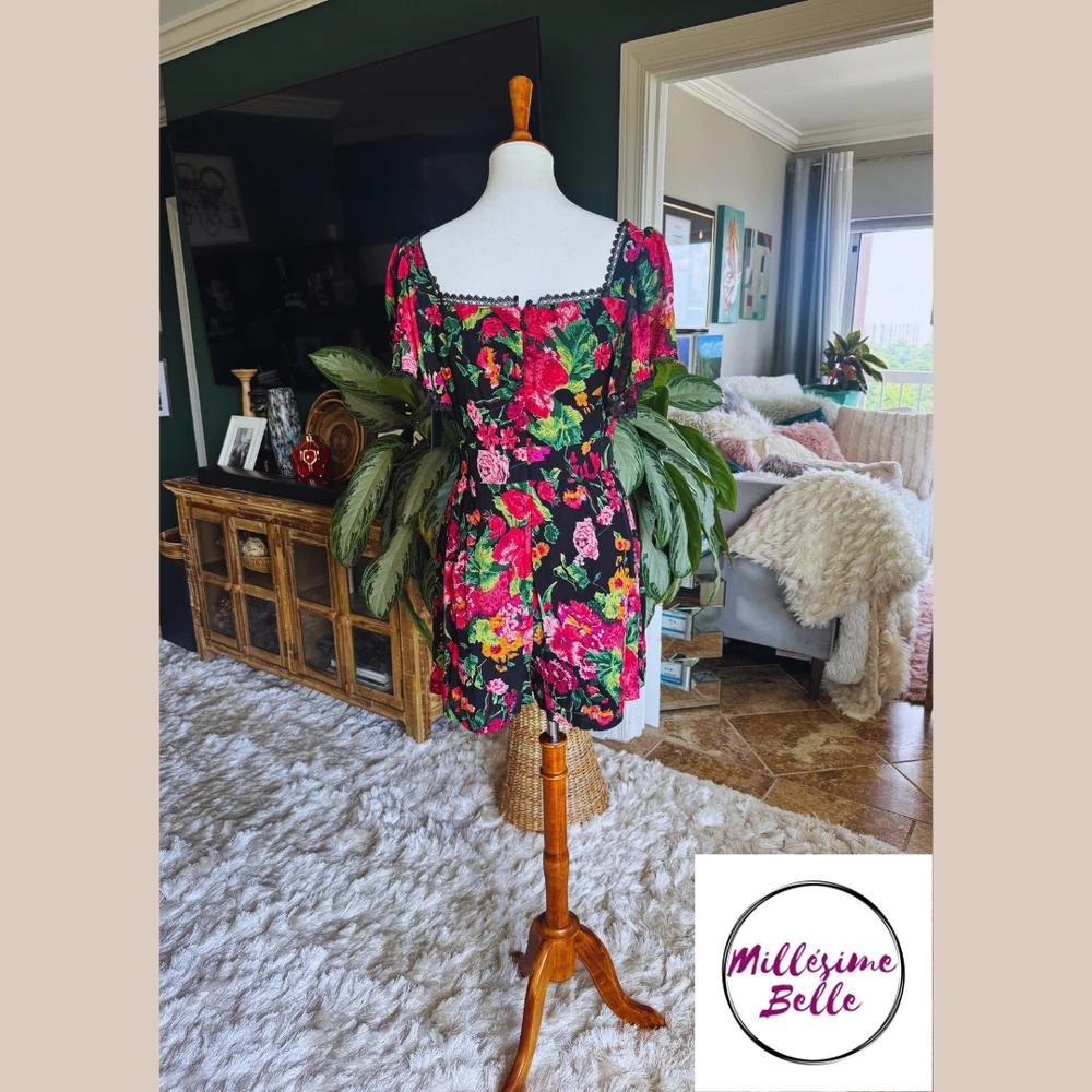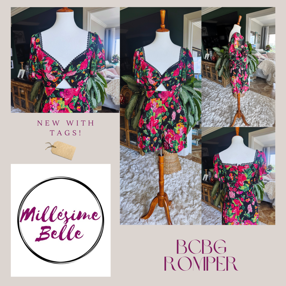 BCBG Max Azria Floral Romper. Multi-color with black, pink, green and yellow flowers. Very elegant and perfect for a summer night out. Pair with strappy black sandals. New with tags on it! Measurements upon request.
