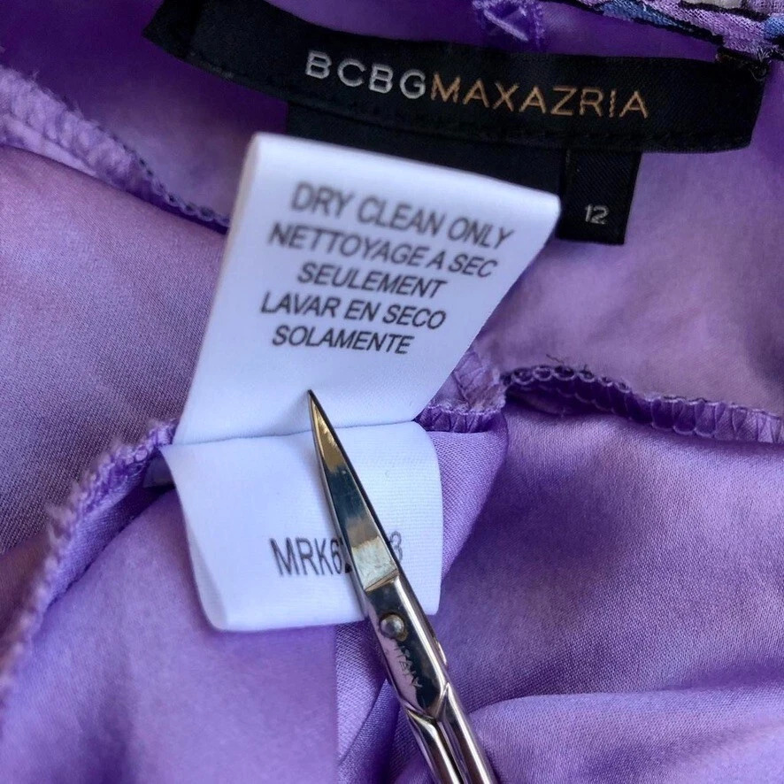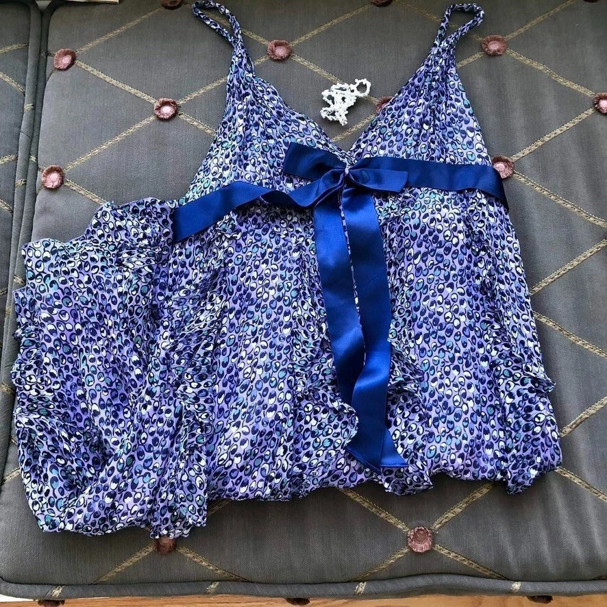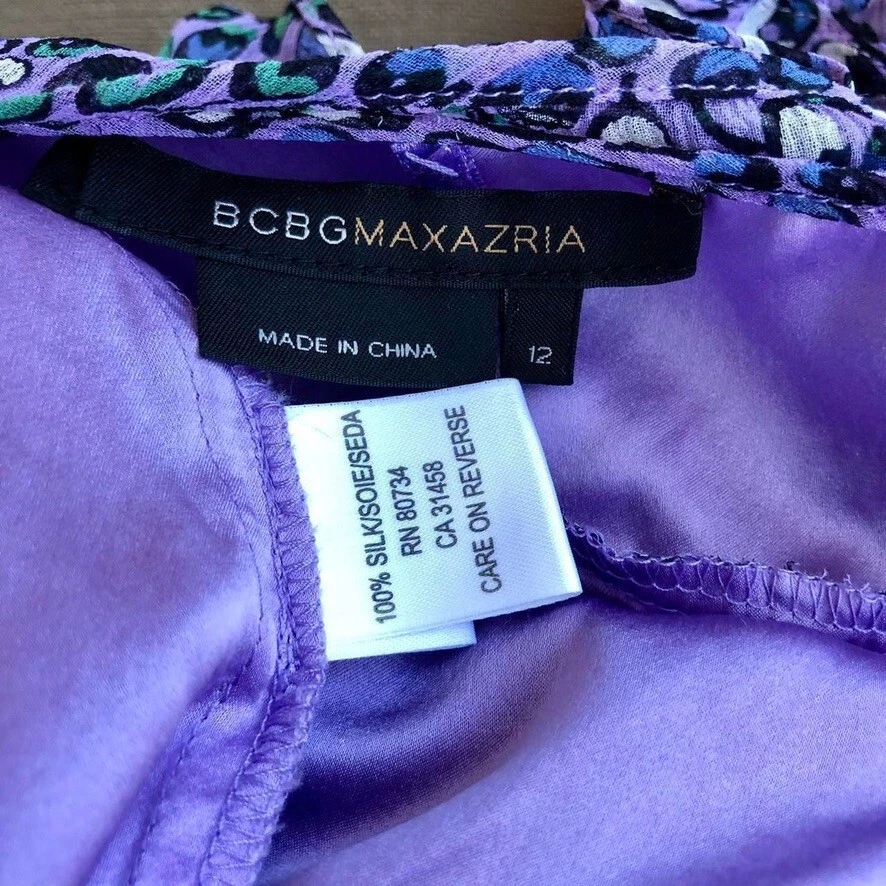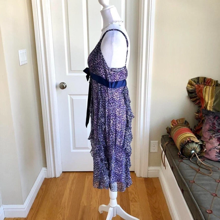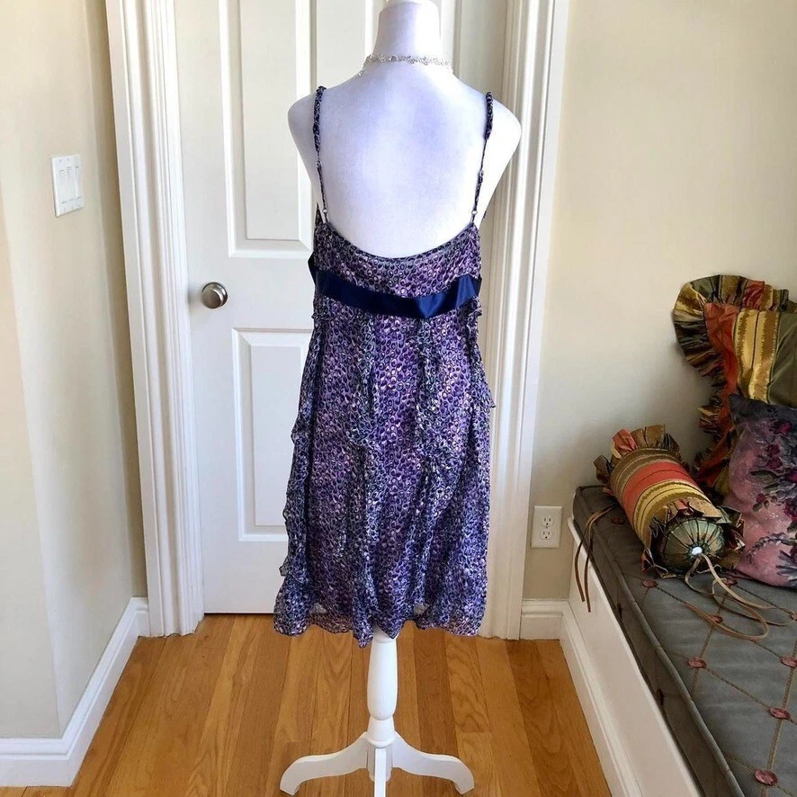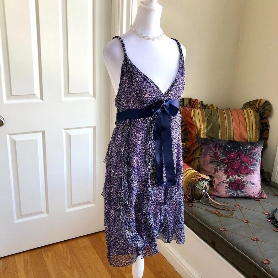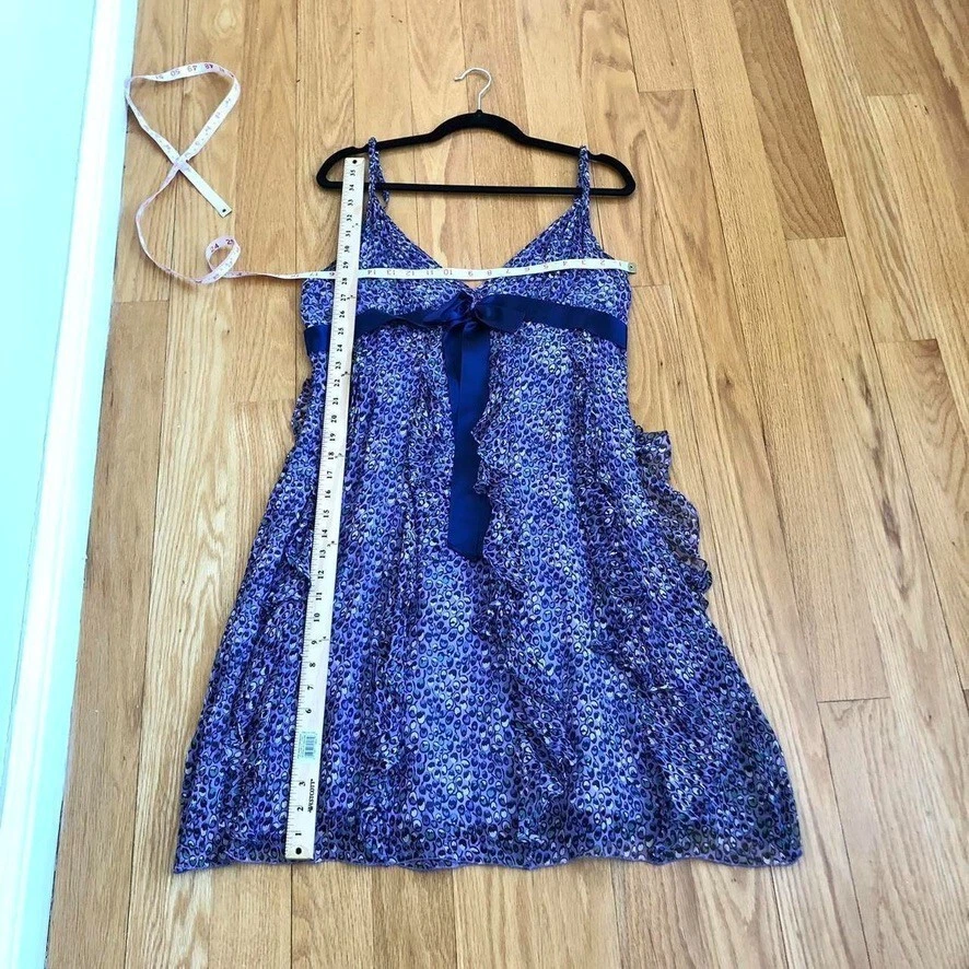 BCBGMAXAZRIA Silk Slip Dress with Ruffles & Bow in Blue Purple Pattern (12) Really beautiful slip dress, blue multi pattern, open back, front bow, ruffles on skirt, side zip 100% silk, lined, see tag Size 12, approximate measurements in inches: length 36 as adjusted, armpit to armpit 18 In very good condition, minor signs of wear #y2k #feminine #00s #cocktail #party #slipdress #silk