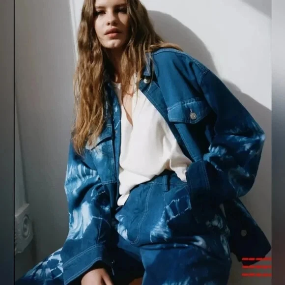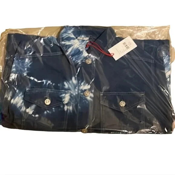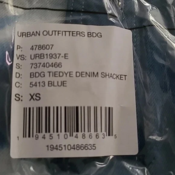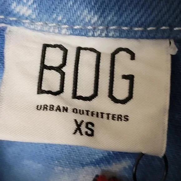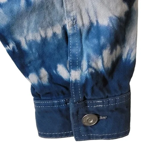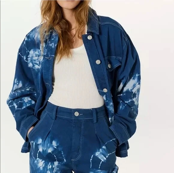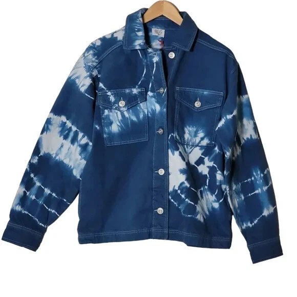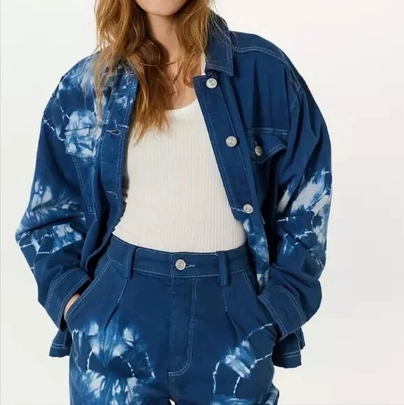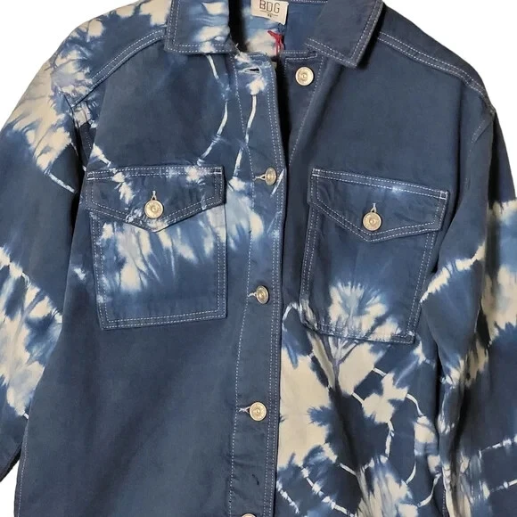 URBAN OUTFITTERS - BDG: Oversized Blue Tie-Dye Denim Jacket $79.00 Brand New With Tags - Size XSmall Oversized Fits up to a medium Blue & White Tie-Dye Pattern - Boxy Fit Urban Outfitters shirt jacket featuring: Oversized styling - Button Front - Pointed Collar Two button Flap patch chest pockets - Two hidden hip pockets - Bleach tie-dye design - Dropped sleeves Chest measuring from underarm to underarm 23” Length from shoulder 25” Machine washable (with like colours)