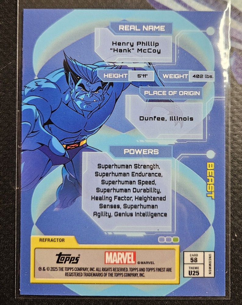 For avid collectors of X-Men memorabilia, this rare 2025 Topps Finest card featuring Beast is a must-have addition to your collection. With its stunning refractor design and inclusion in the highly sought-after '97 Ultimates series, card number 58 is a true gem. This non-sport trading card is made of high-quality card stock and features an original print from Topps, with no autographs or vintage wear. It's a perfect piece for any fan of the franchise or collector of rare cards. Don't miss your chance to add this exceptional piece to your collection.