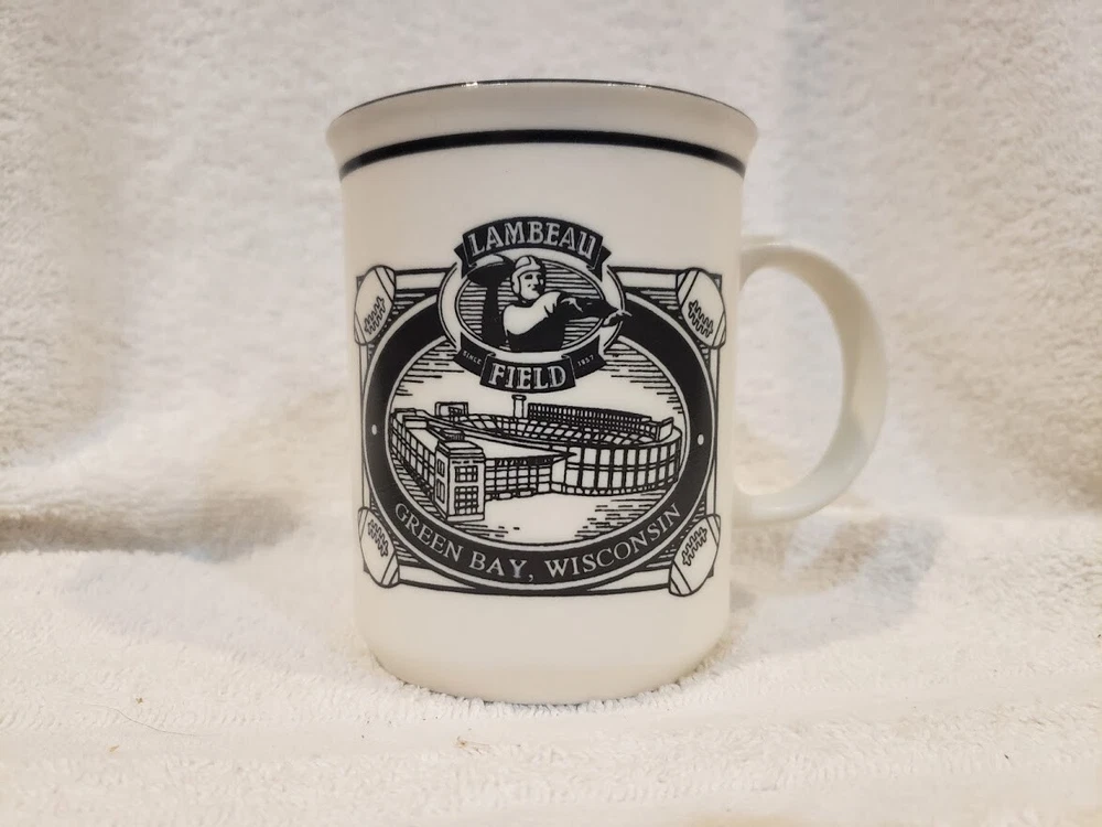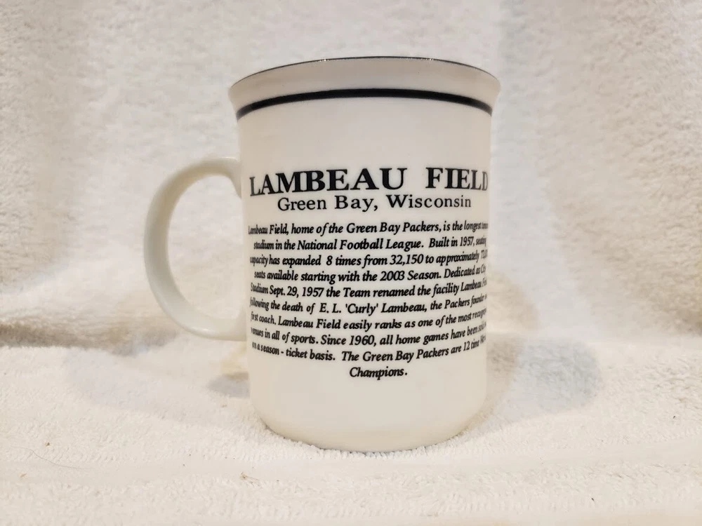 You are purchasing a VERY NICE circa 2000's Green Bay Packers Lambeau Field stonewear coffee mug. This is a very cool vintage item. Mug measure about 4+ inches tall. Is made of heavy white ceramic stonewear. Inside of mug is dark green. Has likeness of Lambeau Field and Lambeau Field logo on front side. Mug has Lambeau Field history on back side as shown. Mug shows little of any wear. No chips. cracks, scratches or surface wear. Is new never used. Overall, grades NMMT! Very cool vintage Packers item! Buyer pays $8.00 shipping. MN residents please add 6.875% sales tax. Shipping combined whenever possible. Thanks for your business! Please check out my ebay store for more great items!