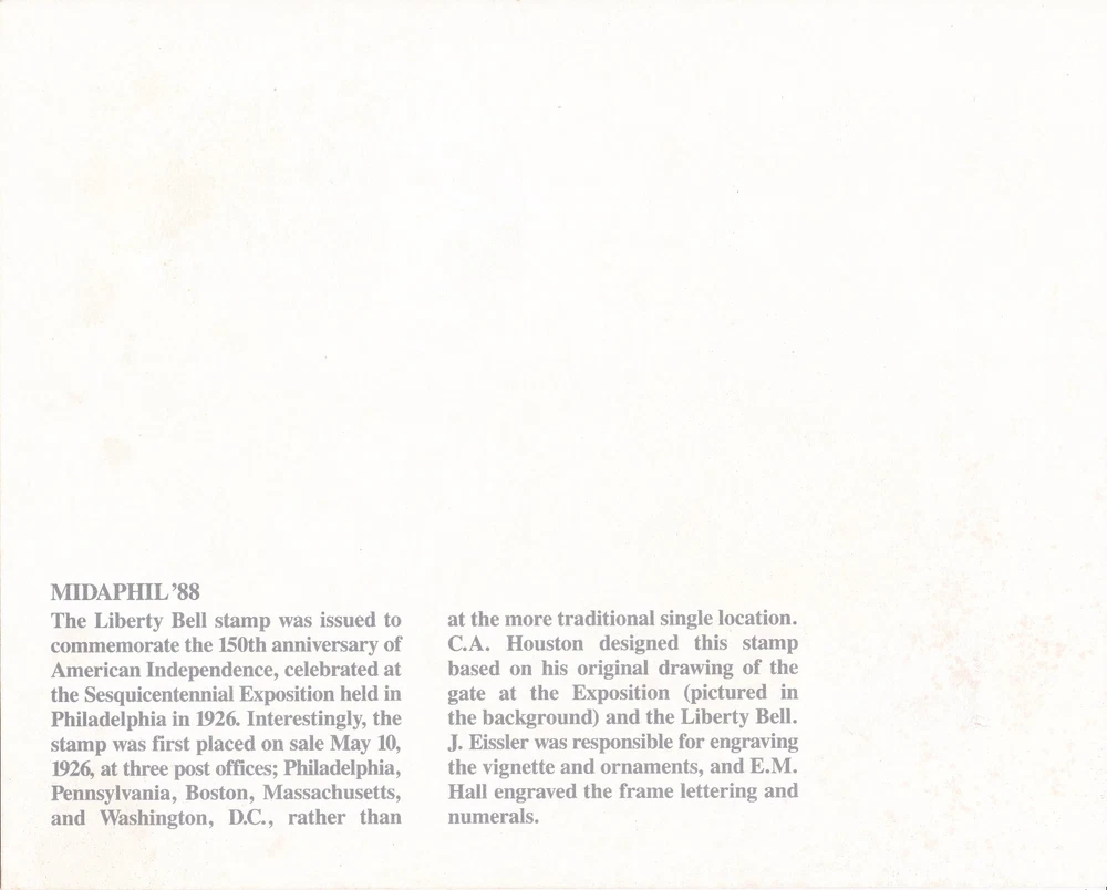 BUREAU OF ENGRAVING & PRINTING SOUVENIR CARD B120 2c LIBERTY BELL ISSUE MIDAPHIL '88 - KANSAS CITY, MISSOURI Card is mint and measures 8" x 10". Souvenir Card Is Mint, in Original Protective Folder If you have any questions or need me to elaborate please let me know. I try my best to describe all my listed items as accurately as possible. I will carefully wrap items to protect your purchase during shipping. Sheets, blocks, strips and individual stamps are mailed in a glassine envelope with a cardboard insert or in a heavy duty envelope to discourage bending. PayPal is the only method of payment I accept. Payment is expected within 3 days . Sorry, but I will only ship to the United States. ** Picture(s) are of the actual book / FDC you will receive. ** ** Customer satisfaction is very important to me. I work hard to make your purchase both smooth and seamless. I will also communicate with you and let you know the status once you purchase an item. In the event there are any issues or problems please contact me. I will do my best to resolve the issue or make things right. ** THANK YOU FOR LOOKING!! Shipping USPS to U.S. Continental Destinations Only (Tracking Included)