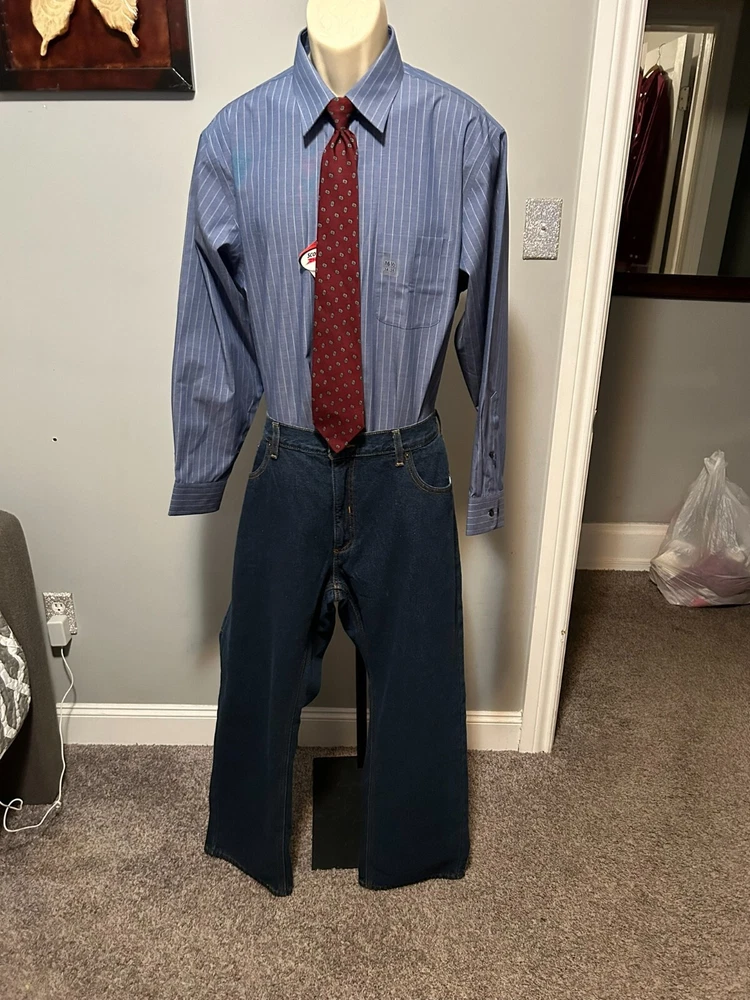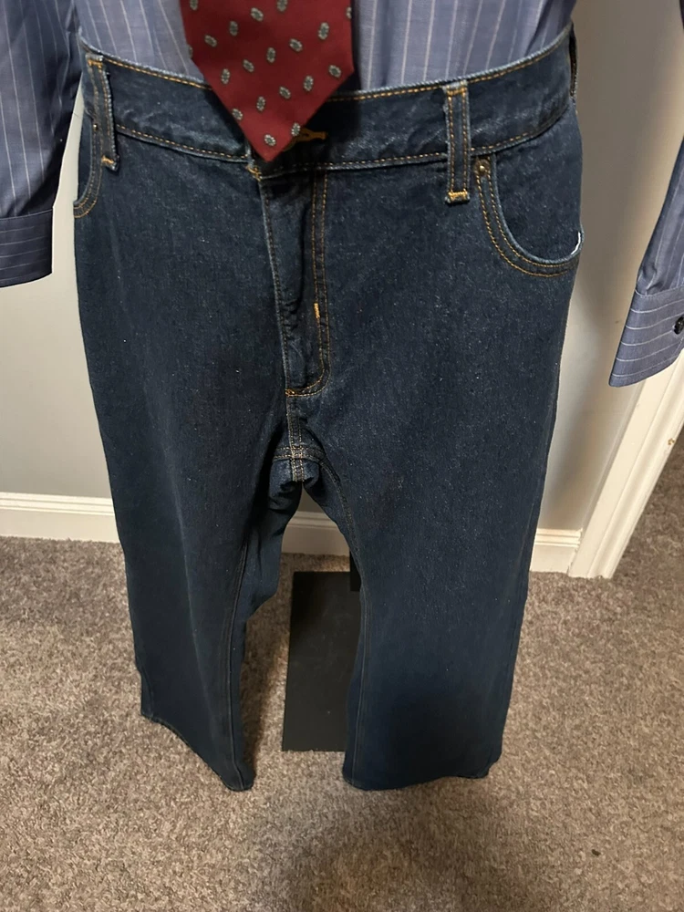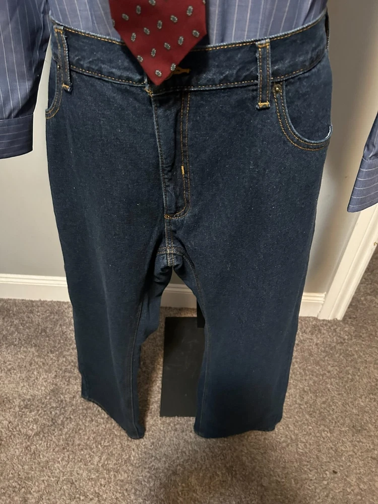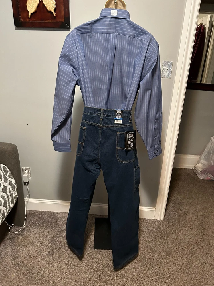 Elevate your style with these Berkley Jensen carpenter jeans. The dark denim and fleece lining make them perfect for winter, fall, and spring. The relaxed fit and high-rise waist provide comfort and style, while the 5-pocket design with slash pockets and cargo pockets offers ample storage space. The zip closure and cotton material make these jeans easy to care for and machine washable. The solid pattern and blue color add a touch of sophistication, and the carpenter jeans theme is perfect for any occasion. Order now to add these Berkley Jensen carpenter jeans to your wardrobe. CONDITION NEW WITH TAGS MEASUREMENTS WAIST 40 INCHES INSEAM 30 INCHES MATERIAL CONTENT 100% COTTON COLOR DARK DENIM