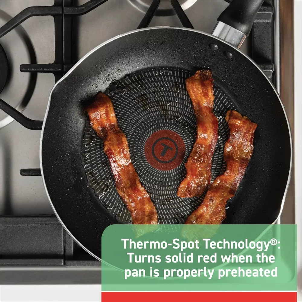 Product details Cooking and cleaning made easy with T-fal Easy Care Nonstick 20-Piece Set, ensuring reliable results when preparing meals for the whole family. Includes 4.5" One Egg Wonder, 8" fry pan with pouring spouts, 10.5" fry pan with pouring spouts, 10.25" griddle, 5QT jumbo cooker with glass lid, 1QT saucepan with glass lid, 2QT saucepan with glass lid, 3QT saucepan with glass lid, 5QT stewpot with glass lid, baking tray, pasta spatula, spatula, ladle, spoon, and slotted spoon. Pro-Glide non-stick interior ensures easy food release, and enables healthy cooking with little to no oil. Thermo-Spot heat indicator shows when T-fal pans are perfectly preheated to start cooking, and the even heat base allows for no hot spots. Features comfortable handles and vented tempered glass lids. Dishwasher and oven safe up to 350°F; all cook tops compatibility excluding Induction; limited lifetime warranty. Proglide Nonstick Interior: Easy release and cleanup Thermo-Spot Technology: Turns solid red to indicate when the pan is properly preheated Comfortable Handle: Sturdy and secure grip Measuring Marks: No need for a measuring cup Vented Glass Lid: Maintain visibility while trapping heat and moisture Dishwasher and Oven Safe: Up to 350°F All Cooktops Compatibility: Excluding Induction LIMITED LIFETIME WARRANTY This 20 Pcs PTFE Non-Stick Cookware Set includes 4.7" Frypan, 8" Frypan, 10.5" Frypan, 1QT Saucepan with lid, 2QT Saucepan with lid, 3QT Sautepan with lid, 5QT Jumbo Cooker with lid, 5QT Stewpot with lid, 10.25" Square Griddle, 13" x 9" Baking Tray, 5 tools Brand T-fal Collection Easy Care Nonstick Piece Count 20 Material Aluminum Pan Material Nonstick Handle Finish Plastic Items Included 4.5" One Egg Wonder, 8" fry pan with pouring spouts, 10.5" fry pan with pouring spouts, 10.25" griddle, 5QT jumbo cooker with glass lid, 1QT saucepan with glass lid, 2QT saucepan with glass lid, 3QT saucepan with glass lid, 5QT stewpot with glass lid, baking tray, pasta spatula, spatula, ladle, spoon, and slotted spoon Color Gray Nonstick Y Features Nonstick, Oven Safe Cleaning, Care & Maintenance Dishwasher safe Manufacturer Groupe SEB Manufacturer Part Number B087SKDW Model B087SKDW Assembled Product Dimensions (L x W x H) 25.20 x 12.60 x 15.94 Inches