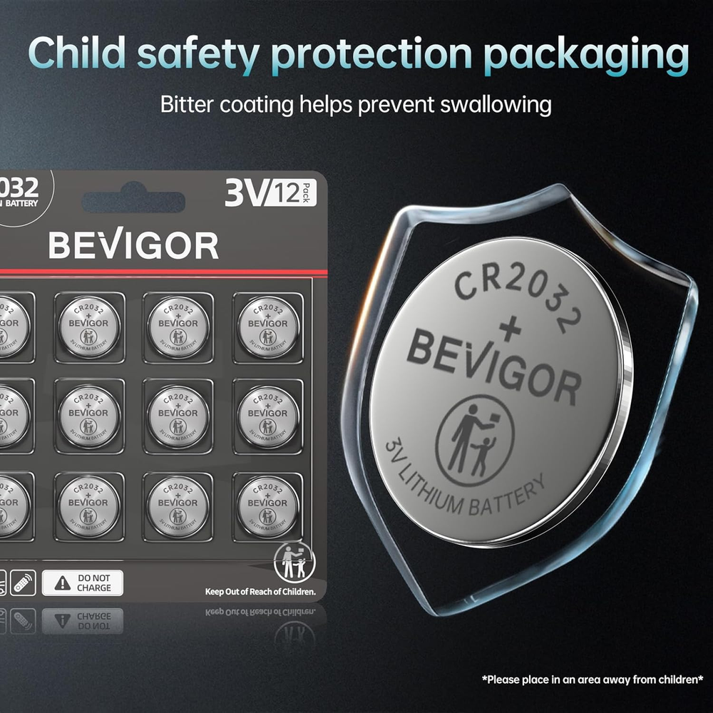 BEVIGOR CR2032 Lithium Coin Battery for Apple Airtag 2032 Batteries, 12 Pack Compatible Models: CR2032,CR2032BP,DL2032,ECR2032,KCR2032,BR2032,LM2032,5004LC,5004LB,L14,SB-T15,EA2032C,EA-2032C,L2032,2032,DJ2032,KL2032,E- CR2032,KECR2032,GPCR2032,KT-CR2032 Long-Lasting Power: Our high-density batteries offer 10% higher energy density and 20% more capacity than regular batteries, ensuring superior performance. Power Protection Technology: With an improved design that includes dual-pressure contacts, new zinc composition, and anti-corrosion components, our airtight and liquid-tight seals lock in the power until you need it. High-Performance Lithium Coin Battery: Grade BEVIGOR CR2032 battery provides reliable and long-lasting power for your watches, calculators, and medical devices. What You Get: We’ve got your back with a 24-month worry-free warranty and friendly customer service. Got questions? Hit us up anytime! Thank you for viewing our BEVIGOR CR2032 Lithium Coin Battery for Apple Airtag 2032 Batteries, 12 Pack.