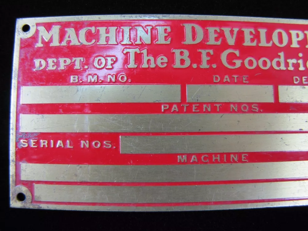 -BFG Tire Company Piece- Machine Development Dept of The B.F. Goodrich Co. Old Brass Nameplate Small Sign Equipment Tag please view all pictures for more information shows some wear with age noted measures approximately 2 1/8" by 4 3/8" check our store for more advertising items available for private inspection by appointment please view all pictures for more information and to judge condition for yourself. wear with age and use. please ask all questions before end of auction. available for private inspection. please feel free to contact us with any pertinent questions pertaining to the item. follow us and add us to your favorite sellers, we are always adding new items in our store. thank you for looking -dr24.dp- *AGED2PERFECTIONSTORE* SAVE US TO YOUR FAVORITES - CHECK BACK OFTEN, NEW ITEMS LISTED EVERY WEEK PLEASE NOTE: SHIPPING ONLY ON AUCTIONS NO LOCAL PICK UP AVAILABLE WE COMBINE/LOWER SHIPPING AS POSSIBLE ON MULTIPLE PURCHASES - ASK OR MESSAGE US FOR A COMBINED INVOICE BEFORE PAYING, ITEMS MUST BE PAID FOR UNDER SAME INVOICE FOR DISCOUNT *AGED2PERFECTIONSTORE* - FIND US AT AGED2PERFECTIONSTORE & AGED2PERFECTIONSTORE1&2