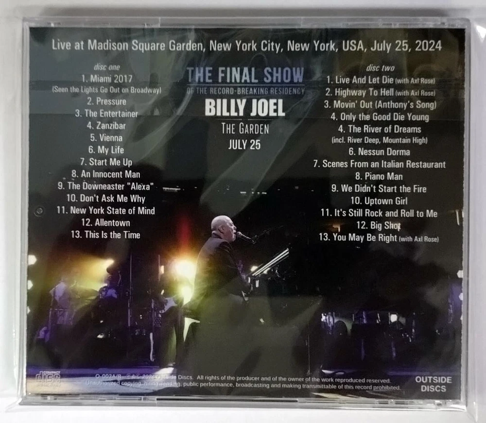 disc one 1. Miami 2017 (Seen the Lights Go Out on Broadway) 2. Pressure 3. The Entertainer 4. Zanzibar 5. Vienna 6. My Life 7. Start Me Up 8. An Innocent Man 9. The Downeaster "Alexa" 10. Don't Ask Me Why 11. New York State of Mind 12. Allentown 13. This Is the Time disc two 1. Live And Let Die (with Axl Rose) 2. Highway To Hell (with Axl Rose) 3. Movin' Out (Anthony's Song) 4. Only the Good Die Young 4. The River of Dreams (incl. River Deep, Mountain High) 6. Nessun Dorma 7. Scenes From an Italian Restaurant 8. Piano Man 9. We Didn't Start the Fire 10. Uptown Girl 11. It's Still Rock and Roll to Me 12. Big Shot 13. You May Be Right (with Axl Rose) Stereo Soundboard Live at Madison Square Garden, New York City, New York, USA, July 25, 2024 *** factory pressed silver disc! *** ****************************************************************** Thank you for watching!!! BRAND NEW !! I will provide courteous and responsive service. Thank you, Shipping: I will ship by registered airmail. I attach the tracking number. Shipping Worldwide Shipping is only available to the address registered in Payoneer. Please note that any address not registered in Payoneer is not acceptable to ship. I ship the goods from Monday to Friday. Payment: Payment within 1 week since the first winning About Us: Terms of Sale Unconditional Return Policy Customer service and satisfaction are very important to us. I have an unconditional return policy if notified within 14 of the receipt of the item. All returned items must be the original condition. All return requests must be made within 14 days of the receipt of the item. Please contact me first for return before you ship it back to me. The postage of the returned goods is a buyer burden About Us Our Products are 100% Authentic. I promise to pack up the product very carefully. If you have any question, please contact me. Happy Bidding !! International Buyers - Please Note: ・ Import duties, taxes and charges are not included in the item price or shipping charges. These charges are the buyer's responsibility. ・ Please check with your country's customs office to determine what these additional costs will be prior to bidding / buying. ・ These charges are normally collected by the delivering freight (shipping) company or when you pick the item up - do not confuse them for additional shipping charges. ・ We do not mark merchandise values below value or mark items as "gifts" - US and International government regulations prohibit such behavior.