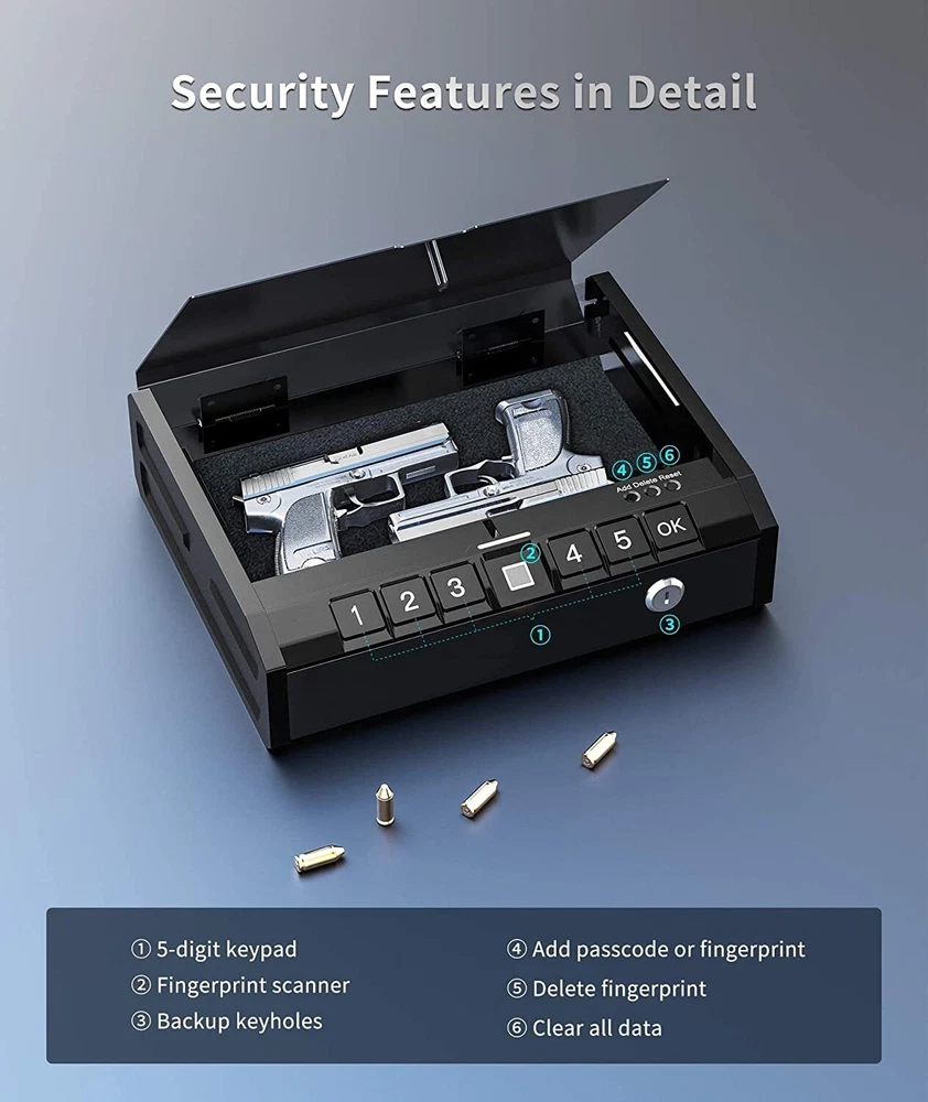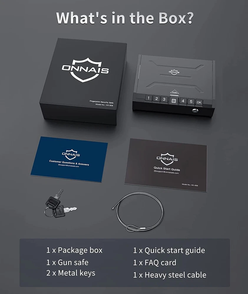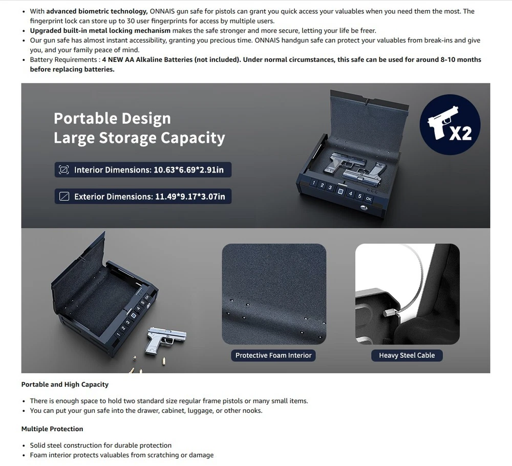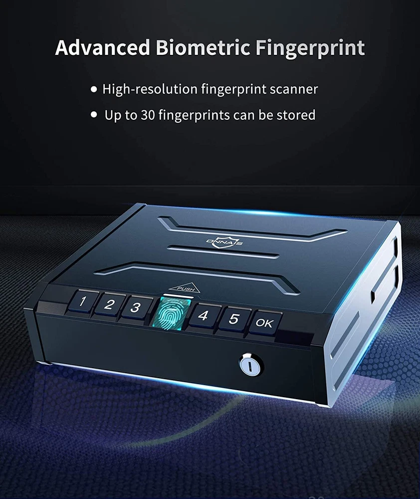 Biometric Handgun Safe Solid Steel Locking Construction. ONNAIS U.S. Ships FREE & FAST 6 Days A Week More Safes, Gunsmith, Optics In Store Free Shipping For 48 State Continental U.S. Only No Shipping Puerto Rico Guam, Etc 10% CANCELLATION FEE NO EXCEPTIONS Fingerprint Gun Safe: Quick-access gun safe is absolutely important for a family. No matter to protect your handguns from your children or just to keep your items inaccessible while unsupervised. It's responsible to store them securely in this handgun safe and right where you need them. Biometrics keeps your contents secure with immediate accessibility. Helps you access the handgun safe quickly when you need it most and bring you more time when in danger. Advanced Biometric Technology: Equipped with biometric fingerprint technology which is a proven method that is accurate and more secure than a traditional keypad lock and ensures single-handed access to your firearm device. A high-resolution fingerprint scanner allows access to your contents quickly. The fingerprint lock can store up to 30 user fingerprints for access by multiple users. Portable and Three-Way Access: With portable design, you can keep this gun safe in a drawer, cabinet, luggage, or nooks and also place it at home, car, nightstand, or some other spot that's easy for you to use as a bedside handgun safe. Offers convenient 3-way access. Apart from the biometric option, you have keypad locks and 2 backup override keys which will make sure you can always access your guns. Tough and Large Capacity: Our handgun safe has solid steel construction and anti-corrosion for increased durability and ultimate protection. This gun safe lid is also pry-resistant and is powered by 4 AA batteries. Also, there is enough space to hold two standard size regular frame pistols or many small items. The interior is padded with soft foam to prevent scratches. MORE INSIDE: HERE