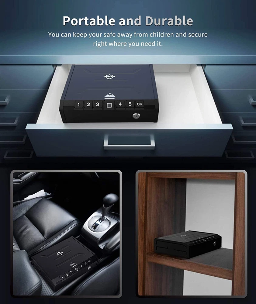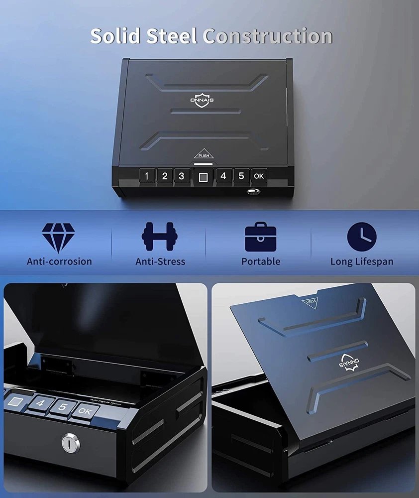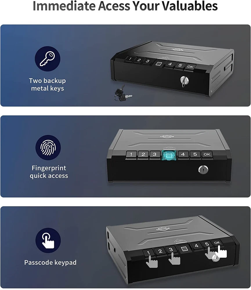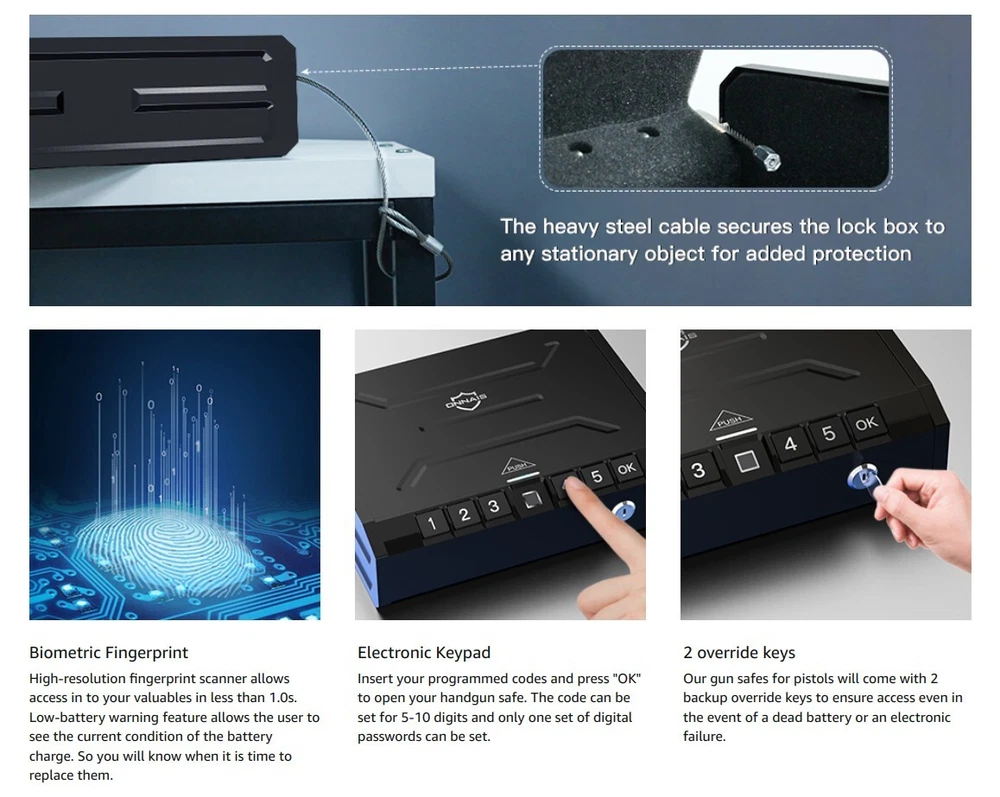 Biometric Handgun Safe Solid Steel Locking Construction. ONNAIS U.S. Ships FREE & FAST 6 Days A Week More Safes, Gunsmith, Optics In Store Free Shipping For 48 State Continental U.S. Only No Shipping Puerto Rico Guam, Etc 10% CANCELLATION FEE NO EXCEPTIONS Fingerprint Gun Safe: Quick-access gun safe is absolutely important for a family. No matter to protect your handguns from your children or just to keep your items inaccessible while unsupervised. It's responsible to store them securely in this handgun safe and right where you need them. Biometrics keeps your contents secure with immediate accessibility. Helps you access the handgun safe quickly when you need it most and bring you more time when in danger. Advanced Biometric Technology: Equipped with biometric fingerprint technology which is a proven method that is accurate and more secure than a traditional keypad lock and ensures single-handed access to your firearm device. A high-resolution fingerprint scanner allows access to your contents quickly. The fingerprint lock can store up to 30 user fingerprints for access by multiple users. Portable and Three-Way Access: With portable design, you can keep this gun safe in a drawer, cabinet, luggage, or nooks and also place it at home, car, nightstand, or some other spot that's easy for you to use as a bedside handgun safe. Offers convenient 3-way access. Apart from the biometric option, you have keypad locks and 2 backup override keys which will make sure you can always access your guns. Tough and Large Capacity: Our handgun safe has solid steel construction and anti-corrosion for increased durability and ultimate protection. This gun safe lid is also pry-resistant and is powered by 4 AA batteries. Also, there is enough space to hold two standard size regular frame pistols or many small items. The interior is padded with soft foam to prevent scratches. MORE INSIDE: HERE