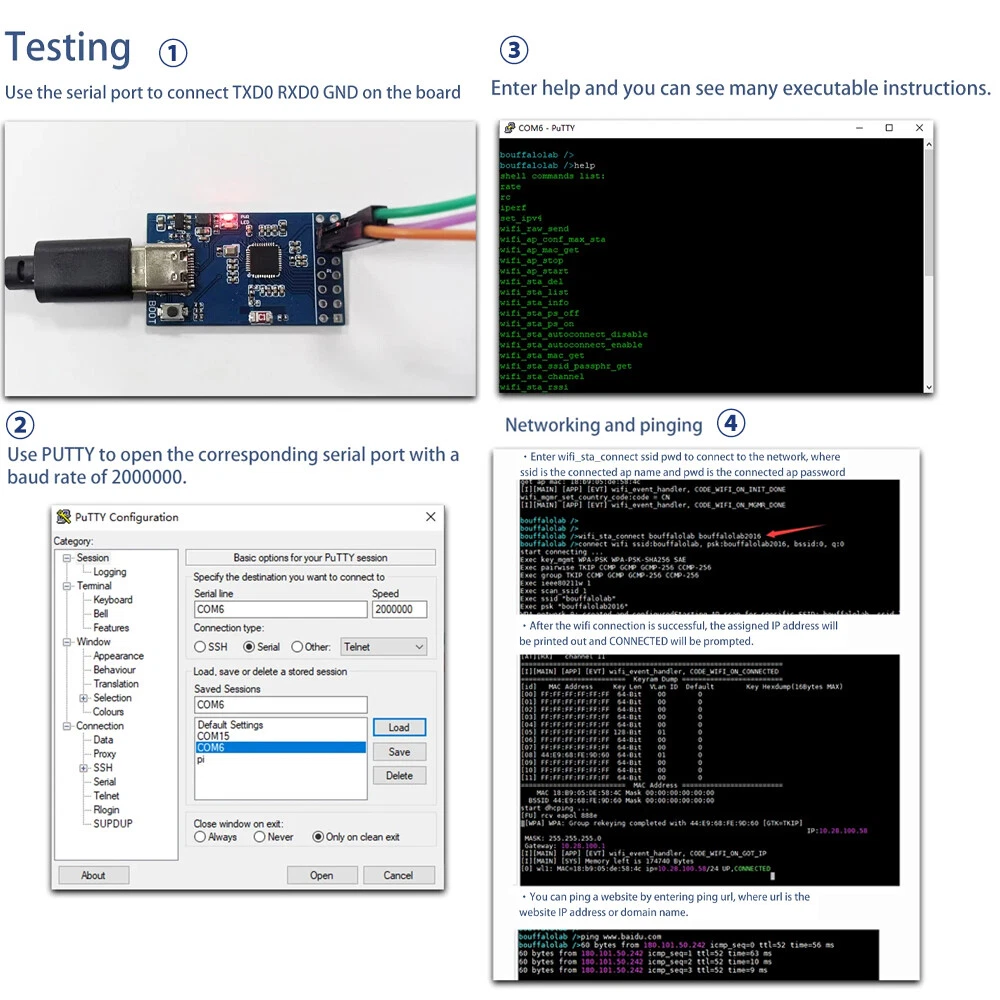 Visit store Items for sale About us Product Details Overview BL616/BL618 is a Wi-Fi6+Bluetooth 5.3+802.15.4(Zigbee/Thread) combo chip for ultra-low power applications. It mainly contains two subsystems: wireless and microcontroller. The wireless subsystem contains 2.4G radio, Wi-Fi 802.11b/g/n/ax, BT/BLE and 802.15.4 baseband/MAC designs. The microcontroller subsystem consists of a low-power 32-bit RISC-V CPU with a floating-point unit, DSP unit cache, and memory up to 320 M. In addition, the chip features a rich set of peripheral interfaces, specifically DVP, Dispaly, MJPEG, Audio Codec, USB2.0, SDU, Ethernet (EMAC), SD/MMC (SD), and MMC (SD). /MMC(SDH), SPI, UART, I2C, I2S, PWM, GPDAC, GPADC, ACOMP, etc., which can be applied in multimedia fields such as audio/video and industrial fields. Features 1.BL616 IoT development board adopts RISCV core, stable performance. 2.TYPE-C interface, 5V USB cable power supply, 480M high-speed USB2.0. 3. Low power consumption, the application of Wi-Fi6 + Bluetooth 5.3 + 802.15.4 (Zigbee/Thread) combination chip power consumption. 4. The chip has a wealth of peripheral interfaces, easy to connect a variety of external products. 5. Wide range of applications, can be used in audio and video and other multimedia fields and industrial fields. Specification Interface: TYPE-C Voltage: 5V Indicator: power indicator (red); user indicator (blue) Antenna: On-board ceramic antenna Download button:Press the BOOT button and insert the USB to download the program. Size:25mm*20mm List 1 x Development Board 1 x Pin Payment Method Shipping Policy Feedback Payment Method Payment must be received in 5 business days of auction closing. Please leave note for your special request (e.g. Colors or Size) when you pay the order. Any special request cannot be accepted after 24 hours of payment, because most of orders will be processed instantly and same day dispatched. Shipping Policy 1. We only ship to the confirmed address provided by eBay. please make sure your ebay address is 100% matches the address you would like us to ship to. If not, please let us know before we sent you the package, or we will not be responsible for any loss. hope you could understand. 2. Orders will be processed instantly and dispatched within 1-3 business days except hoilday, so we do NOT accept any email/message note after you place orders. 3. All package need to wait 30 days,Please take care it.Less than 30 days,we can't take a refund. Feedback We maintain high standards of excellence and strive for 100% customer satisfaction! Feedback is very important to us. We request that you keep in touch with us immediately BEFORE you give us neutral or negative feedback, so that we can satisfactorily address your concerns.