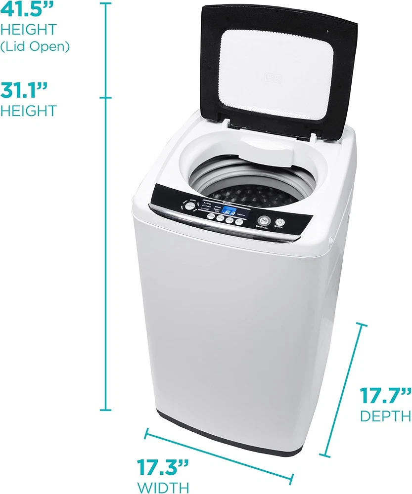 Plastic Multiple Wash Cycles: Wash your laundry at home with this Black and Decker portable washer. Our portable clothes washer has 5 cycle selections: Heavy, Gentle, Normal, Rapid, and Soak. Cold Water Wash Only: This portable washing machine offers 3 water level choices for small, medium, and large loads up to 6.6 lbs. capacity for cold water only temperature settings. Stainless Steel Tub: Our 0.9 cu. ft. portable laundry machine features a durable, rust and corrosion-resistant stainless steel wash tub with top loading transparent quiet-close lid to view contents. Safety Features: Our small washing machine features auto unbalance detection to ensure laundry is cleaned at peak performance, as well as auto shutoff safety features and child lock protection. Portable Convenience: Connect and disconnect this apartment washing machine with ease and transport from kitchen or bathroom to storage closet on two roller wheels with side handles when its needed. When it comes to washing machines, this outstanding BLACK+DECKER portable washer (17.3” x 17.7” x 31.1”) is your ultimate solution to immaculately clean clothing for household use. There are 5 cycles to choose from with this fantastic 0.9 cu. ft. washer, which include Heavy, Gentle, Normal, Rapid, and Soak. Cold water temperature settings available with three water level choices for small, medium, and large loads. Inside this small washer (48.4 lbs.), you’ll find an incredible stainless steel tub that’s rust and corrosion-resistant with a quiet close top loading transparent lid. Because this unit is an impeller washer, it’s perfect for lingerie and delicates as it doesn’t have an agitator to cause entanglement problems. Also, you can use for soiled baby clothing and diapers, but must run them separately from other loads. You can also easily wash baby clothing and diapers, as well as lingerie without entanglement problems common with agitator washers. Place anywhere in your home or area with 2 rollers, 2 side handles, and 1 adjustable front leveling leg. This unit comes with a drain hose and quick connect sink adaptor. Also included are auto shutoff safety features and Child Lock protection. Get the high quality washing you deserve to live out your day with our amazing BLACK+DECKER portable washing machine. Reinforced packaging is included for total customer satisfaction.