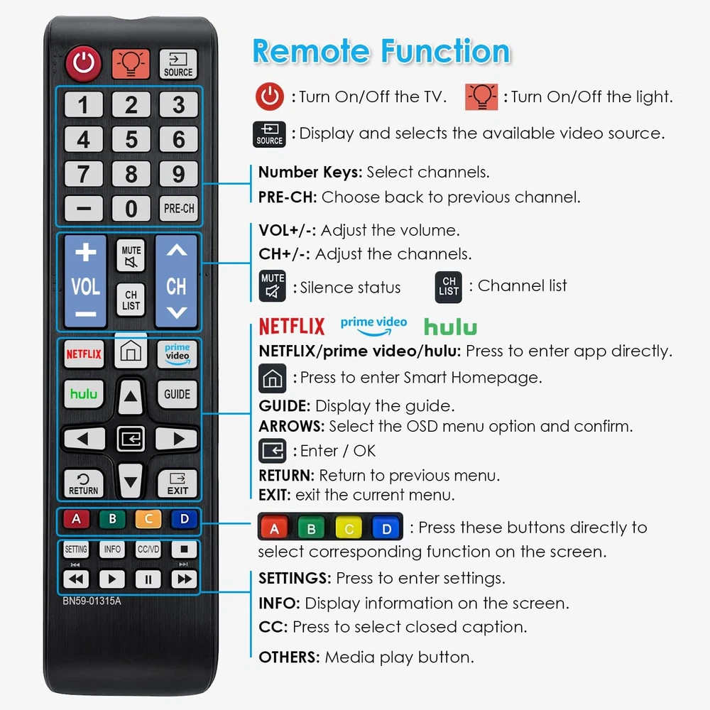 Store New Arrivals Add to Favorite View Feedback Contact Fast deliveries to the customer's home Quality customer service John Make the customers happy! BN59-01315A Universal Backlit Remote Control for Samsung TV Remote Replacement All Samsung Smart TV, LED, LCD, HDTV, 3D, Series TV Description 📺 It is applicable for your Samsung Smart Universal Controls BN59-01315A BN59-01315J BN59-01301A BN59-01175N BN59-01199F AA59-00741A AA59-00786A AA59-00602A BN59-01247A AA59-00743A BN59-01175B AA59-00818A AA59-00603A BN59-01199G AA59-00622A AA59-00496A AA59-01180A AA59-00666A AA59-00600A BN59-01259E, BN59-01312B/H/G, BN59-01312F, BN59-01312M, BN59-01312A, BN59-01259B, BN59-01260A, AA59-00581A, AA59-00582A, AA59-00594A, BN59-01178W, AA59-00638A etc All Samsung models 📺 This is a new design remote with light up button, you could turn on the light in a dark night and turn off during the daytime. 📺 The universal infrared TV remote with 3 shortcut buttons for Netflix, Prime video and Hulu for extra convenience. It is perfect to replace your old or damaged Samsung TV Remote. 📺 This Universal Remote Control use 2 x AAA batteries (Batteries are not included). Farther transmitting distance, stable performance. Replaces your damage or old one and covers all the functions of the original remote. 📺 We provide 30 days warranty with no condition return or exchange. If you have any query, please contact us and we will get back to you as soon as possible within 24 hours. Product Description Item model number BN59-01315A Item Weight 2.12 ounces Color Black Is Discontinued By Manufacturer No Product Dimensions 7 x 1.7 x 0.9 inches Country of Origin China Compatible Devices Television Max Number of Supported Devices 1 Batteries 2 AAA batteries required. Special Feature Backlit ABOUT US We offer the best prices around on high quality products. Our E-store includes media such as books, movies, music and games while offering electronics, toys, sporting apparel, clothing, tools, general home, garden items and more. SHIPPING We are always working hard to ensure your package arrives as soon as possible. Please understand that some factors like weather, high postal traffic, and the performance of shipping companies are outside of our control. We offer free shipping to the lower 48 states and ship within 2 business days of payment, usually sooner. We do not accept P.O. Boxes. Please provide a physical address. For shipping outside of the continental USA, we only use eBay's Global Shipping Program. The item is shipped to KY and then sent to the rest of the world. International customers are responsible for all duties and taxes. Continue to 'check out' to calculate costs for shipping the item to your country. Messages regarding eBay's Global Shipping Program MUST be directed at eBay EXCLUSIVELY. RETURNS We offer a 30-Day Return Policy on items in which you are not completely satisfied with. You have the option of a full-refund or an exchange of the item. No returns are available on items shipped outside of the USA PAYMENT We accept PayPal. CONTACT US This page content is yet to come Please ad us to your favorite seller and visit again later Thank You CUSTOMER SATISFACTION We try our very best to make sure every customer is completely satisfied. If there's a problem, message us! We're happy to help. WE ACCEPT