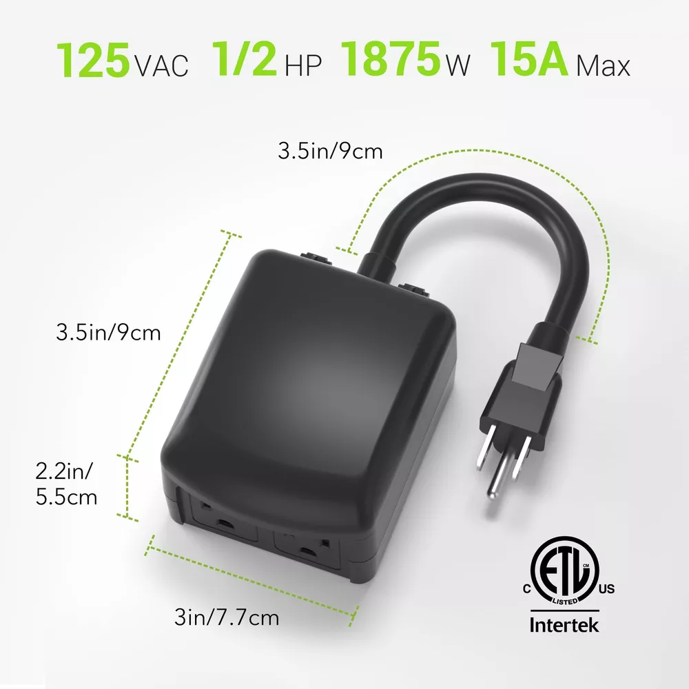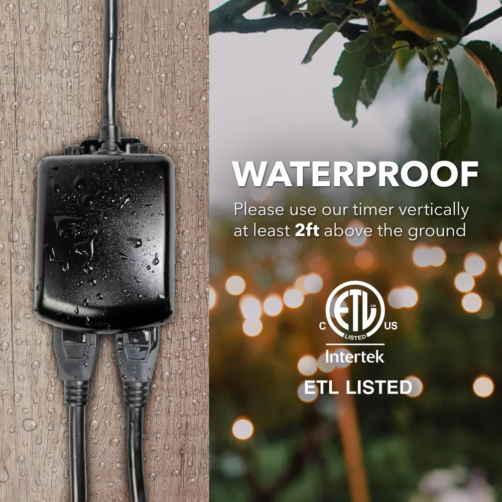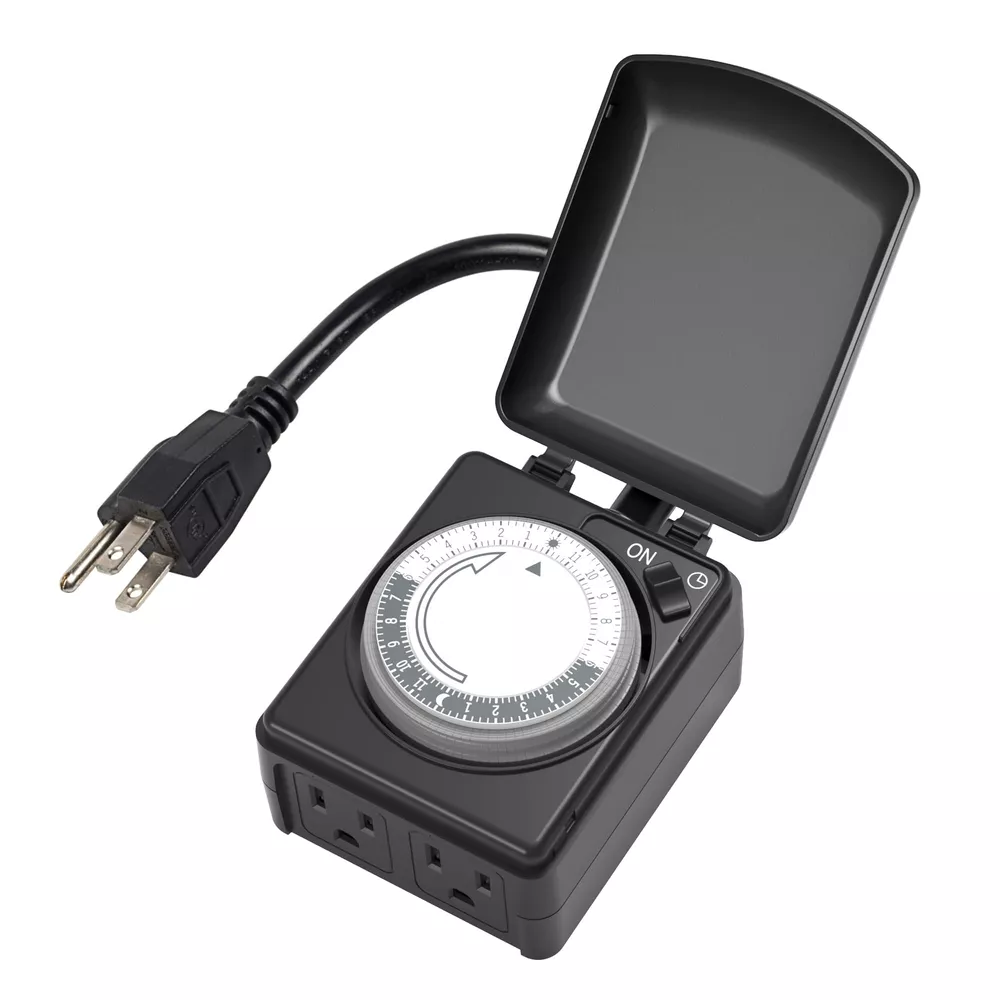 BN-LINK outdoor outlet timer will continue to function in extreme weather conditions. Perfect for your outdoor lights, pool pumps, fountains, and Christmas/ yard/patio/landscape/holiday lamps and other electric devices. Easy setting: Turn the timer dial to the current time. Push all the pins down for the run time, and pull other pins up for the off-time. Set the manual override switch on Timer, then it will automatically turn on/off your appliance to save energy. Note: Compressors may affect the rating of your appliance when being used with our products. Please ensure the BTU/hr on your appliance is compatible with our product. Please refer to the application guide in the technical details. Programmable in 15 minute intervals with 48 setting options in a 24 hours period. Total 48 ON/OFF setting per day. Repeats schedule daily with personal setting. Waterproof for outdoor use: Cover provides protecting timer from weather conditions. Heavy duty material and two grounded outlet makes it safe and durable. Two 3-prong grounded outlets and 6.8 inch cord for use with devices like Christmas lights, fountain timers, patio and yard lights, as well as holiday decorations. (Not compatible with pool pumps) Simply press down all the pins for the range of time you would like your attached appliance to turn on. The programmed schedule will repeat every 24 hours, automatically turning on and off your device so you won't have to. Our outdoor dual 3-prong, grounded timer outlet is ETL listed, and conforms to UL Std. 917. Rate Voltage: 125V, 60Hz, 15A Max, 1875W Resistive or General Purpose, 8A Tungsten Lamp, 1/2HP, TV-5. Note: Compressors may affect the rating of your appliance when being used with our products. Please ensure the BTU/hr on your appliance is compatible with our product. Please refer to the application guide in the technical details.