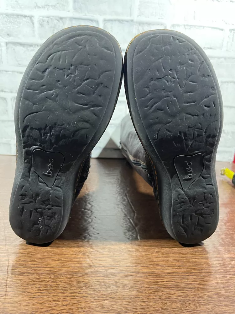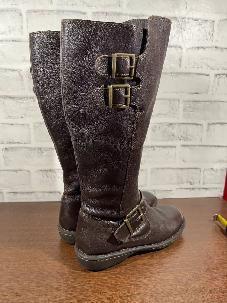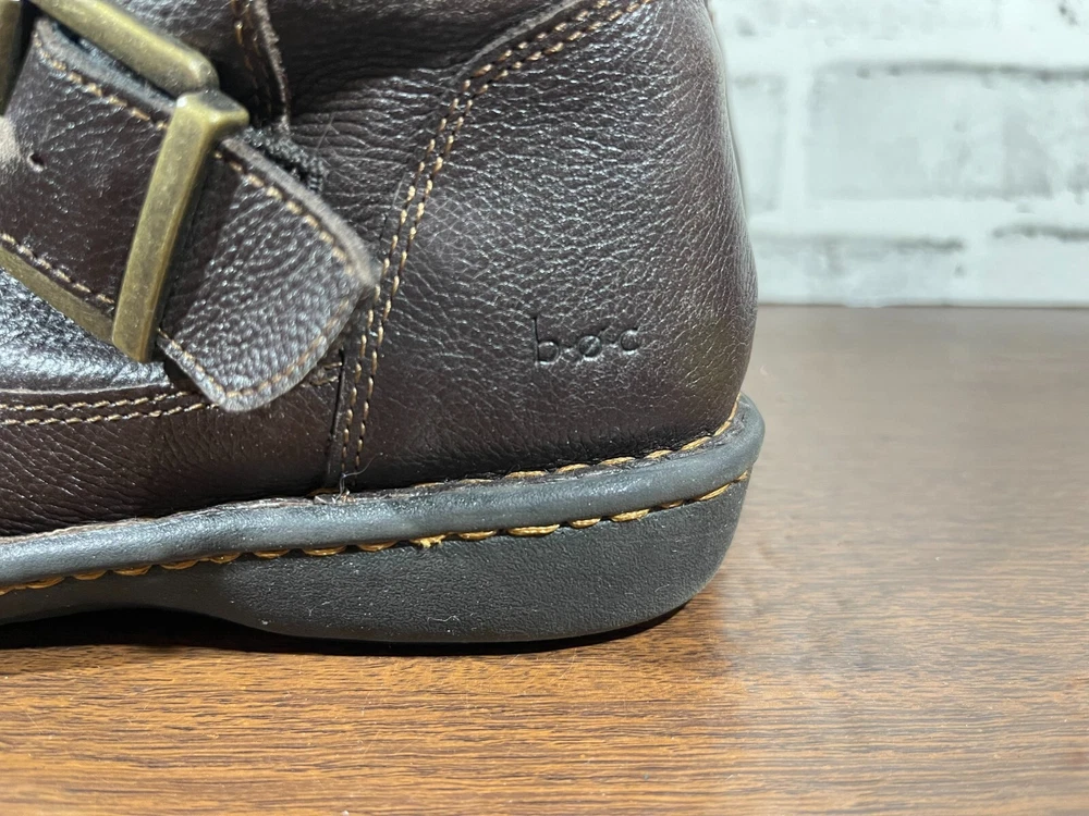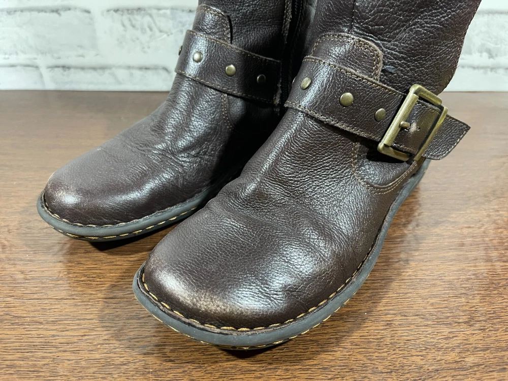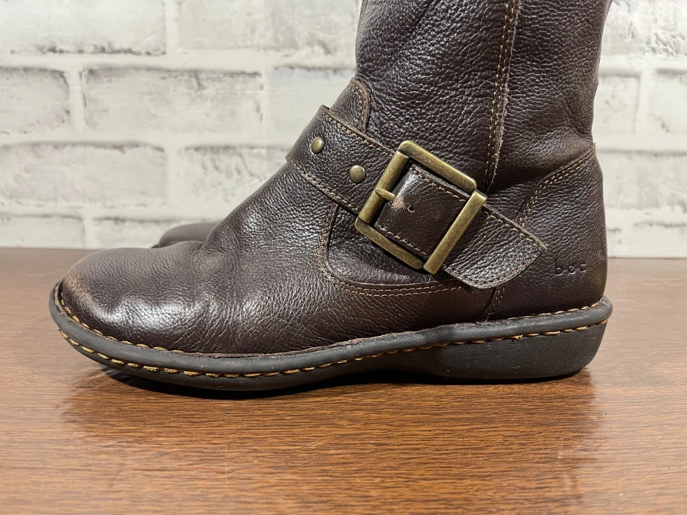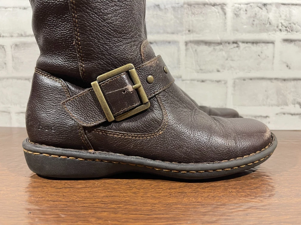 Step out in style with these BOC Born Concept Boots for women. These mid-calf riding boots feature a round toe shape and a zip closure for easy wear. The brown leather upper material is accented with a buckle, zipper, and logo, giving these boots a classic yet modern theme. Comfort is not compromised with a flat heel style and medium calf width. The rubber outsole material ensures durability, making these boots perfect for casual occasions during any season, be it winter, summer, fall, or spring. These boots are available in US shoe size 7, AU shoe size 7, and EU shoe size 38. Add these stylish boots to your wardrobe today! Very good preowned condition with normal preowned wear and a bit of scuffing as pictured. Please see all photos. All clothing has been washed and comes from a smoke free environment. I am available for questions. I accept or negotiate reasonable offers. Have an amazing day. Thank you.