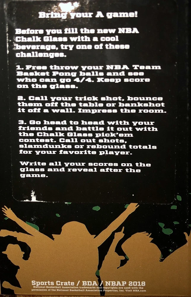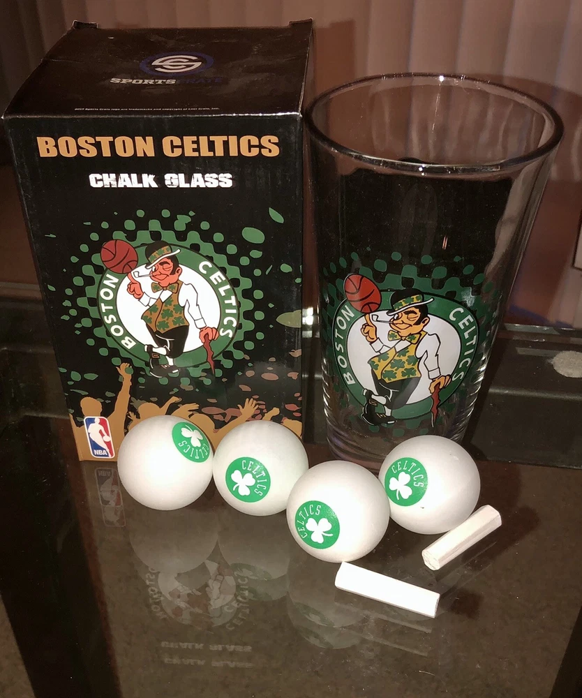 BOSTON CELTICS NBA Sports Crate Chalk Glass Beer Pong Game. Condition: “NEW in box”. Shipped with USPS. Beer Pong Game - comes with 2 pieces of chalk, the glass and 4 Ping Pong balls with the team logo printed on the glass and balls. Sorry, beer not included.😎 Proceeds benefit the Pro Players Association, a 501(c)(3) nonprofit charity.