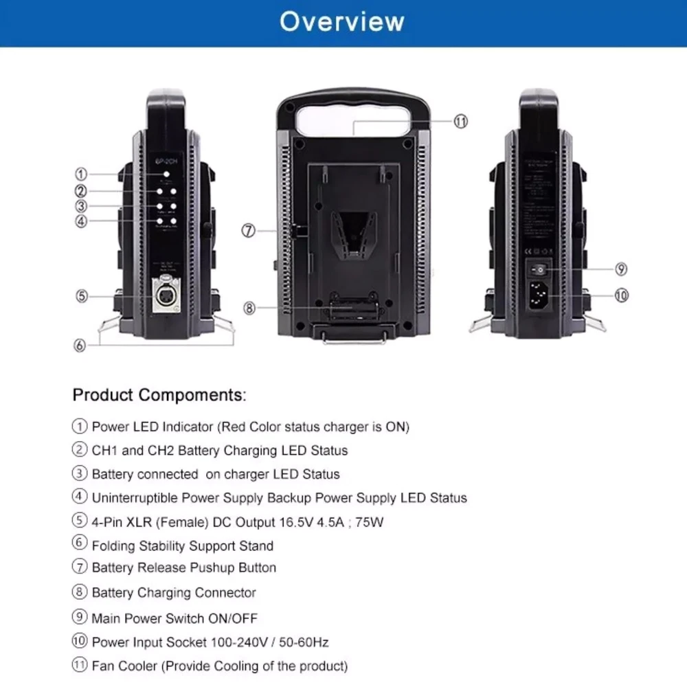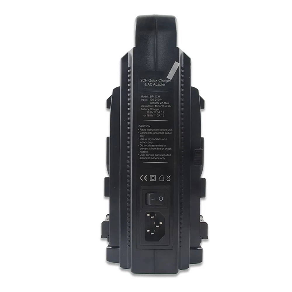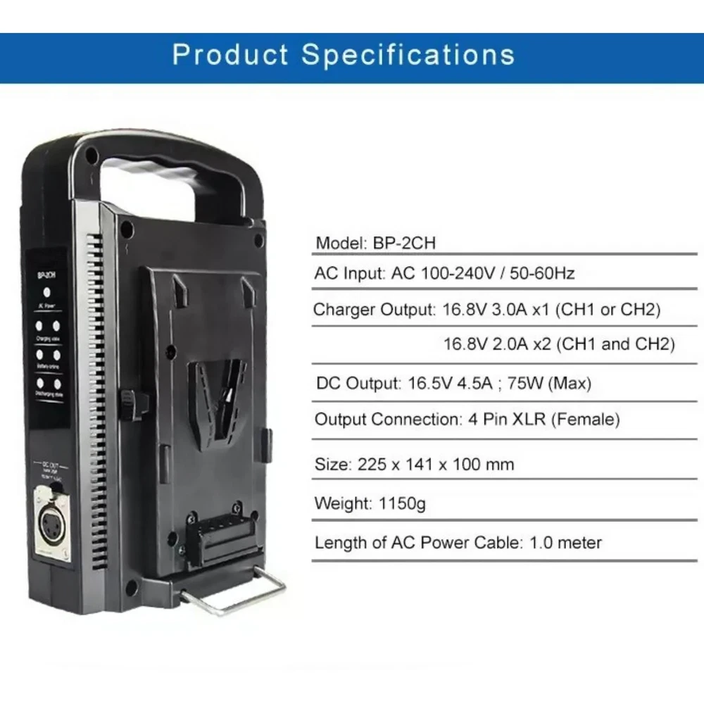 Product Description BP-2CH Dual Channel V-Mount/V Lock Li-Ion Battery Quick Charger W/ Power Supply Features: The BP-2CH charger is capable of charging 14.4V/14.8V V-mount lithium-ion batteries. There is no need to switch operation modes when the input voltage ranges from 100-240V. It offers quick charging for a single lithium-ion battery and sequential nominal charging for two lithium-ion batteries. Equipped with a DC output, the BP-2CH can be utilized as a DC power supply for cameras, portable Video Tape Recorders (VTR), and other Electronic News Gathering (ENG) equipment. In the absence of AC power, a fully charged lithium-ion battery can serve as a backup power source, providing continuous DC output through the XLP 4P connector. Controlled by a Micro Controller Unit (MCU), the BP-2CH charger employs a reliable and efficient charging method of constant current/constant voltage. Specifications: Model: BP-2CH Color: Black Input: 100-240V~50/60Hz 2A Max DC output: 16.5V--4.5A Battery charger: 16.8V--3A*1 (charging 1pcs battery), 16.8V--2A*2(charging 2pcs batteries) Operating ambient temperature: 0℃~40℃ Operating ambient humidity: 20%~90%RH Dimension: 225*141*100mm Package Included: 1pcs BP-2CH charger 1pcs AC power cable If you have any questions, please feel free to contact us via ebay. We usually respond within 24 hours. Payment Shipping Returns Contact Us We accept all verified payments from ebay. Orders will be shipped after receiving cleared payment. Payment due within 7 days after auction ends and for buy it now listings. We ship most of our orders within 24 hours, and may up to 48 hours for. If you want faster shipping way. Please contact us before making payment. Sometimes due to problems with our transportation company system, your shipping information may be delayed to update. We recommend that you try again after 3-4 days. If you still haven't checked the shipping information, you can contact us by ebay message. Always believe we can figure things out with communication, if it comes to return, the pacakge must be intact and the same as you receive. If you have any questions, please feel free to email our service specialists 24 Hours a Day, 7 Days a Week. We will reply you ASAP. Return/refund is accepted within 30 days after the buyer receives the item. NO exchange will be accepted after 30 days from the date when the item is received. Please contact us first before returning your product!!! If you have any questions, our Customer Service staffs welcome you to email us. We strive to answer all questions and resolve any problems as quickly as possible. You can contact us 7*24, we will reply at the first time, and we will surely solve your problems. Note: 1.We try our best to reply to your emails as soon as possible, however, due to high volume of daily incoming emails and time zone difference, we may not be able to reply your emails immediately. Please allow 1 business days for us to response. If you do not receive any reply from us, please check your email ensuring your mailbox has not reached full size. 2.Due to some ISP SPAM filter settings, you may not be able to receive our replies; if you have problems receiving our emails, you may need to use a different email account to contact us. 3.Please give us the opportunity to resolve any problem. We understand the concerns and frustrations you might have, and will try our best to resolve the issues. Please email us before leaving any negative feedback or open any dispute on PayPal. 4.We care about our valued customers, and will always try to help you. So if you have any problems, please e-mail us immediately. Payment We accept all verified payments from ebay. Orders will be shipped after receiving cleared payment. Payment due within 7 days after auction ends and for buy it now listings. Shipping We ship most of our orders within 24 hours, and may up to 48 hours for. If you want faster shipping way. Please contact us before making payment. Sometimes due to problems with our transportation company system, your shipping information may be delayed to update. We recommend that you try again after 3-4 days. If you still haven't checked the shipping information, you can contact us by ebay message. Returns Always believe we can figure things out with communication, if it comes to return, the pacakge must be intact and the same as you receive. If you have any questions, please feel free to email our service specialists 24 Hours a Day, 7 Days a Week. We will reply you ASAP. Return/refund is accepted within 30 days after the buyer receives the item. NO exchange will be accepted after 30 days from the date when the item is received. Please contact us first before returning your product!!! Contact Us If you have any questions, our Customer Service staffs welcome you to email us. We strive to answer all questions and resolve any problems as quickly as possible. You can contact us 7*24, we will reply at the first time, and we will surely solve your problems. Note: 1.We try our best to reply to your emails as soon as possible, however, due to high volume of daily incoming emails and time zone difference, we may not be able to reply your emails immediately. Please allow 1 business days for us to response. If you do not receive any reply from us, please check your email ensuring your mailbox has not reached full size. 2.Due to some ISP SPAM filter settings, you may not be able to receive our replies; if you have problems receiving our emails, you may need to use a different email account to contact us. 3.Please give us the opportunity to resolve any problem. We understand the concerns and frustrations you might have, and will try our best to resolve the issues. Please email us before leaving any negative feedback or open any dispute on PayPal. 4.We care about our valued customers, and will always try to help you. So if you have any problems, please e-mail us immediately. powered by