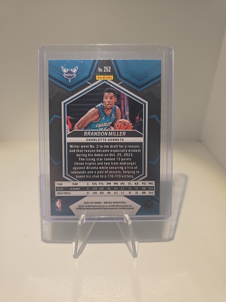 This is a Brandon Miller 2023-24 Mosaic NBA Debut Basketball Rookie trading card featuring card size 3½" x 2½". Manufactured by Panini, it is an original card from the set MOSAIC NBA DEBUT BASKETBALL ROOKIE #252. The card showcases Brandon Miller as a rookie player for the Charlotte Hornets in the 2023 season of the National Basketball Association (NBA).