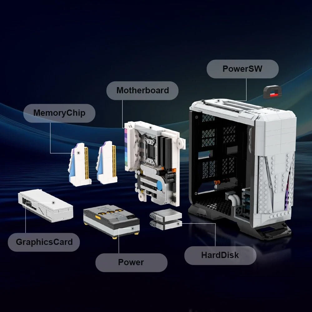 Revolutionary Design: Get ready for a groundbreaking experience with the world's first-ever building set computer case! Unleash your creativity and build your dream gaming computer case with this exceptional set. Through a dynamic collaboration, this unique computer model combines innovation and excitement, offering a thrilling project for tech enthusiasts. In-Depth Hardware Assembly: Crafted for enthusiasts, this set allows you to assemble a graphics card, power supply unit, dual SSD hard drive docking station, motherboard, and two DDR RAM modules. Each component is meticulously designed for seamless integration, providing you with the true essence of a real PC case – with the added satisfaction of disassembly and reassembly. Elevate Your Space: Craft a captivating PC desktop computer case display with our innovative building kit, measuring 21.7cm in height, 8.6cm in length, and 21cm in width. Transform your home or office decor with an exclusive lighting design that delivers mesmerizing effects, setting your space apart from the ordinary. Creative Kit, Ideal Gifting: This building block kit, born from the visionary design of creative experts, makes an ideal gift for birthdays, anniversaries, weddings, or housewarmings. Perfect for all age groups, this Idea Building Blocks Set captures the joy of creativity and the excitement of assembling an iconic piece, whether for yourself or a special someone. Perfect Block Fit: Experience the magic of optimal block alignment with our precision-engineered Building Bricks. Each block is meticulously designed for a snug yet secure fit, ensuring your creation stands the test of time. The assembly guide features crystal-clear, step-by-step instructions for an effortless construction process.