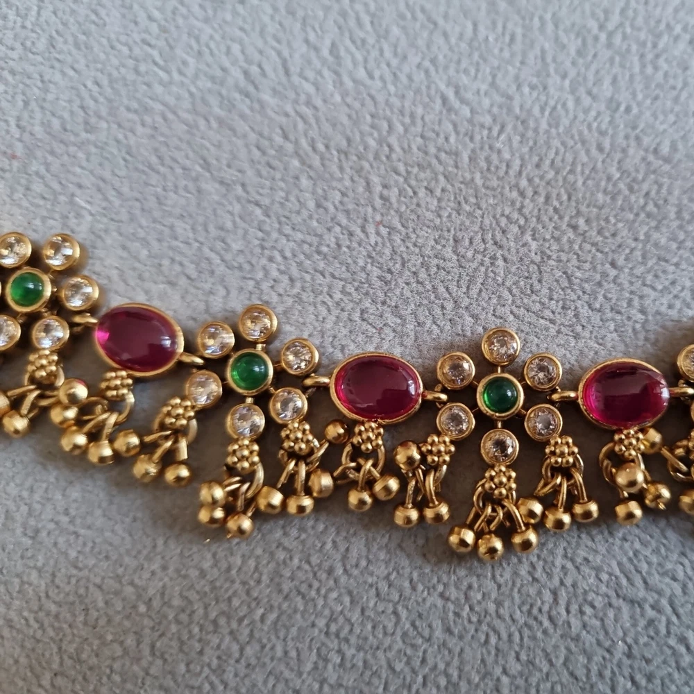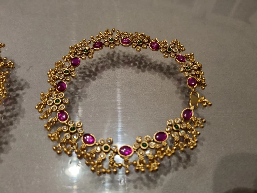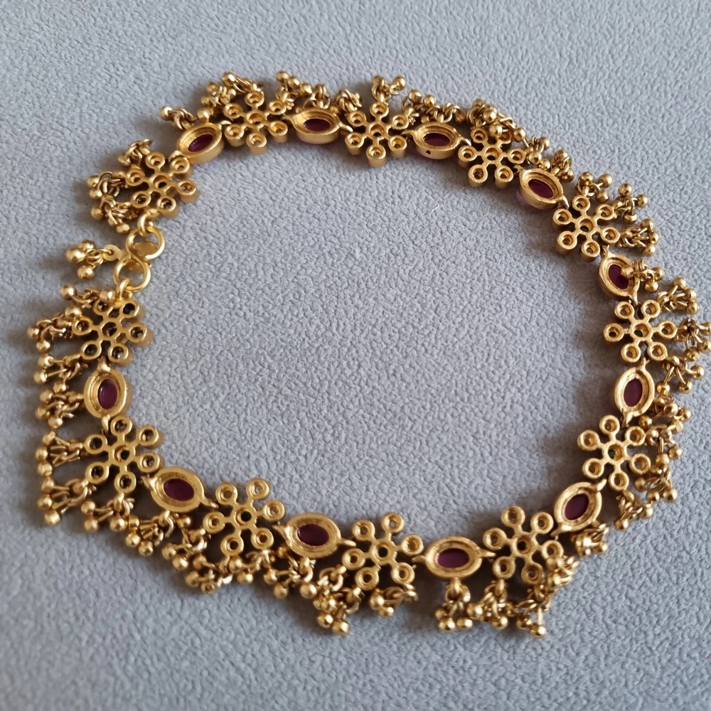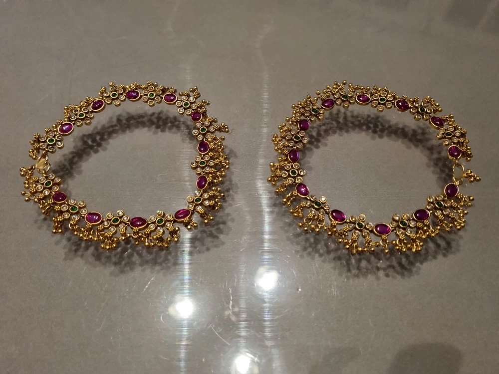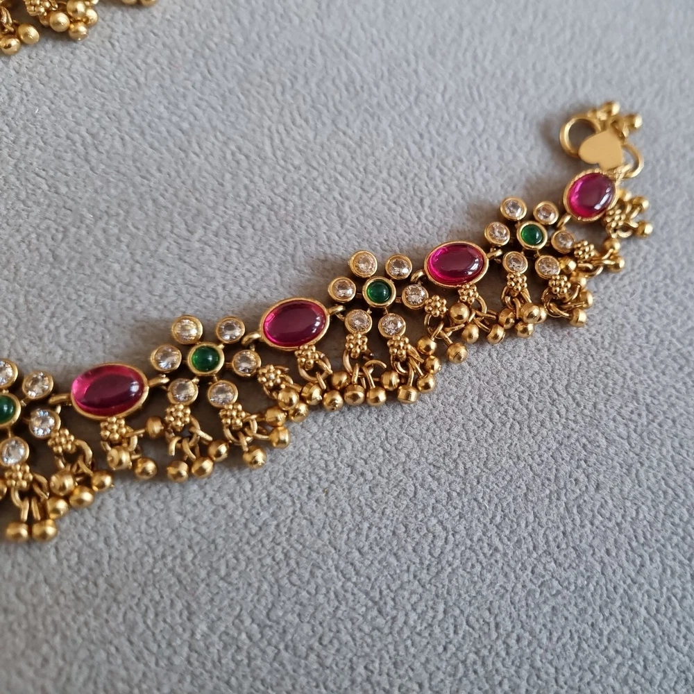 Stunning Bridal Indian Pakistani Payals (anklets), gold flowery design with gold polki droplets, very elegant. Ruby red stones, green in centre and clear. Can wear as necklace aswell . Please view my other designs. Code 26 gold flowery