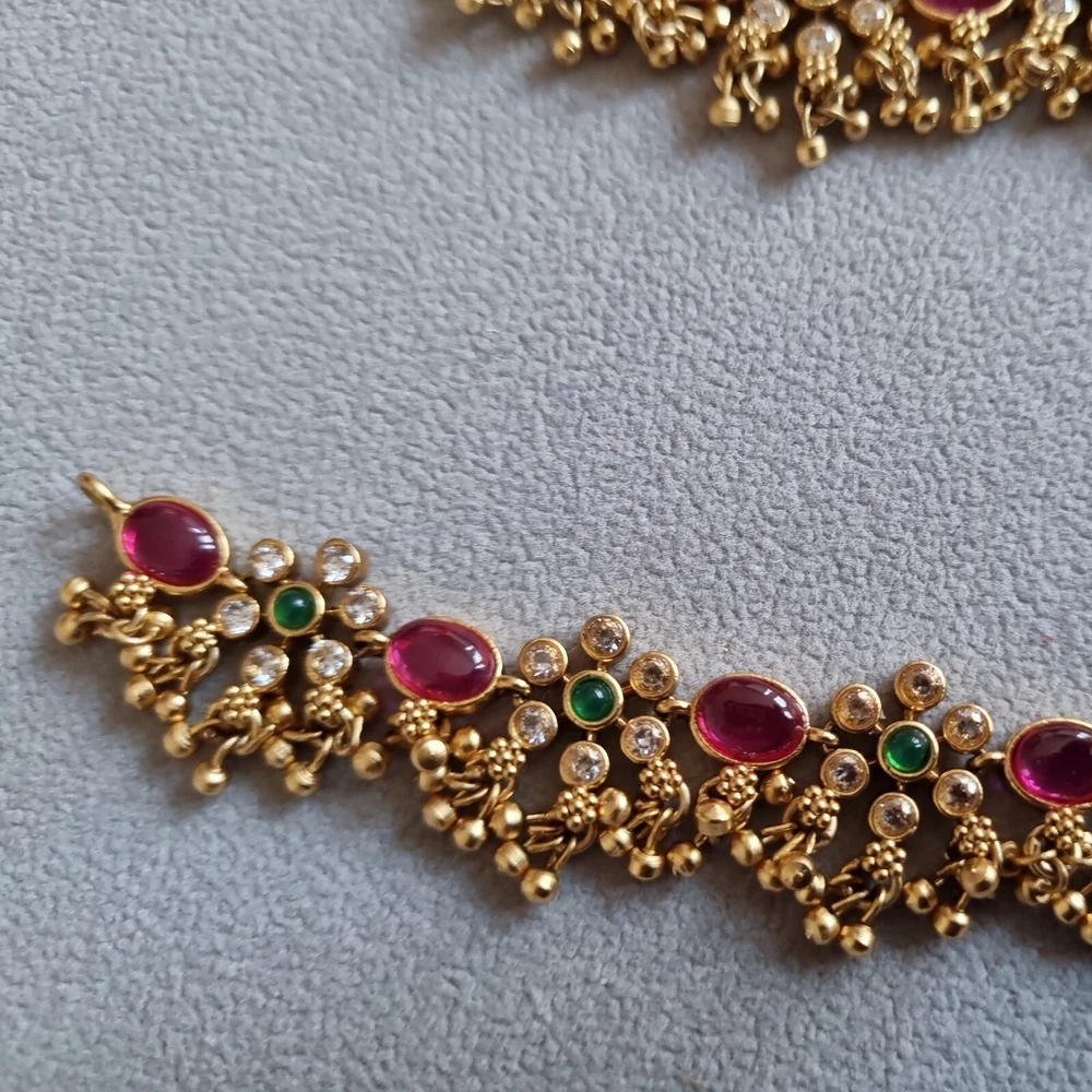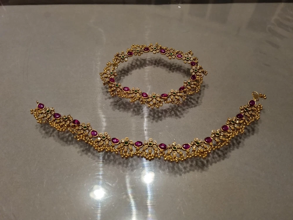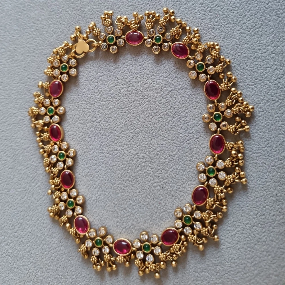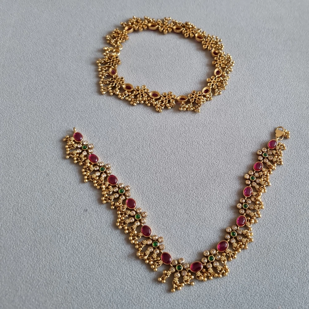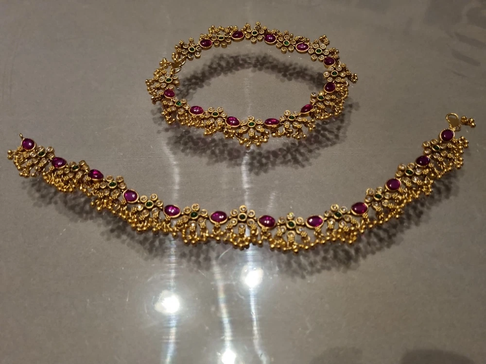 Stunning Bridal Indian Pakistani Payals (anklets), gold flowery design with gold polki droplets, very elegant. Ruby red stones, green in centre and clear. Can wear as necklace aswell . Please view my other designs. Code 26 gold flowery