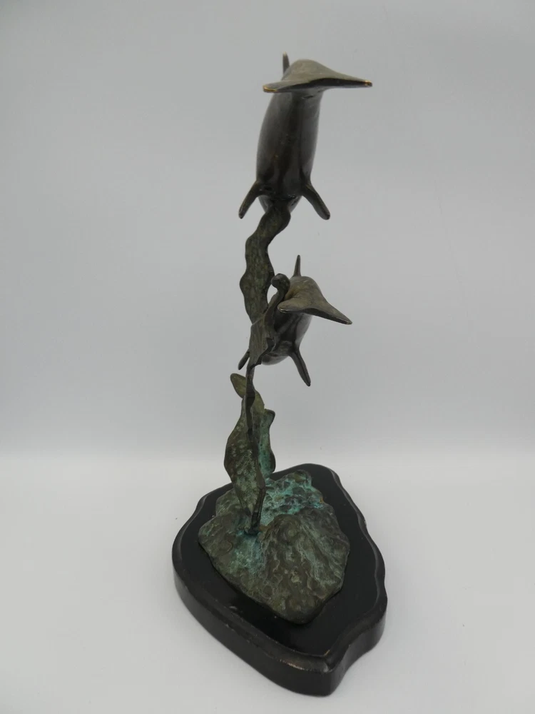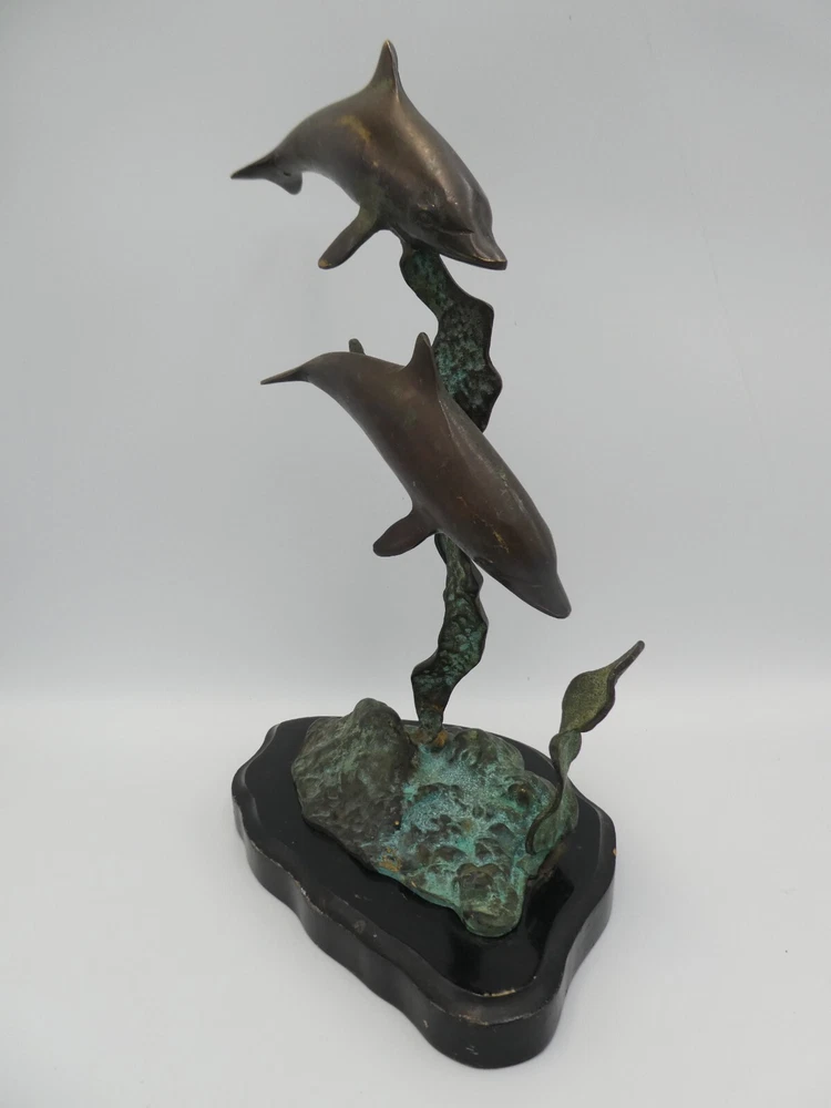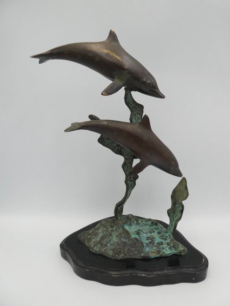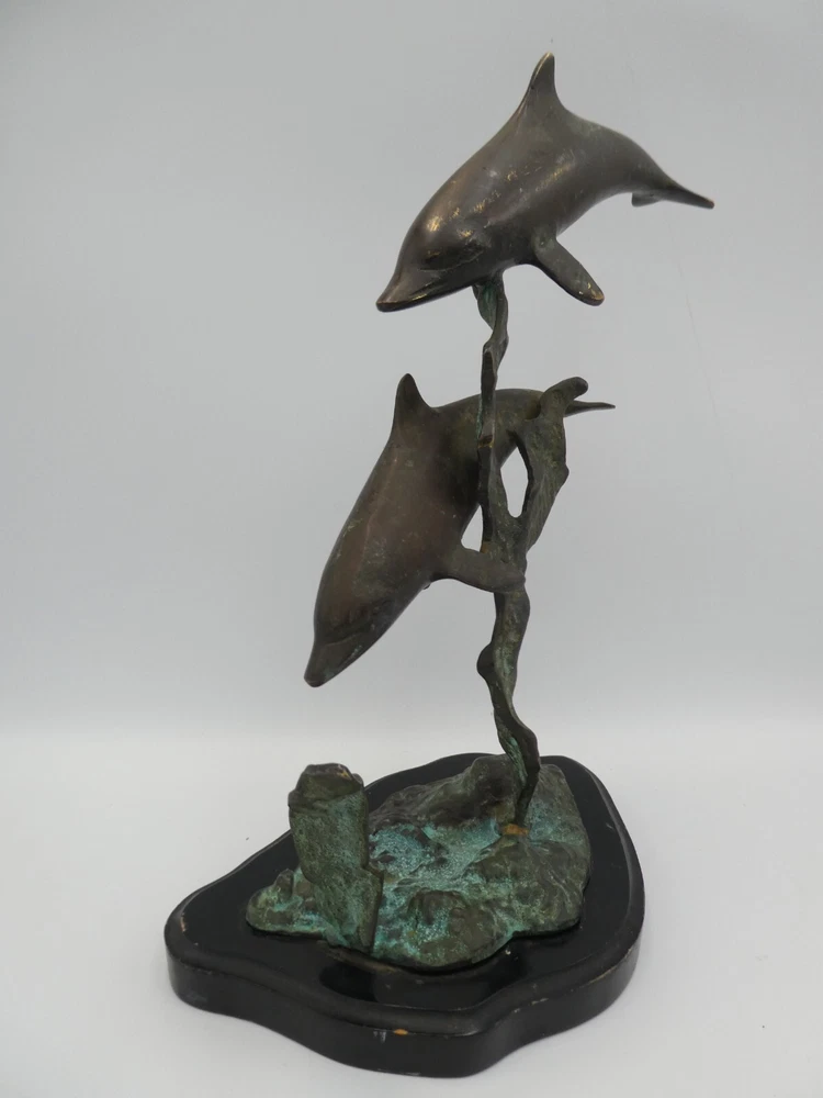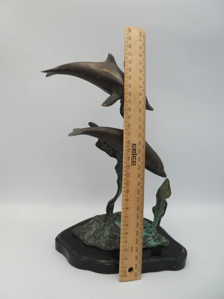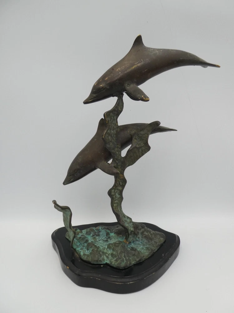 BRONZE CAST METAL STATUE - PAIR OF DOLPHINS FIGURINE - ON LACQUERED BASE DETAILED STATUE - GOOD ART STATUE FIGURINE 28 CM HIGH SEE PHOTOS FOR BEST GUIDE TO CONDITION I AM LISTING SOME OTHER ESTATE PIECES I can combine for postage. CHECK MY OTHER LISTINGS FOR MORE