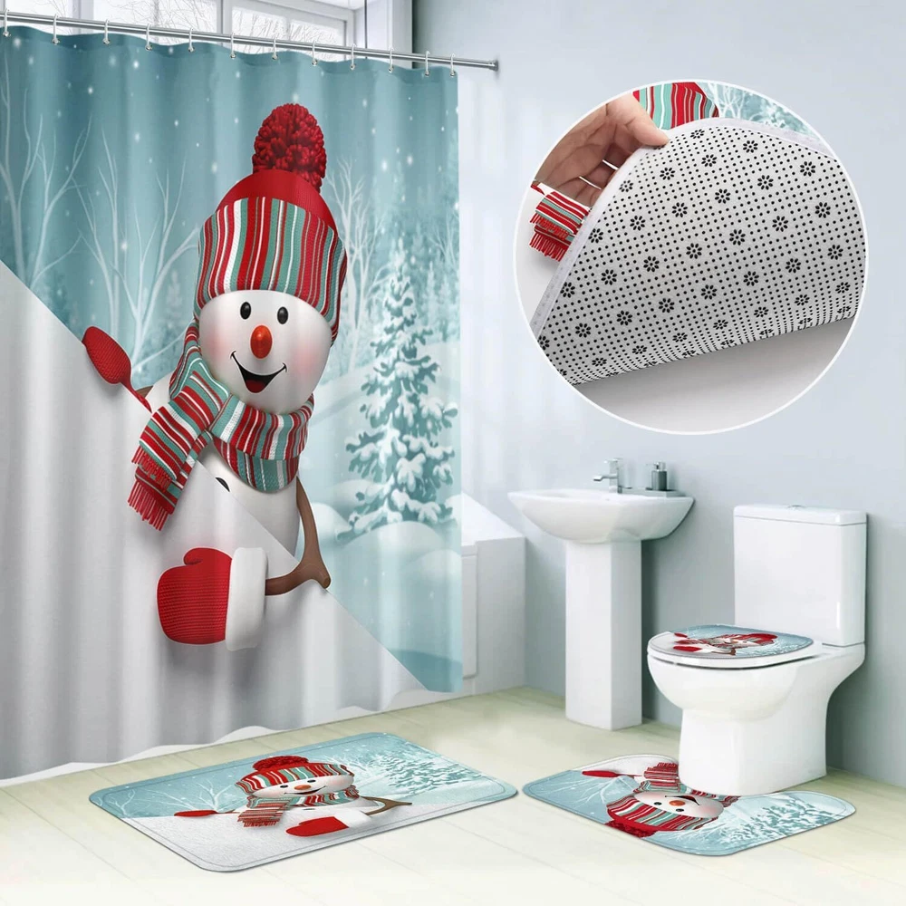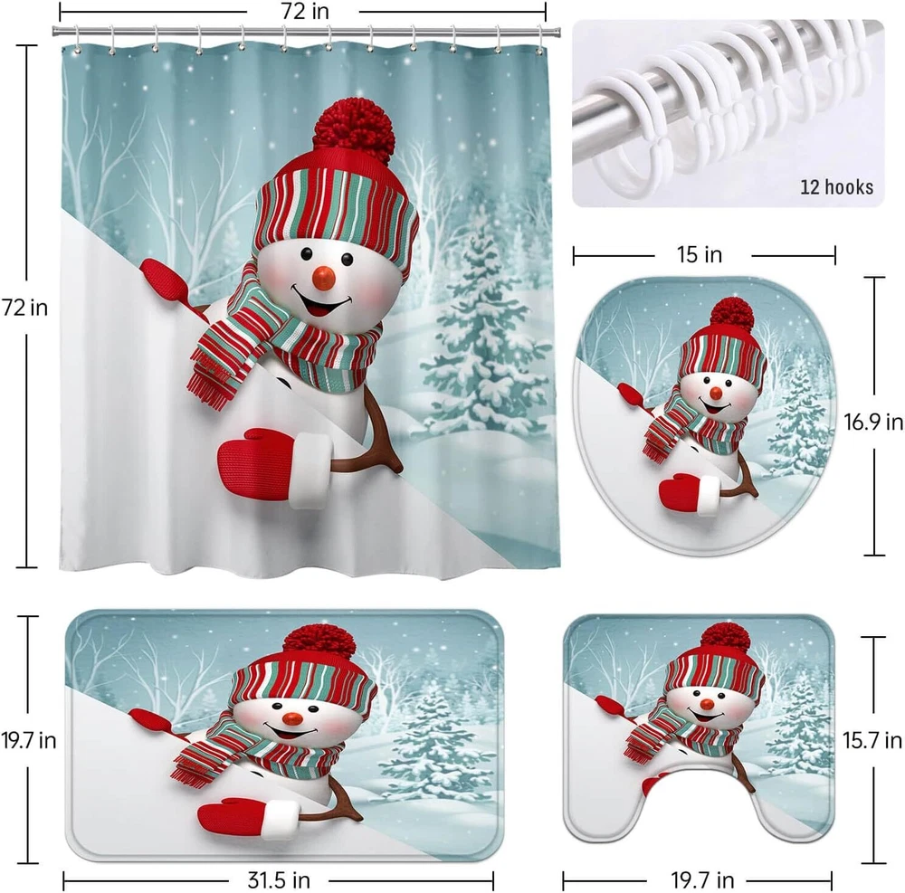 BROSHAN Christmas Shower Curtain Sets with Rugs, 71"L x 71"W| 4Pcs, Color2 Product Details Brand: BROSHAN Color: Color2 Material: fabric Product Dimensions: 71"L x 71"W Opacity: Blackout Special Feature: Waterproof, quick dry, Washable Room Type: Bathroom Style: Cute, Cartoon, Funny, Christmas Pattern: Cartoon red winter snowman Theme: Christmas,Holiday Curtain Form: Shower Curtain Top Style: Grommet Size: 71"L x 71"W| 4Pcs Included Components: Grommet Occasion: Christmas, new year, winter holiday, Cartoon Character: Christmas, winter holiday Recommended Uses For Product: Indoor Specific Uses For Product: Decorative Weave Type: Machine made Seasons: All Season Hanging Method: Grommet Item Weight: 1.9 Pounds Number of Items: 1 Product Care Instructions: Machine Wash, Do Not Bleach, Low Iron Lining Description: Unlined Package Weight: 0.86 Kilograms Water Resistance Level: Waterproof Fabric Type: Polyester Blended Unit Count: 1.0 Count Compatible with Rod Size: 1.6 Inches Model Name: BRONew-804 Manufacturer: BROSHAN Item Weight: 1.9 pounds Item model number: BRONew 【Per package Includes】our Christmas bathroom set contains 1 piece Christmas shower curtain,1pce Christmas bathroom rug,1pcs Christmas snowman bathroom mat and flannel toilet seat cover. don't bother on matching color between shower curtain and rugs, the 4 piece Christmas shower curtain set make your Christmas bathroom decor so effortless. 【 Christmas Bathroom Decor Sets】the Christmas bathroom sets with shower curtain and rugs prefectly go with any color of bathroom furnitures,funny red snowman pattern,bright and vibrant color, which makes it be must bathroom accessory for your christmas bathroom decor. 【Great Quality Christmas bathroom Shower Curtain Sets】the blue Christmas shower curtain set comes with 100% polyester fabric,watperoof and quick drying;the Christmas bathroom rugs set are made of soft flannel on surface and thicken memory foam in between, non-slip design on bottom can prevent the blue bath mat from shifting and skidding,which keep you more safe during bathing or showering. 【Widely Application】the grommets on top of snowman shower curtain is rustproof and reinforced design, easy to install at home,college dorm and apartment. 【Warm Tips】due to package in wacuum compression, there are some folded creases on Christmas bathroom shower curtain set after unpacking, please put somthing heavy on it 1-2days, these deep wrinkles will dissapear,or soak them in cold water and then dry them, don't worry on fading. 【Customer Service】Within 3 months after receiving package, if you have any questions about the shower curtain set with rugs, please tell us, we will provide you an refund or replacements without any resason.