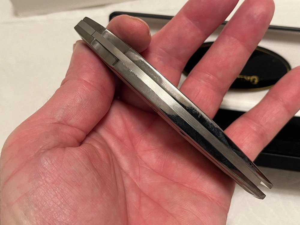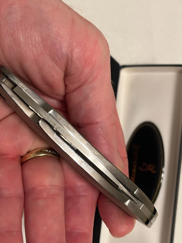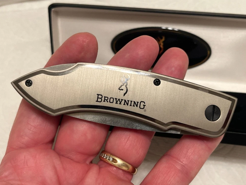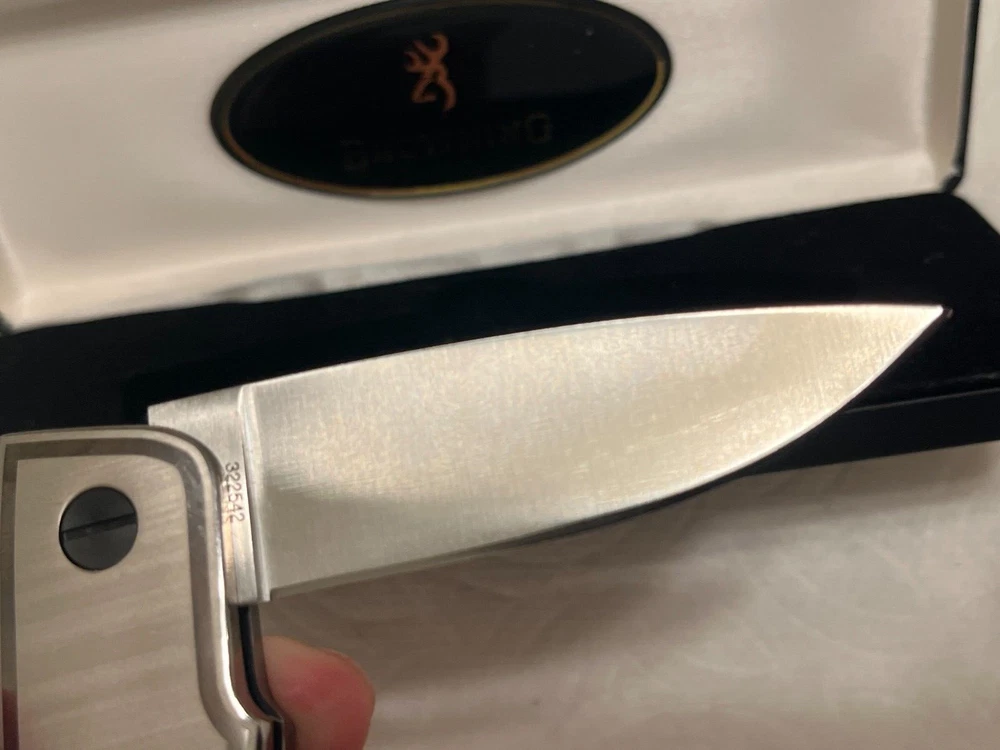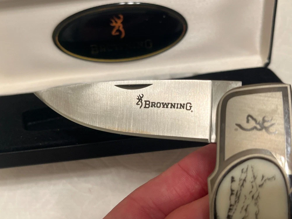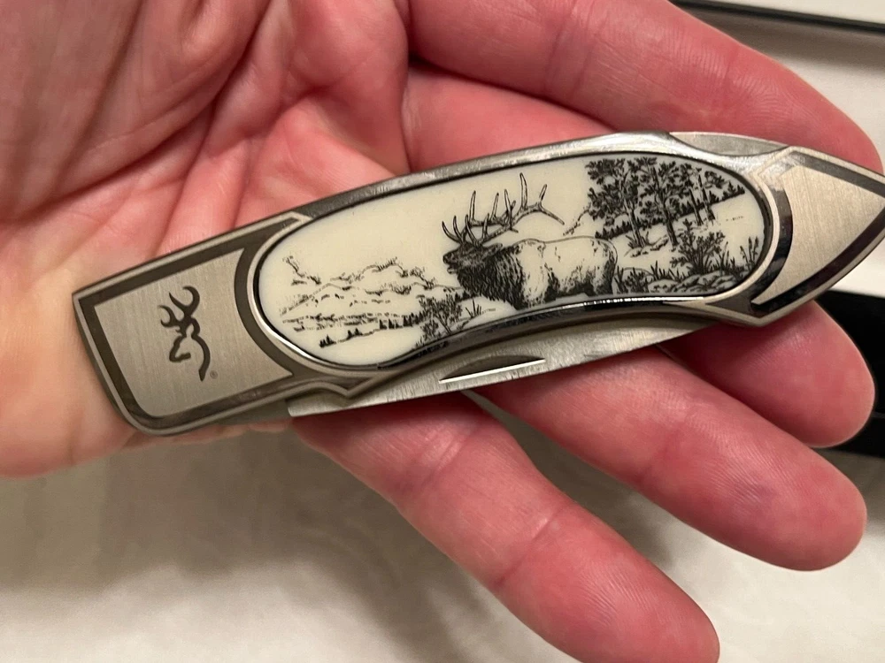 Web info for this Browning Elk Scrimshaw Folder Browning Elk Scrimshaw Lockback . 4 1/4" closed. 420 J2 stainless drop point blade. Finely polished cast zinc handles. Front handle features white smooth bone inlay with elk scrimshaw artwork. Hardshell gift box. Specifications Type - Folding lockbacks Blades - Hollow ground, satin-finished 420-J2 stainless steel, Laser-engraved Buckmark logo Handles - Finely polished zinc casting for heft and balance, Laser-engraved Buckmark logo, Adorned with scrimshaw artwork Features - Brush finished back with Browning logo Country of Origin - Taiwan UPC Code: 023614040828 Please refer to images. Glad to combine freight when possible, please message me prior to paying for an invoice with combined freight amount. Over 18 to USA shipping to legal jurisdictions only. Message any questions or for more images. Thanks for looking!