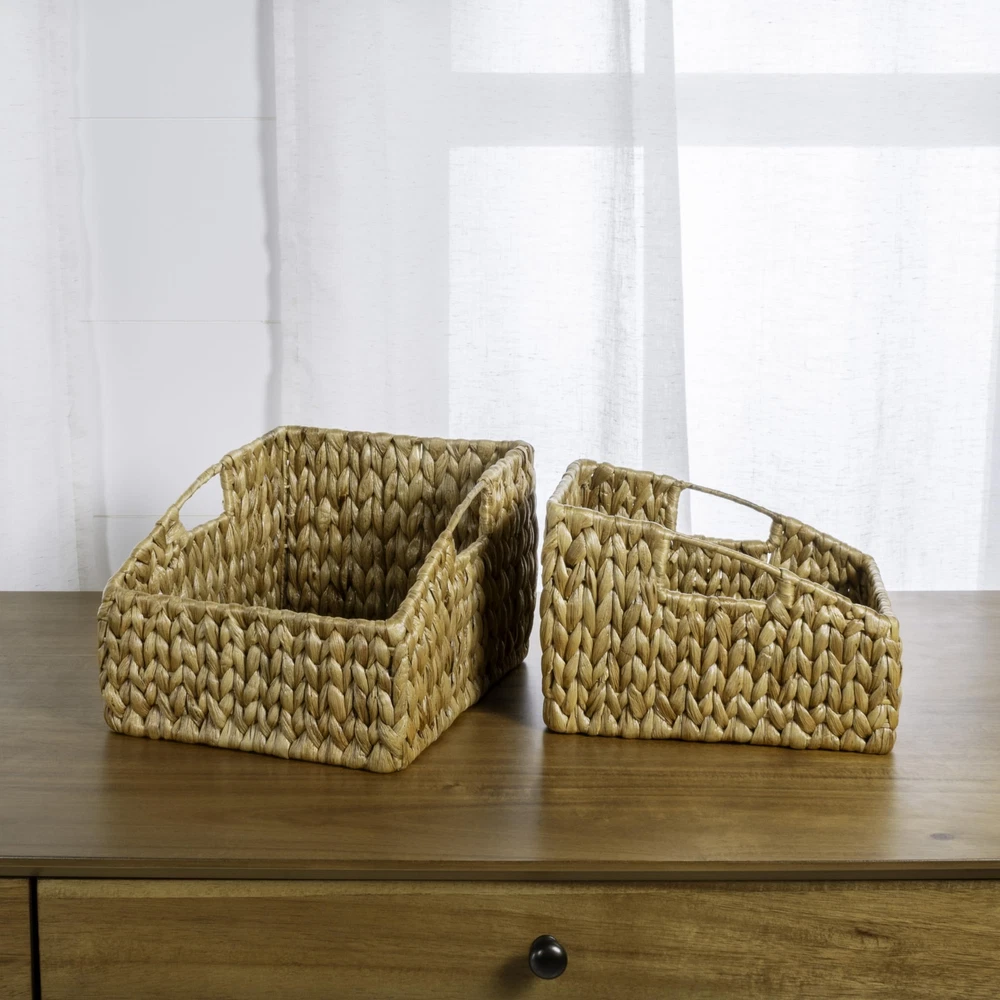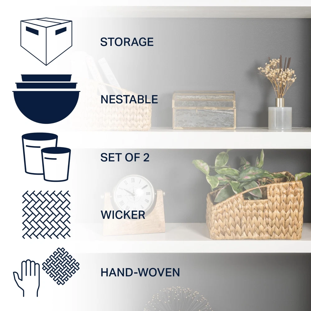 Organize your kitchen or pantry with these handwoven, easy-to-slanted baskets that stack within another. Made of an iron frame and hyacinth weaving, this storage bin adds a touch of bohemian and coastal decor to any home. When not in use, nest the baskets on each other to save space. These baskets have a beautiful natural tone from their hyacinth weaves, adding coastal style to any space; crafted by artisans, the color can be slightly different than shown baskets of various sizes with wire frames and hyacinth weaving, and built-in handles per basket The hyacinth weave on our basket pair complements any coastal or bohemian decor in your home Product Measurement: 9 "W x 11 "D x 7 "H, 7.5 "W x 9.5 "D x 6.5 "H, Do not stand or sit on unit. Wipe clean with a soft cloth dampened in water and mild soapy solution. Wipe dry with a clean, dry cloth. Keeping this unit clean and storing it properly makes it last year after year.