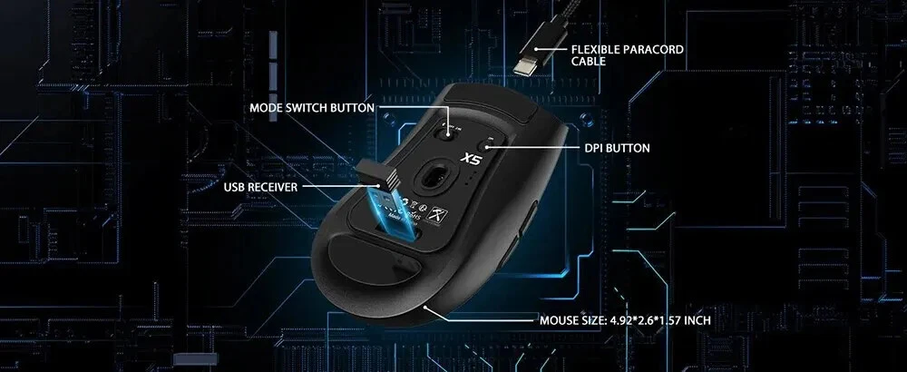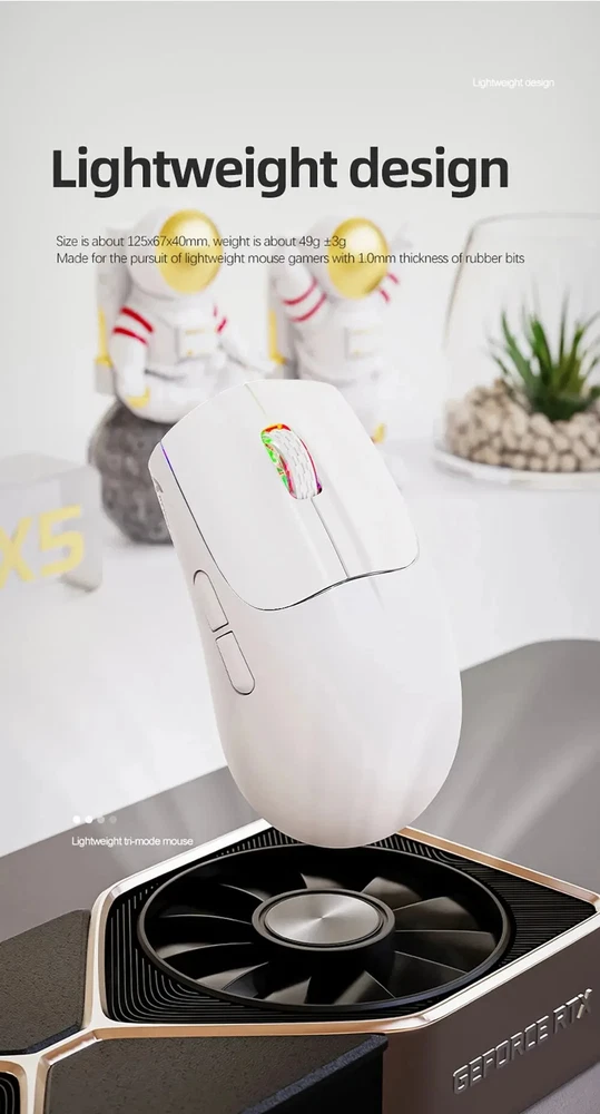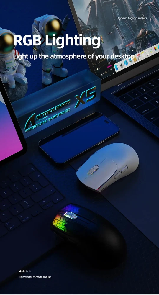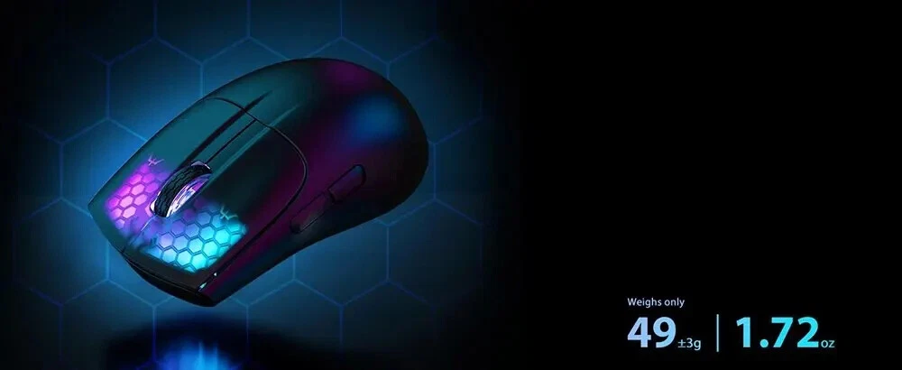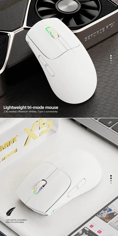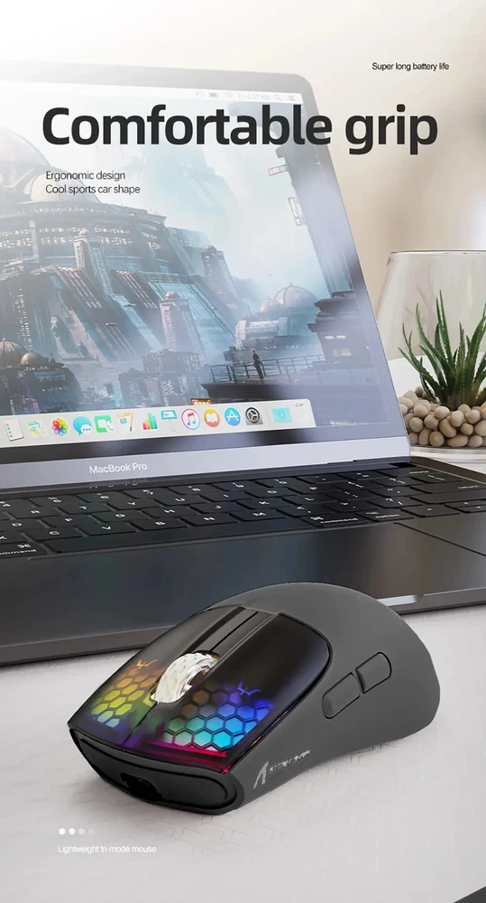 • 3 Modes for Versatile Use : The mouse comes with 3 different modes, BT/2.4Ghz/USB-C, allowing you to use it wirelessly or with a cable. • RGB Lighting for Enhanced Gaming Experience : The mouse features RGB lighting that adds a touch of style to your gaming setup and enhances your gaming experience. • Rechargeable Battery for Convenience : The mouse has a rechargeable battery, eliminating the need for frequent battery replacements and ensuring convenience. • Optical Sensor for Accurate Tracking : The mouse uses an optical sensor, providing accurate tracking of movements and ensuring precise control over your gaming or work activities. 【3 Mode Bluetooth Wireless Mouse】This gaming mouse wireless adopts advanced 2.4G wireless and Bluetooth 5.1 transmission technology and USB-C transmission. Computer mouse adopts Pixart 3212 Optical Sensor which Transmission frequency up to 2480MHz and refresh rate up to 4000FPS.compatible with your PC/Laptop/Macbook/Mobile Phones. 【Lightweight 49±3g RGB Honeycomb Design】The wired mouse is made of high quality Lightweight ABS material and designed with ergonomic shape, reduce the weight and make the mouse more flexible and easier to be used for a long time without fatigue. 【Breathing RGB Rainbow Backlight】The ATTACK SHARK mouse wireless has beautiful led rainbow backlit which is honeycomb shape on the right keys and left keys.You never expect the backlight of a mouse to be set up like this, it's incredible. You will definitely be attracted by this design. 【5 DPI Adjustable & Battery Rechargeable】This rechargeable gaming mouse can be adjusted within 5 levels dpi (4000-2400-1600-1200-800) by pressing the DPI button;Built-in 300Mah lithium battery,with USB-C charging cable, Low battery indicator will remind you to charge it with flashing red light.it also supported recharged while charging, not afraid of power off in gaming. 【Wide Compability Gaming Mouse】This Black gaming mouse is equipped with high quality switch,can be clicked up to 4 million times, can be used for PC, Mac Notebook, Laptop,Tablet, desktop, Computer, Cell Phone and other device, and support Windows 7/8/10/XP//VISTA/MAC OS/Android/ios, etc, The USB interface is plug and play Notice: 1. Please charge the product before first use 2. Please do not disassemble the product without permission 3. Do not use fast charging charger to charge the product