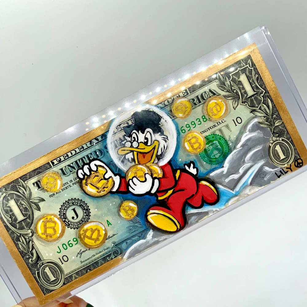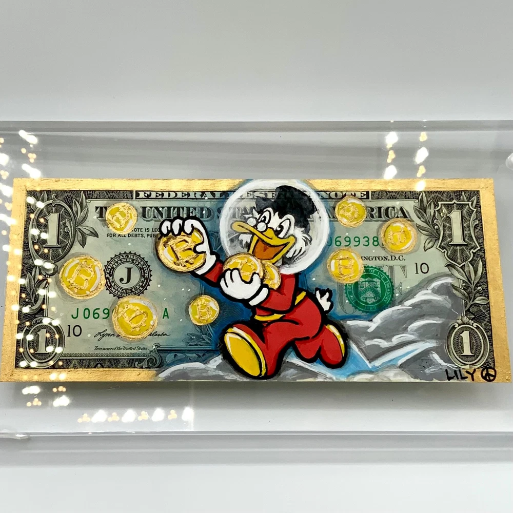Uncle Scrooge in “To the Moon” A blend between traditional currency and the digital age, symbolizing the merging of worlds—where the familiar is transformed, and new forms of currency begin to float into our consciousness.💸 Go to the moon with Uncle Scrooge and some bitcoins. Hand-painted acrylic and gold lustre on Authentic American Currency. Signed and packaged with care - comes in a 7” x 3” plastic protective sleeve. Just a girl creating money art groovier than your 90s lava lamp. Sparking imagination and challenging perceptions. xxLily @lilmoneyart #Cryptoforlife #CryptoArt #CryptocurrencyArt #CryptototheMoon