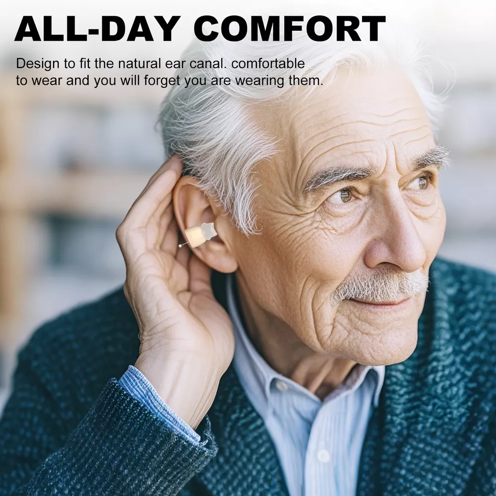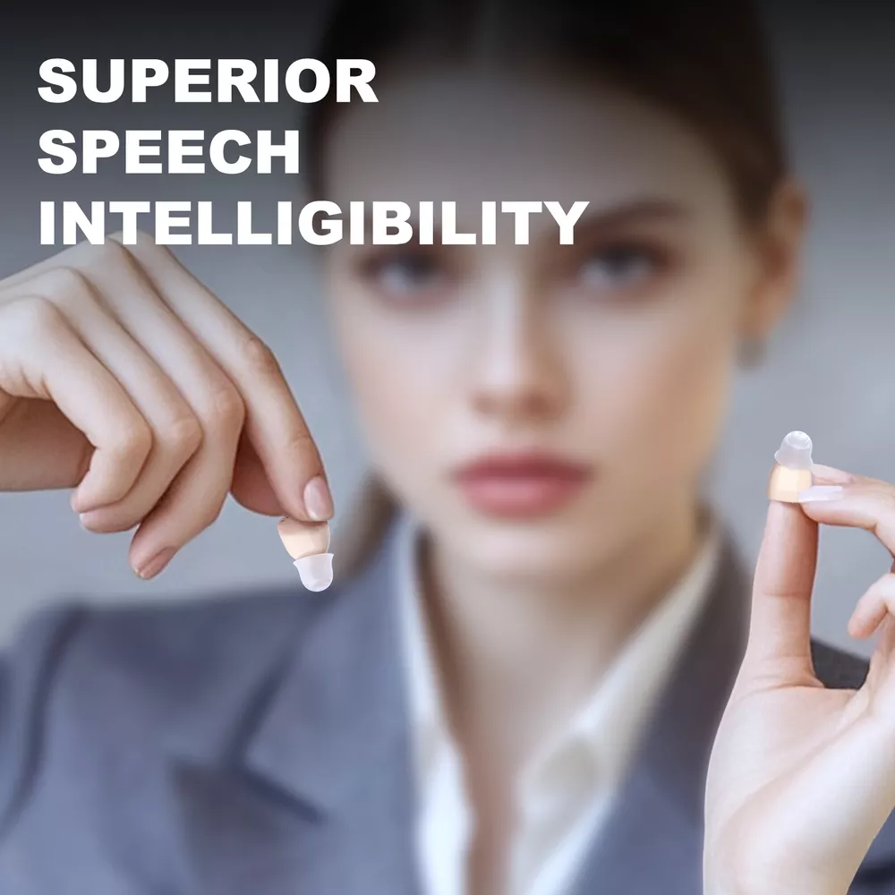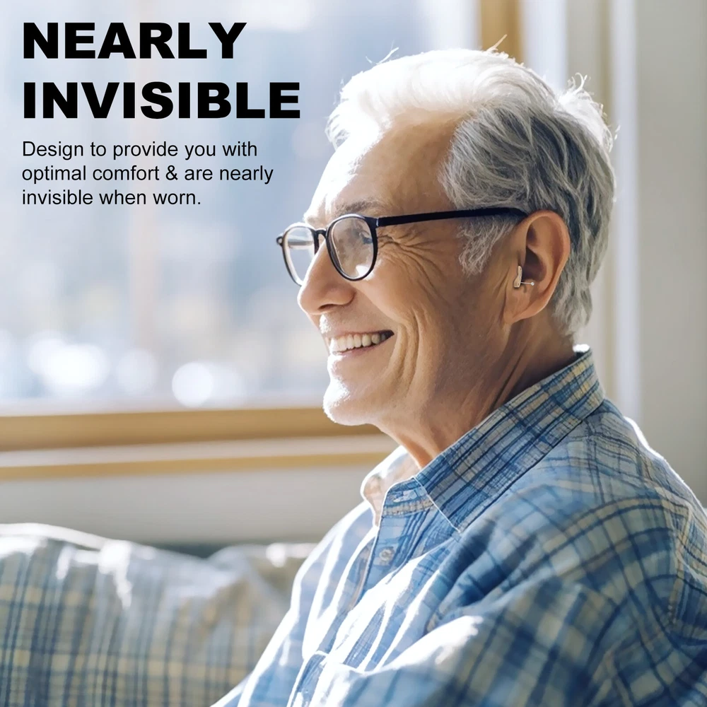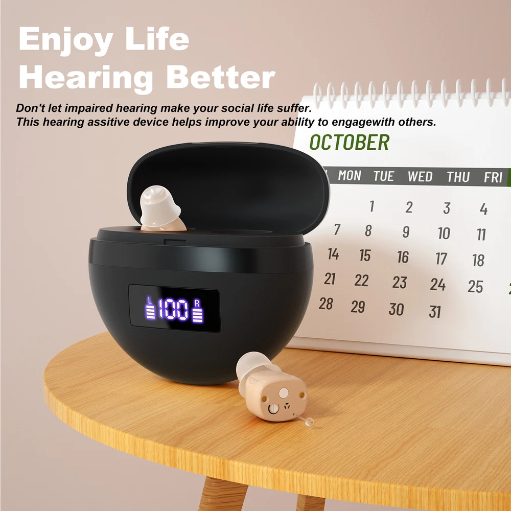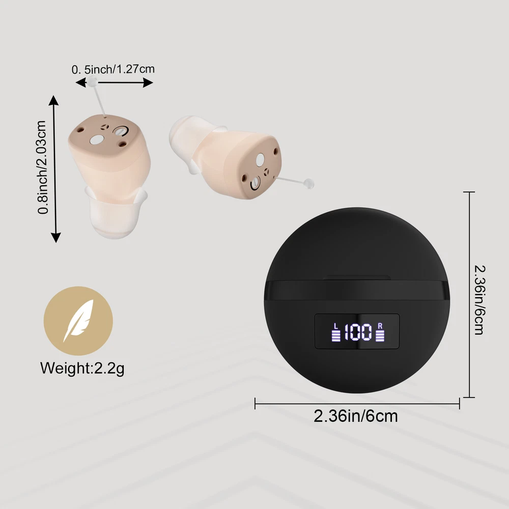 Easy Operation:Taken from the charging case, the device will power on automatically.The hearing aids controls allow you to control volume.You can choose the volume that suits you best for a good listening experience.It is perfect gifts for family members with hearing loss. Noise reduction and background suppression:The smart chip in the hearing aids is equipped with advanced noise reduction technology, effectively reducing background noise interference and enhancing speech clarity and audibility. This is particularly helpful in noisy environments for listening to conversations or participating in social activities. Nearly Invisible:The hearing aids are designed to provide you with optimal comfort & are nearly invisible when worn. Advanced technology is packed in a form that maximizes sound quality & comfort so you can wear them all day. Power Display Charging Case:It only takes 3 hours for a full charge. Then you will get 20 hours working time of the hearing aids and 100 hours backup power in charging case, which allow you to charge hearing aids for 5 times. Hearing Aid and Noise Reduction:This hearing aid is suitable for people with mild to moderate hearing loss. The hearing aid can be used in different scenarios, it can assist you in making phone calls, watching TV and talking to people. The hearing aid uses more advanced technology to amplify speech while reducing background noise, making it easier for you to hear in noisy environments. Packing Lists Hearing Aids*2, Charging Box*1 Charging Cable*1 Earplugs*6 Cleaning Brush*2 Screwdriver*1 Manual*1 Why do my hearing aids whistle ? Normally, Wearing our hearing aid in error result in the disturbing whistling or squeaking noise coming from device is caused by called feedback. We recommend that few simple steps as followed to reduce or eliminate noise: The first, Please choose the appropriate ear domes according to the size of the ear canal and Make sure the "ear domes" fit snugly in your ear . If your hearing aid ’ s ear domes does not fit in your ear properly, sound will leak out and back into the device ’ s microphone, causing the whistle sound. The Second, Please clean your device with our brush every time . Our ears produce wax naturally to trap and expel foreign substances, but when you have wax build-up in your ears and insert your hearing aids on top of the wax, the sound coming out of the amplifier will be blocked and returned to the microphone, causing a squeal. The Third, Adjust Volume Settings, Avoid setting the volume too high. High volume settings can sometimes cause echoes, t ry reducing the volume gradually. The Last , Please store your device in clean Case, If the hearing aid ’ s microphone is covered with wax or debris, it will make a noise. What to do if your hearing aids don't charge properly? 1. Check the hearing aids is correctly putted into the charging case. 2.Make sure the charging case has enough power