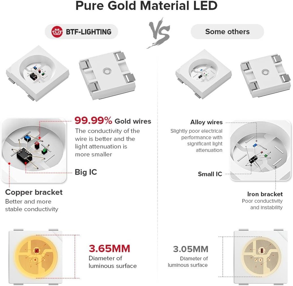 BTF-LIGHTING WS2812B IC RGB 5050SMD Pure Gold 16.4FT 300LED, Black Pcb Ip30 Product Details Color: Black Pcb Ip30 Brand: BTF-LIGHTING Indoor/Outdoor Usage: Indoor Special Feature: Color Changing,Dimmable,Support Lots of Controllers,Programmable,Cuttable,Long Life Light Source Type: LED Power Source: Corded Electric Light Color: Multicolor Theme: Music Occasion: Christmas, Wedding Style: Modern Material: FPCB Controller Type: Voice Control Connectivity Protocol: Wi-Fi Number of Light Sources: 300 Voltage: 5 Volts Wattage: 45.00 Included Components: 3 PIN male connector Item Weight: 0.05 Kilograms Number of Items: 1 Item dimensions L x W x H: 4.72 x 3.94 x 0.59 inches Control Method: App Number of Batteries: 20 A batteries required. Manufacturer: BTF-LIGHTING Technology Co., Limited Part Number: WS2812B5M30LB30 Item Weight: 1.76 ounces Product Dimensions: 4.72 x 3.94 x 0.59 inches Country of Origin: China Item model number: WS2812B5M60LB30 Batteries: 20 A batteries required. Is Discontinued By Manufacturer: No Area Lighting Classification: IP30 Assembled Height: 1.5 centimeters Assembled Length: 12 centimeters Assembled Width: 10 centimeters Shape: LED Strip Specific Uses: Indoor use only Special Features: Color Changing,Dimmable,Support Lots of Controllers,Programmable,Cuttable,Long Life Shade Material: Metal+PCB+Plastic Light Direction: DC5V Power Supply+Controller Switch Style: Controller Batteries Included?: No Batteries Required?: No Wattage: 90 Watts Is Discontinued By Manufacturer : No Product Dimensions : 4.72 x 3.94 x 0.59 inches; 1.76 ounces Item model number : WS2812B5M60LB30 Batteries : 20 A batteries required. Manufacturer : BTF-LIGHTING Technology Co., Limited Country of Origin : China Color: Black Pcb Ip30 Brand: BTF-LIGHTING Indoor/Outdoor Usage: Indoor Special Feature: Color Changing,Dimmable,Support Lots of Controllers,Programmable,Cuttable,Long Life Light Source Type: LED Power Source: Corded Electric Light Color: Multicolor Theme: Music Occasion: Christmas, Wedding Style: Modern High-quality LED Chip. Instead of others' alloy chip wire or copper chip wire, This WS2812B RGB LED use Pure Gold Wires inner, which more stable, have exceptional quality, ultra bright, less light decay and longer life. Easy Using. It comes with 3pin JST-SM connectors on both ends for easy installation and separated power/ground wires on both ends. Each LED is cuttable. You can shorten, lengthen or bend it freely if you want.Can be connected in series or parallel. Amazing DIY Play. The addressable IC chip is built-in the 5050SMD. Each pixel can have its own color and brightness as your wish. Compatible with WLED, K-1000C, Rasp Pi, UNO R3, ESP8266, ESP32 etc Programmable Controllers. Support RB3+SP630E, SP611E, SP608E, SP602E etc Bluetooth music Controllers, SP530E ,WT-SPI,SP511E etc smart 2.4GHz Wi-Fi Alexa music controllers. Only Support DC5V. Match use controller can appear colorful curtain-up/ flow water/raindrop/jump flash and so on hundreds of lighting effect, you can also edit animation effect by Coreldraw/Flash/LedEdit software. Power adapter and controller need to be purchased separately. Widely Application. Making led screen, led wall, advertising board, apply to hotel, KTV, bars, advertising signs, Festivel Christmas or wedding party decoration. There is adhesive tape on IP30/IP65 LED strip's back, so you can stick it to the wall or other items conveniently as you like. IP67 is available with fixing clips and screws.