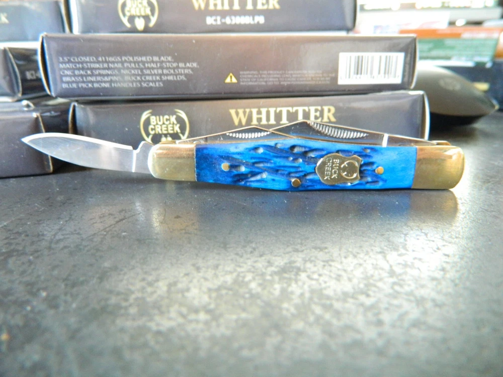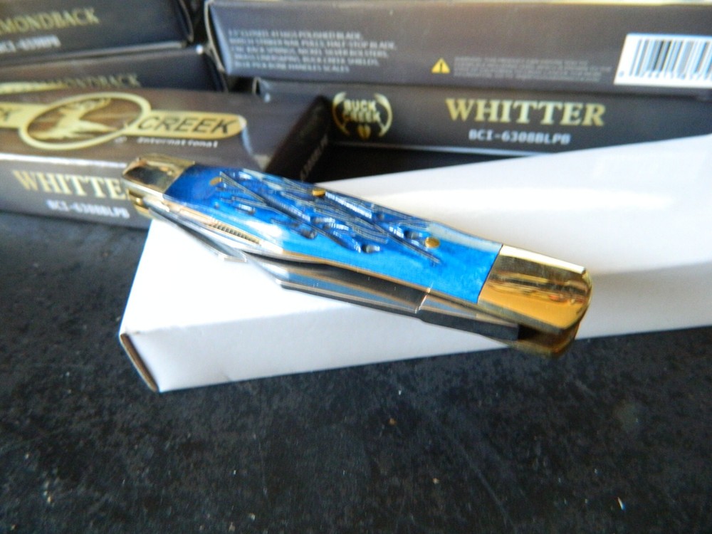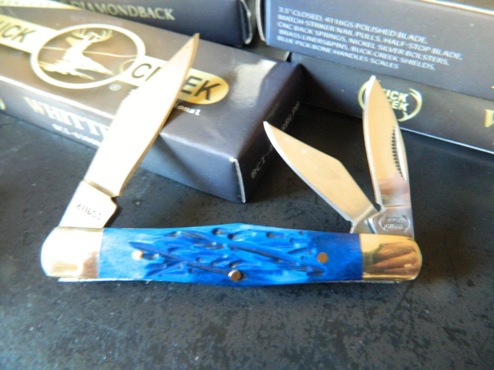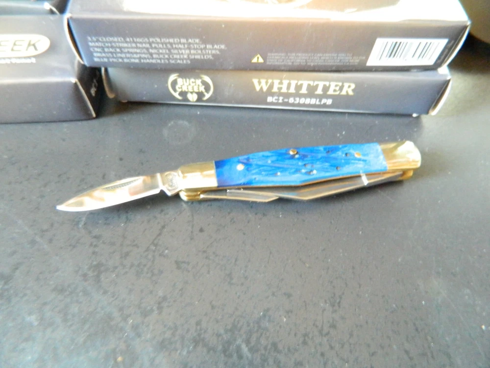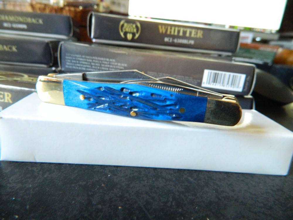 WE HAVE (6) WHITTLER 3 1/2" DARK BLUE JIGGED BONE HANDLES, some say it looks like a Coke Bottle design call it what you like. One thing that sticks out to me is it has two Clip Point Blades and one Spear Point or Pen, the large clip point is 2 1/2" with a 2 1/4" edge the small one 1 1/2" with 1 1/4" edge, and the Spear Point is the same 1 1/2" 1 1/4" This is the Limited Edition part of this knife along with the handle design both sides of the handle come to a point. Most Whittlers only have one side of the handle pointed, the bottom. BUCK CREEK CUTLERY of SOLINGEN GERMANY, LIMITED EDITION 3 1/2" CLOSED WHITTLER DESIGN POCKET KNIFE WITH A BLUE PICK BONE HANDLE, almost all companies have stopped making this design it's too costly and hard to get the Bone right. But the smaller companies like BUCK CREEK have the time and money to do this and do it right, they put two Clip Point style Blades and a Pen or Spear point blade on this handle made of 440HC Stainless steel (Rc) 56 to 58 hardness, Nickel Silver Bolsters, and Brass Pins and Liners. And the Back Springs are slammers so please be careful, and they put their Logo on an brass shield embed in the bone. Model # BC 6308BLPB Weighs 2.2oz. Buck Creek is in Solingen Germany, 39 years now in FEB. these are collectors grade knives We will give you $$$$$$$$$$$$$$$$$$$$$$ FREE SHIPPING $$$$$$$$$$$$$$$$$$$ WE THANK YOU AND GOD BLESS YOU. by adding my eBay Store to your Favorites, . - Sign up and receive our emails, why SALES that is the only email we will ever send to you. We are always trying to get different knives into your hands, so by saving you some money maybe you will try out a new brand. Plus every listing we have is put on sale from the highest to the lowest priced items, and lastly many times we put knives that there are only 1 or 2 left in our stock by receiving our email you will get first shot at these items, Thank you Greg