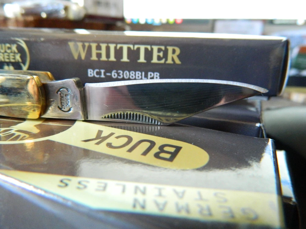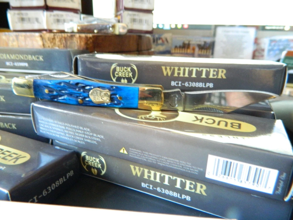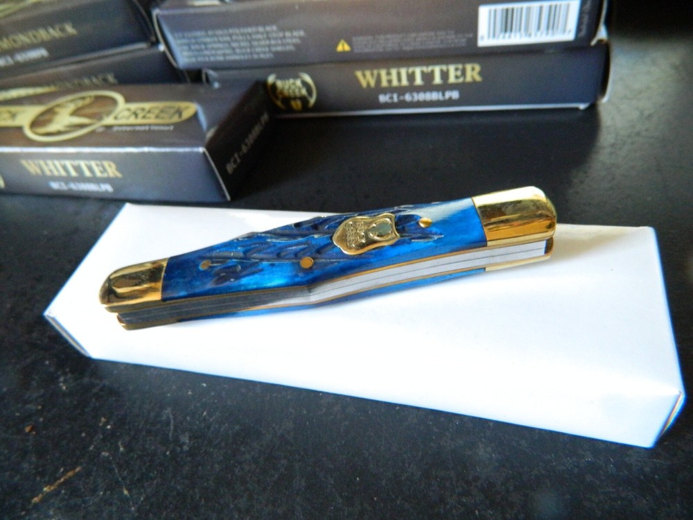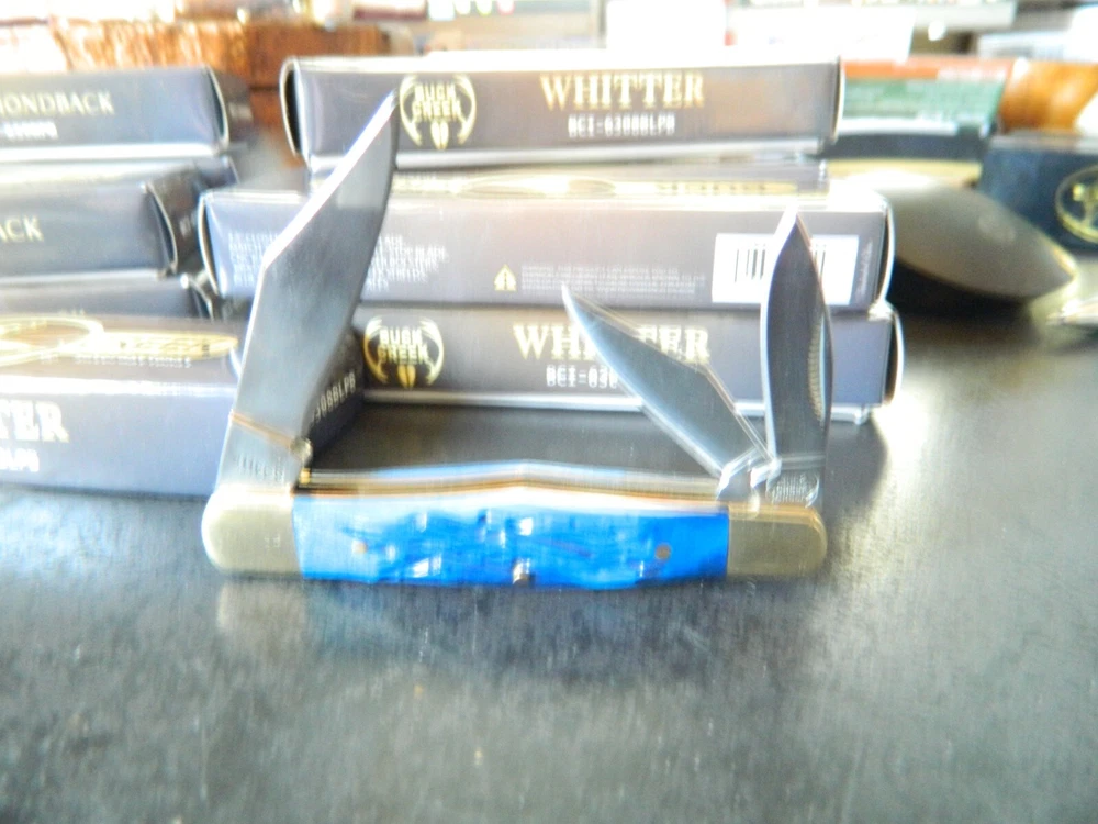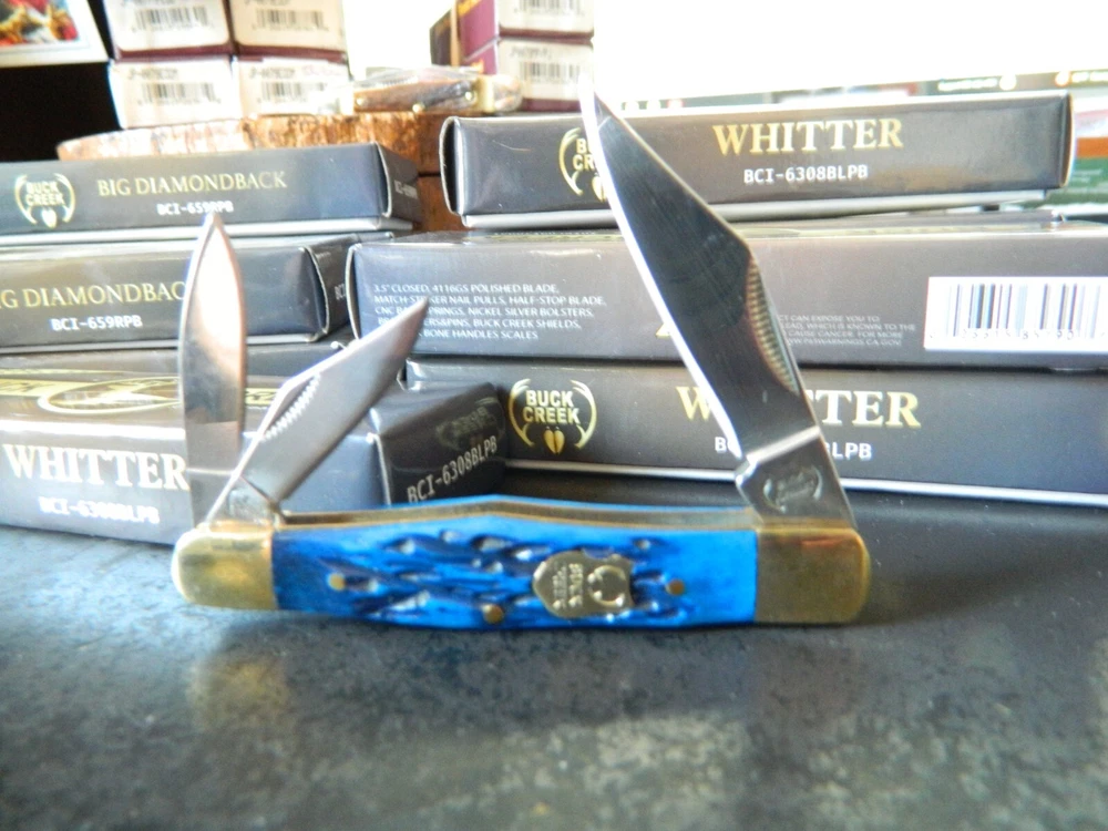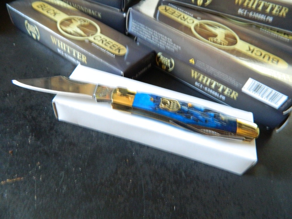 WE HAVE (6) WHITTLER 3 1/2" DARK BLUE JIGGED BONE HANDLES, some say it looks like a Coke Bottle design call it what you like. One thing that sticks out to me is it has two Clip Point Blades and one Spear Point or Pen, the large clip point is 2 1/2" with a 2 1/4" edge the small one 1 1/2" with 1 1/4" edge, and the Spear Point is the same 1 1/2" 1 1/4" This is the Limited Edition part of this knife along with the handle design both sides of the handle come to a point. Most Whittlers only have one side of the handle pointed, the bottom. BUCK CREEK CUTLERY of SOLINGEN GERMANY, LIMITED EDITION 3 1/2" CLOSED WHITTLER DESIGN POCKET KNIFE WITH A BLUE PICK BONE HANDLE, almost all companies have stopped making this design it's too costly and hard to get the Bone right. But the smaller companies like BUCK CREEK have the time and money to do this and do it right, they put two Clip Point style Blades and a Pen or Spear point blade on this handle made of 440HC Stainless steel (Rc) 56 to 58 hardness, Nickel Silver Bolsters, and Brass Pins and Liners. And the Back Springs are slammers so please be careful, and they put their Logo on an brass shield embed in the bone. Model # BC 6308BLPB Weighs 2.2oz. Buck Creek is in Solingen Germany, 39 years now in FEB. these are collectors grade knives We will give you $$$$$$$$$$$$$$$$$$$$$$ FREE SHIPPING $$$$$$$$$$$$$$$$$$$ WE THANK YOU AND GOD BLESS YOU. by adding my eBay Store to your Favorites, . - Sign up and receive our emails, why SALES that is the only email we will ever send to you. We are always trying to get different knives into your hands, so by saving you some money maybe you will try out a new brand. Plus every listing we have is put on sale from the highest to the lowest priced items, and lastly many times we put knives that there are only 1 or 2 left in our stock by receiving our email you will get first shot at these items, Thank you Greg