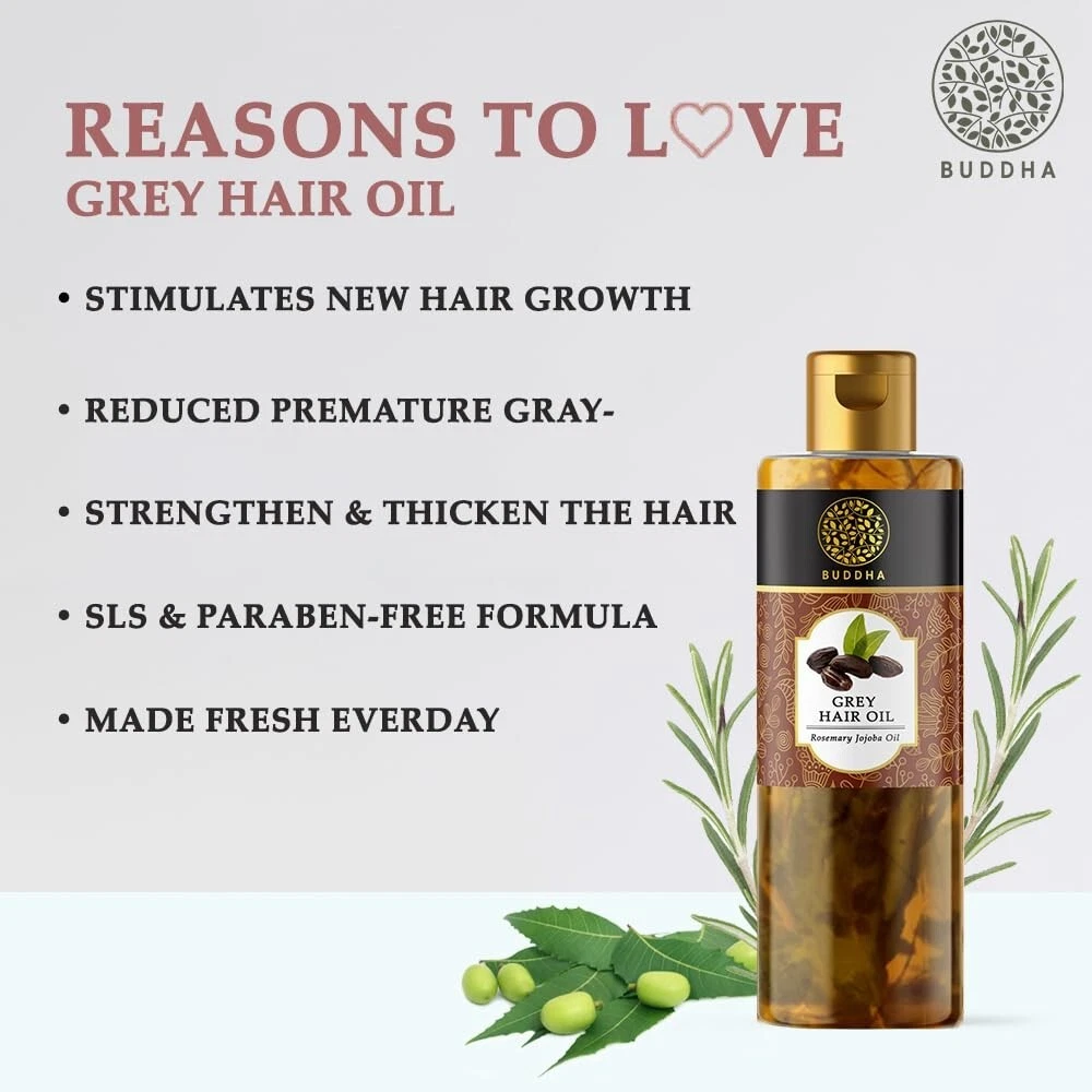 Important information Safety Information: Product is all-Natural and Safe to Use Ingredients: olive oil, almond oil, jojoba oil, castor oil, Brahmi oil, amla oil, neem oil, and rosemary oil. Directions: One can also apply 45 minutes before a head wash. Massage repeating 4 sides - center to side on your head followed by 2 upward side. Massage well till the oil is fully absorbed into the scalp and hair. It is the best ayurvedic oil for dandruff. From the brand Previous page BUDDHA NATURAL Buddha Naturals is a luxury authentic beauty care brand with foundations in Ayurveda. Being a pioneer since 1994, Buddha Naturals has become the epitome of Natural Beauty that combines ancient Ayurvedic practices with Modern Science suiting a more holistic and aesthetic approach to self-care with sensorial experience and pleasure in usage. New Launch Next page Product Description BUDDHA NATURAL Grey Oil - Restores Natural Hair Color Buddha Natural, a trusted name for over 25 years, is your beacon of authenticity in providing natural and effective products. With a rich legacy of serving mindful wellness, our commitment to genuine, time-tested formulations remains unwavering, Embrace the authenticity of Buddha Natural. Why You Should Choose Us 100 % Natural Ingredients We harness the power of plants as a part of our commitment to using naturally effective and sustainably sourced herbs to offer specific benefits. 100 % Ayurvedic Our products are 100 % natural and inspired by Ayurveda recipes by the ministry of AYUSH. We conform to the highest quality of control levels. Clean Green Ethical Brand An award-winning brand that is proudly known for being clean, green and ethical though its Anti Carbon and plastic-neutral initiatives. Made In India Our ingredients are sourced from beautiful locations all around the country, where they are known to be in their most natural and effective form. Goodness of Grey Oil Helps to Reduce Greys Buddha Natural Oils are premium and authentic. Regularly massaging the oil into your scalp will help reduce greys and will nourish your scalp. Restores Natural Hair Color Buddha Natural Grey Oil is very effective for reducing greys and in enhancing hair wellness. It includes natural ingredients that helps to nourish both the scalp and hair roots. Why You Should Buy