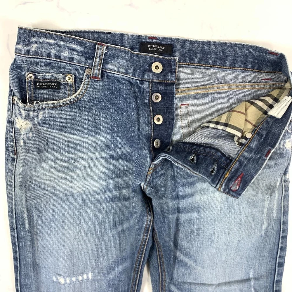Style: Denim Size: 76 Garment Care: NA Closure: Button Product Line: NA Inseam: 27.9 in Rise: 9 in Size Type: Regular Department: Men Waist Size: 32.2 in Theme: NA Model: NA Pattern: Check Features: Pockets Handmade: No Leg Style: Straight Personalize: No gtin13: Does not apply Color: Blue Season: Fall, Spring, Winter MPN: NA Accents: Button Brand: Burberry Pocket Type: NA Fit: Slim Material: Cotton Occasion: Business, Casual, Travel Fabric Type: Denim Type: Pants Vintage: No UPC: Does not apply